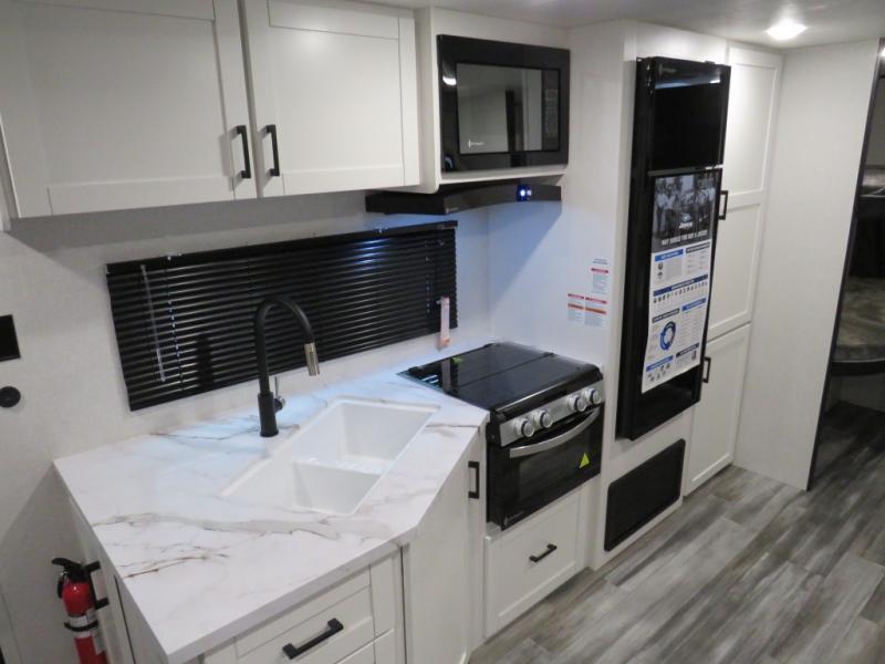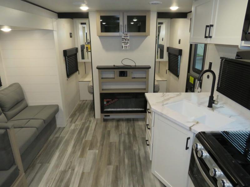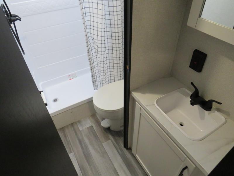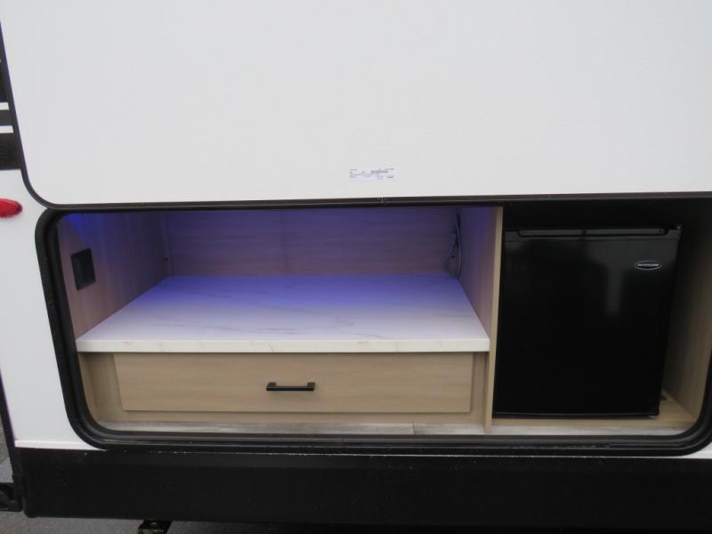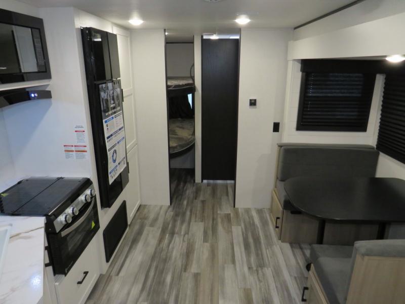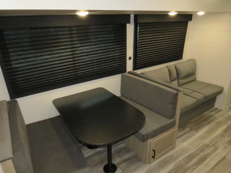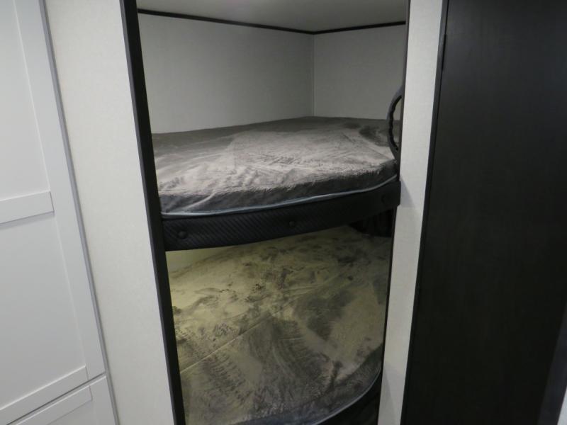 You can comfortably sleep up to ten people in this trailer thanks to the double-size bunks in back, the RV queen bed in the front bedroom, plus the booth dinette and jack-knife sofa in the main living area! The chef of your crew will have a three burner cooktop and microwave oven to prepare meals, and everyone can store their favorite drinks in the 8 cu. ft. 12V refrigerator inside, or in the outdoor refrigerator for convenience. The rear corner bathroom includes a tub/shower and a toilet, with the sink just outside of this room so others can brush their teeth if one is taking a shower before bed. The outside storage is accessible on both sides of the unit and will easily allow you bring along camp chairs, yard games and more. A 16' powered awning with LED lights will create a nice place to gather in the evenings with family and friends!