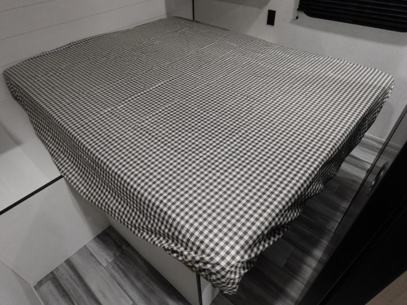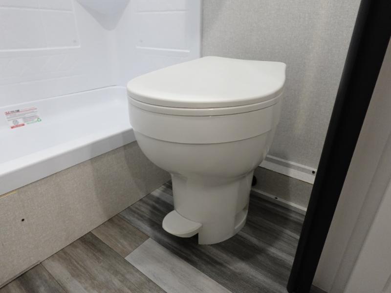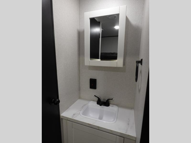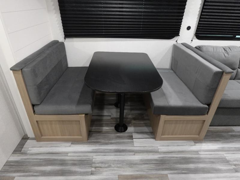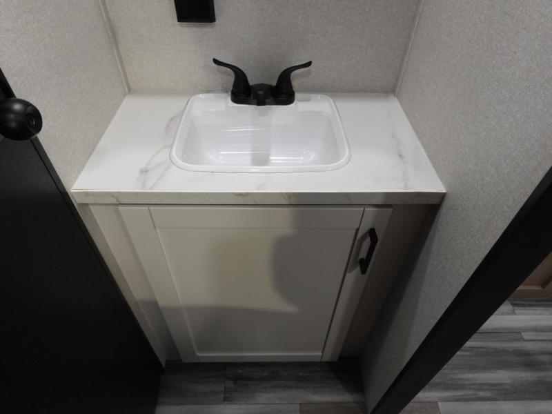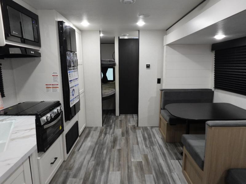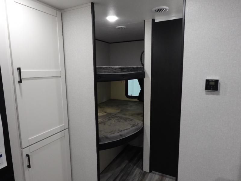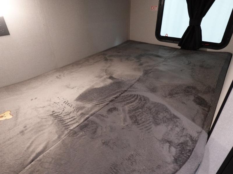 You can comfortably sleep up to ten people in this trailer thanks to the double-size bunks in back, the RV queen bed in the front bedroom, plus the booth dinette and jack-knife sofa in the main living area! The chef of your crew will have a three burner cooktop and microwave oven to prepare meals, and everyone can store their favorite drinks in the 8 cu. ft. 12V refrigerator inside, or in the outdoor refrigerator for convenience. The rear corner bathroom includes a tub/shower and a toilet, with the sink just outside of this room so others can brush their teeth if one is taking a shower before bed. The outside storage is accessible on both sides of the unit and will easily allow you bring along camp chairs, yard games and more. A 16' powered awning with LED lights will create a nice place to gather in the evenings with family and friends!
