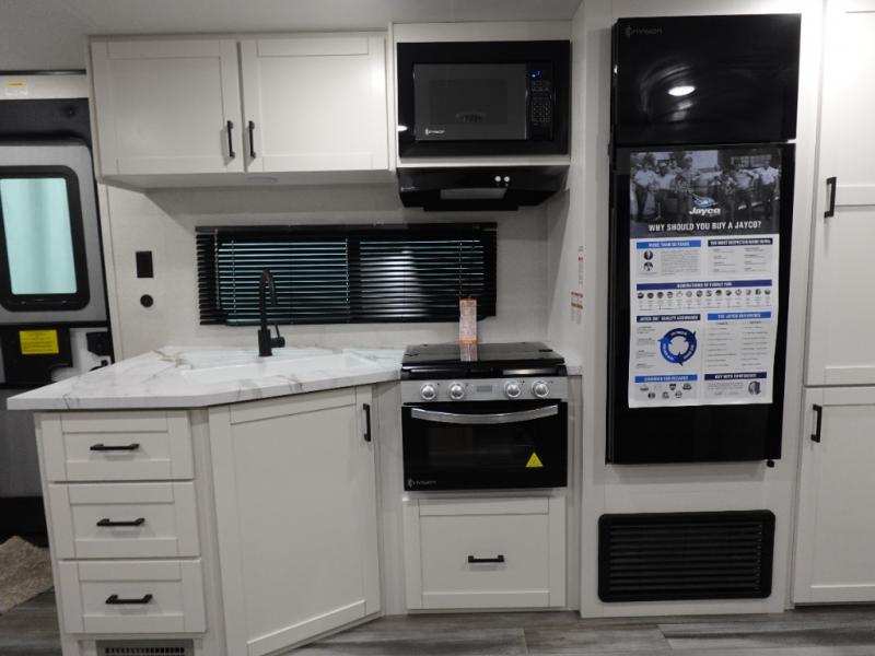 The Jayco Jay Flight SLX travel trailer is quite easy to own because it is lightweight for an easier towing experience. Built on a fully integrated A-frame with galvanized-steel, impact-resistant wheel wells, the Jay Flight SLX has quality at its very foundation. That quality continues on to the electric self-adjusting brakes, easy-lube hubs, Magnum Truss roof system, and LP quick connect. Some of what the mandatory Customer Value Package includes is backup camera prep, Keyed-Alike entry and baggage doors, marine grade exterior speakers, and an on-demand tankless water heater.