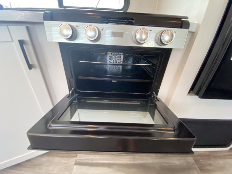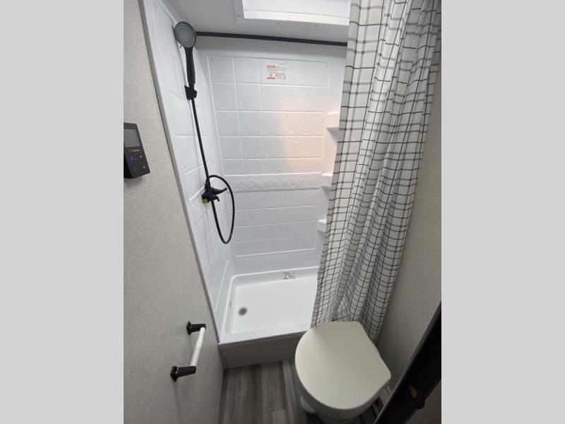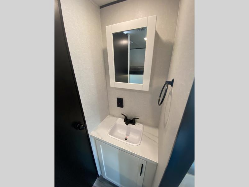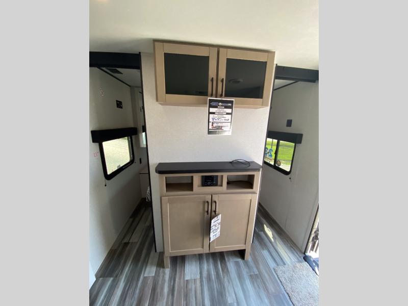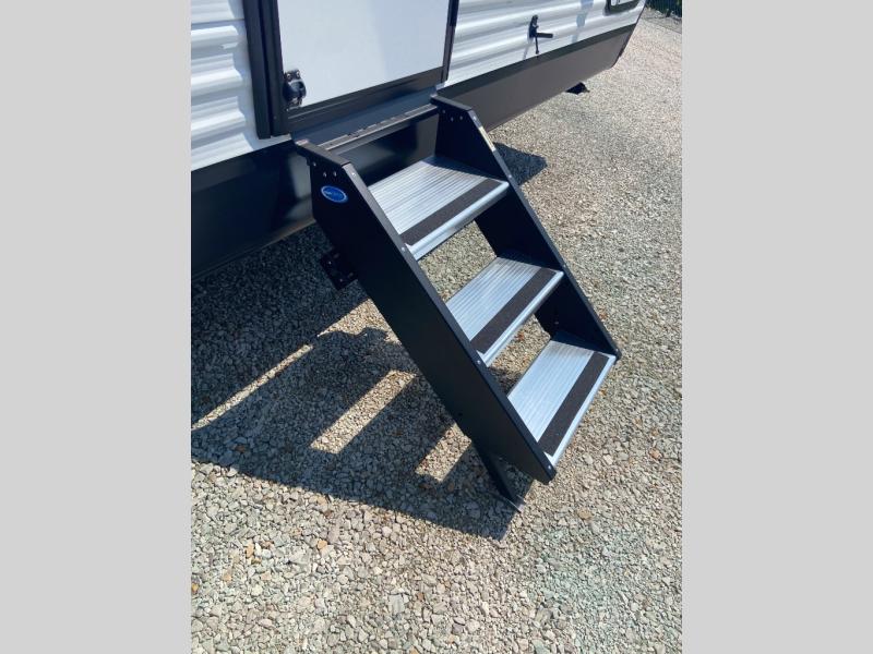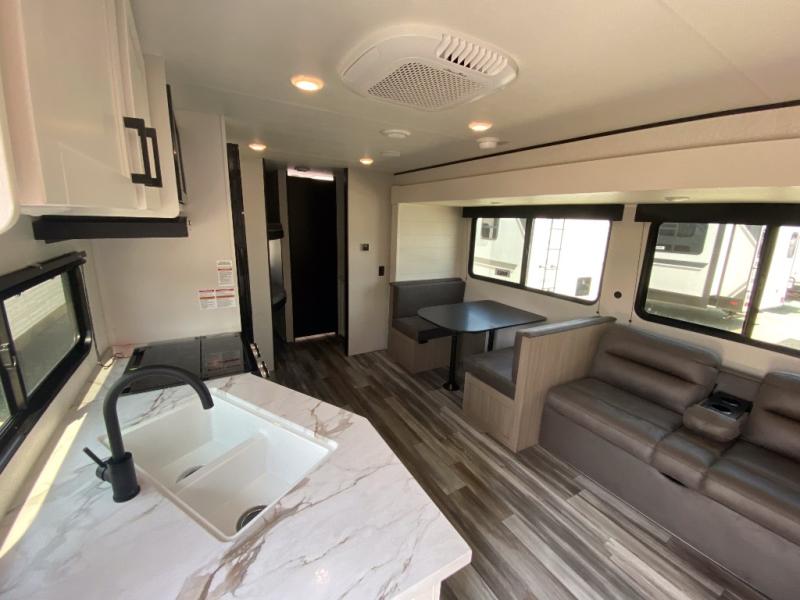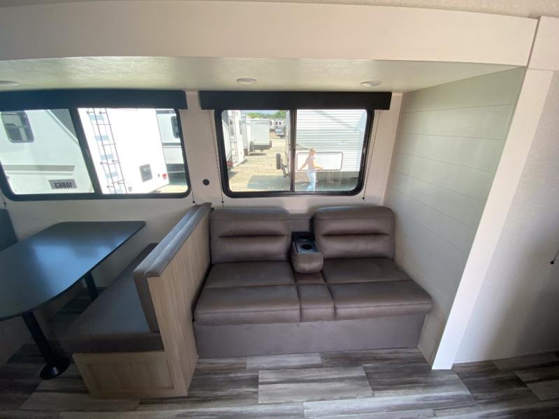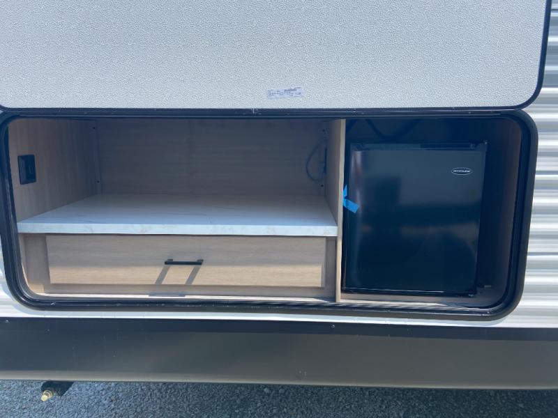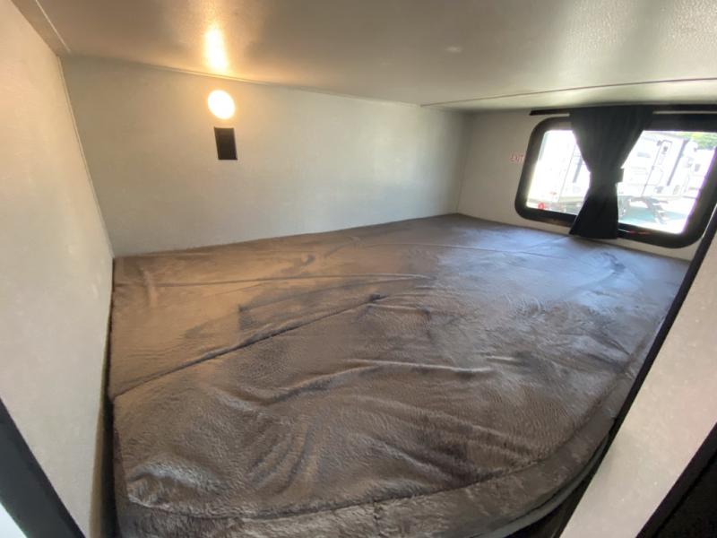 You can comfortably sleep up to ten people in this trailer thanks to the double-size bunks in back, the RV queen bed in the front bedroom, plus the booth dinette and jack-knife sofa in the main living area! The chef of your crew will have a three burner cooktop and microwave oven to prepare meals, and everyone can store their favorite drinks in the 8 cu. ft. 12V refrigerator inside, or in the outdoor refrigerator for convenience. The rear corner bathroom includes a tub/shower and a toilet, with the sink just outside of this room so others can brush their teeth if one is taking a shower before bed. The outside storage is accessible on both sides of the unit and will easily allow you bring along camp chairs, yard games and more. A 16' powered awning with LED lights will create a nice place to gather in the evenings with family and friends!