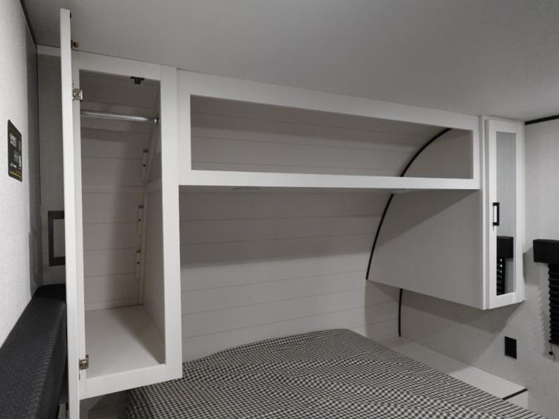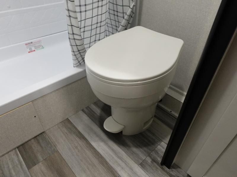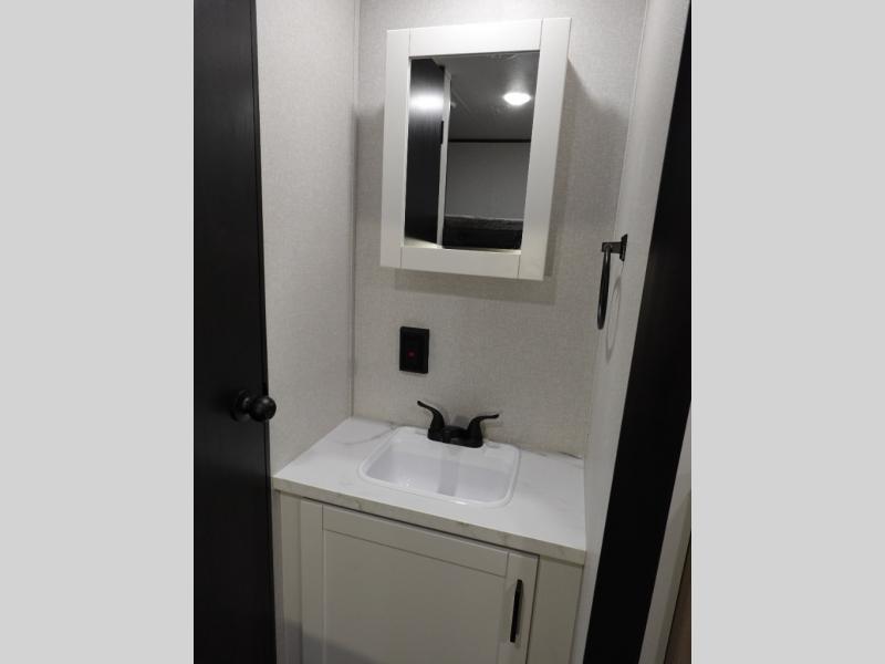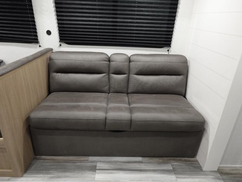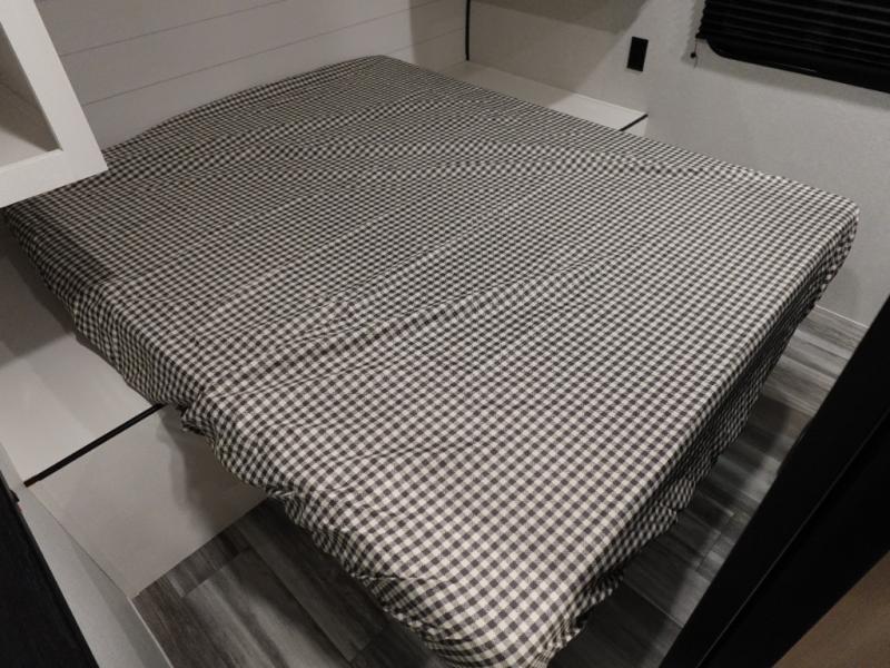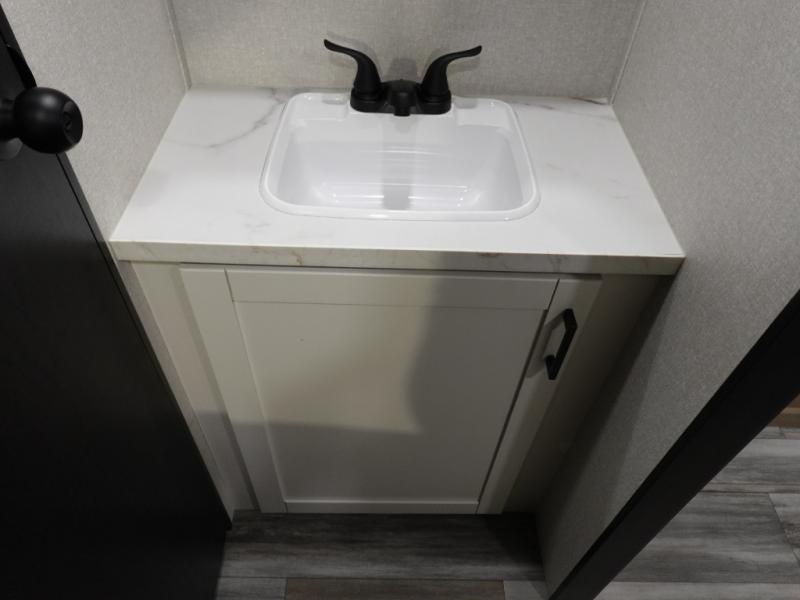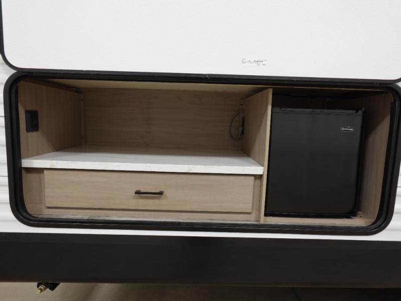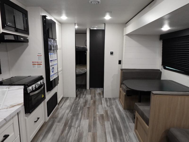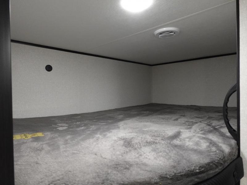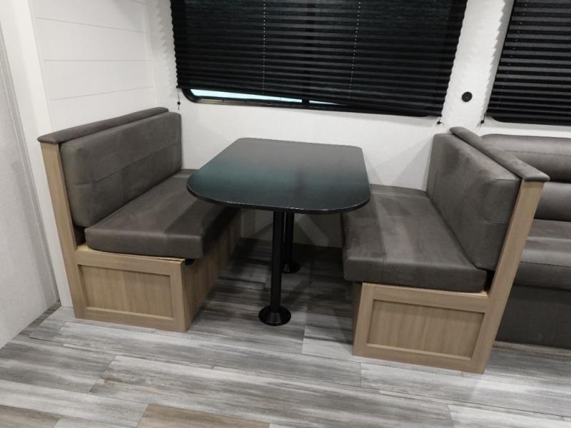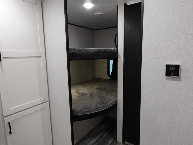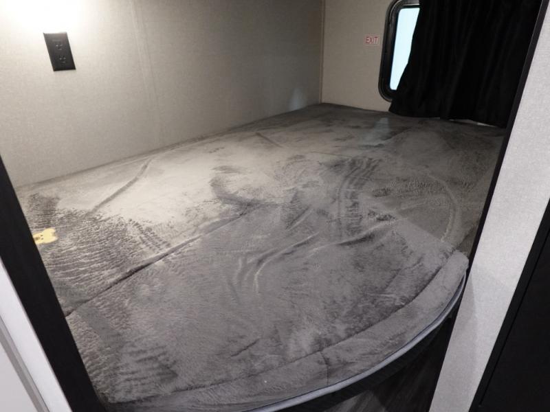 You can comfortably sleep up to ten people in this trailer thanks to the double-size bunks in back, the RV queen bed in the front bedroom, plus the booth dinette and jack-knife sofa in the main living area! The chef of your crew will have a three burner cooktop and microwave oven to prepare meals, and everyone can store their favorite drinks in the 8 cu. ft. 12V refrigerator inside, or in the outdoor refrigerator for convenience. The rear corner bathroom includes a tub/shower and a toilet, with the sink just outside of this room so others can brush their teeth if one is taking a shower before bed. The outside storage is accessible on both sides of the unit and will easily allow you bring along camp chairs, yard games and more. A 16' powered awning with LED lights will create a nice place to gather in the evenings with family and friends!