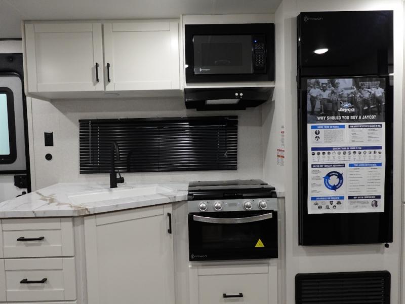 The Jayco Jay Flight SLX travel trailer is quite easy to own because it is lightweight for an easier towing experience. Built on a fully integrated A-frame with galvanized-steel, impact-resistant wheel wells, the Jay Flight SLX has quality at its very foundation. That quality continues on to the electric self-adjusting brakes, easy-lube hubs, Magnum Truss roof system, and LP quick connect. Some of what the mandatory Customer Value Package includes is backup camera prep, Keyed-Alike entry and baggage doors, marine grade exterior speakers, and an on-demand tankless water heater.