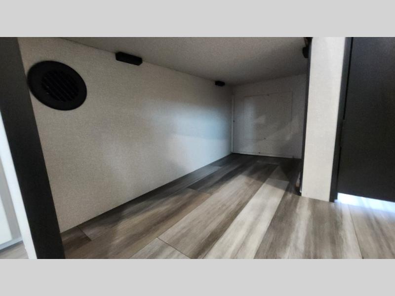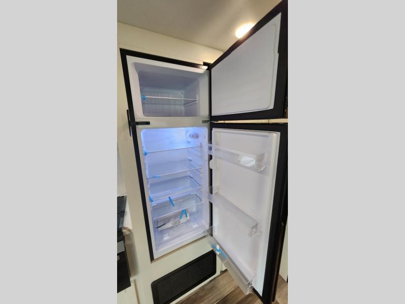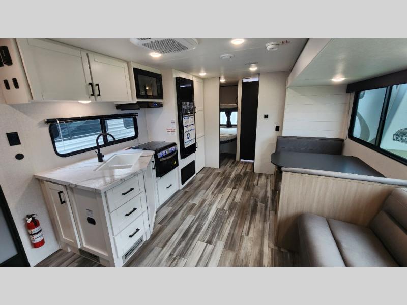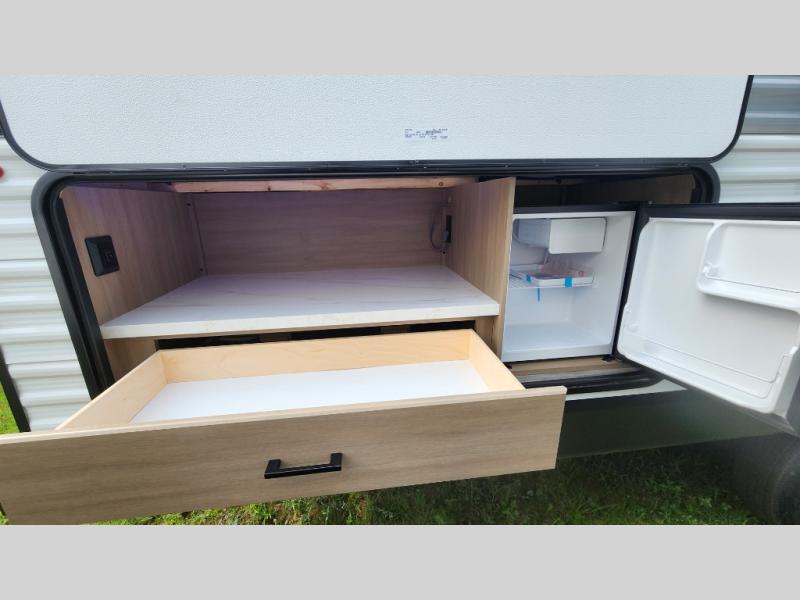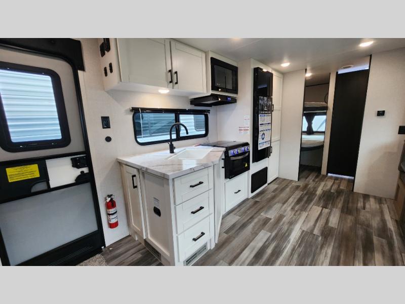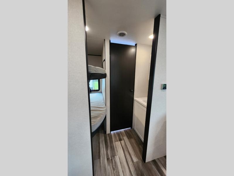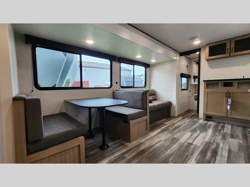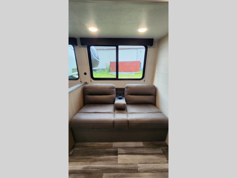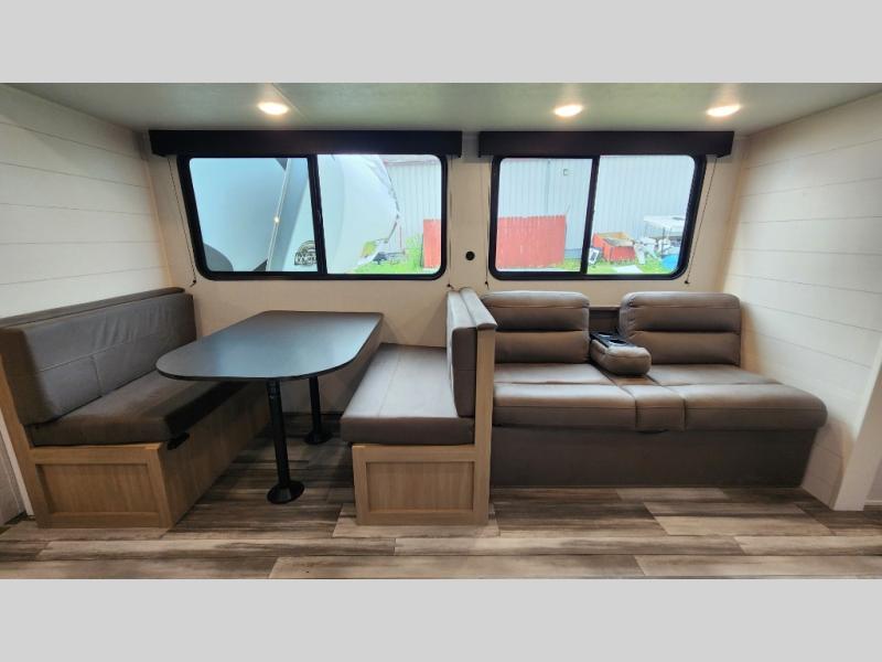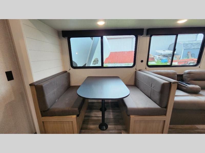 You can comfortably sleep up to ten people in this trailer thanks to the double-size bunks in back, the RV queen bed in the front bedroom, plus the booth dinette and jack-knife sofa in the main living area! The chef of your crew will have a three burner cooktop and microwave oven to prepare meals, and everyone can store their favorite drinks in the 8 cu. ft. 12V refrigerator inside, or in the outdoor refrigerator for convenience. The rear corner bathroom includes a shower and a toilet, with the sink just outside of this room so others can brush their teeth if one is taking a shower before bed. The outside storage is accessible on both sides of the unit and will easily allow you bring along camp chairs, yard games and more. A 16' powered awning with LED lights will create a nice place to gather in the evenings with family and friends!