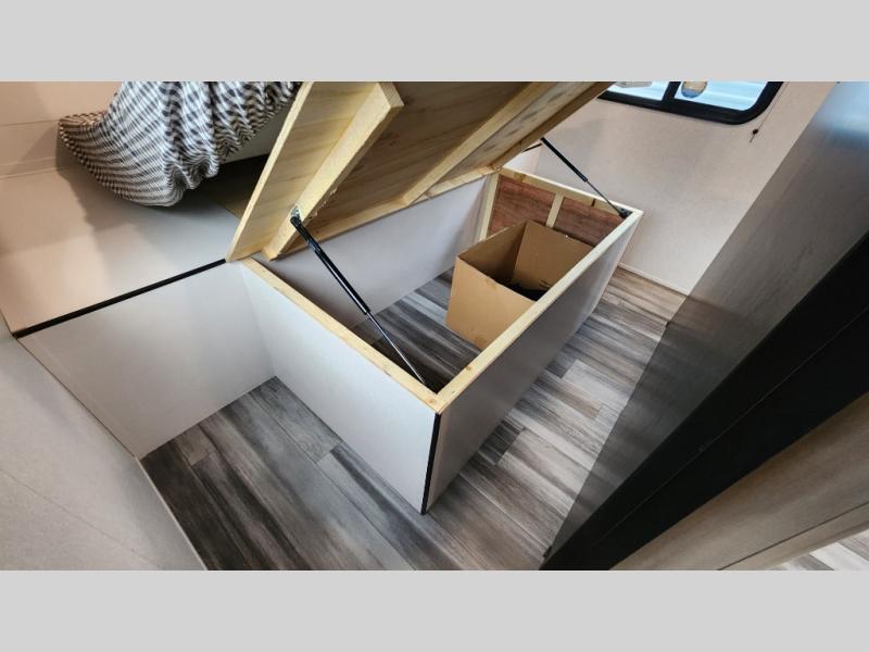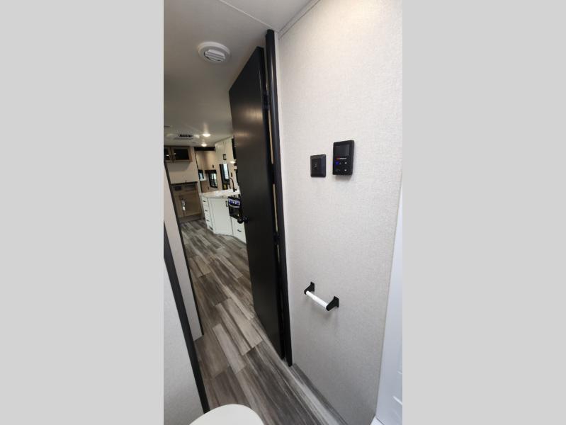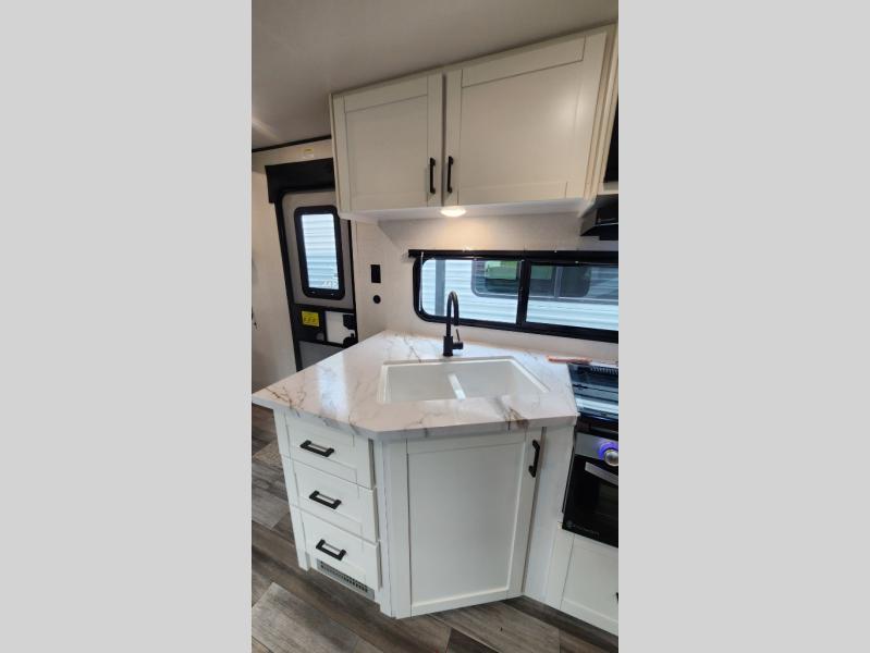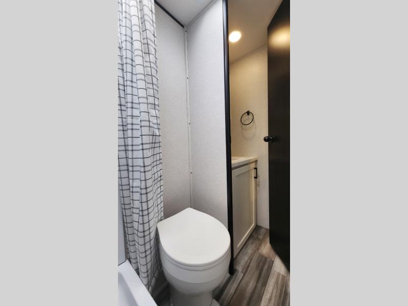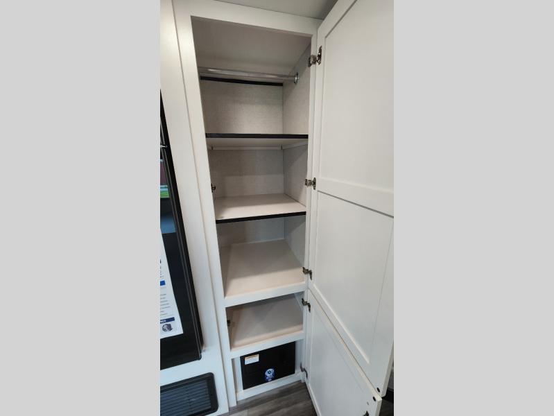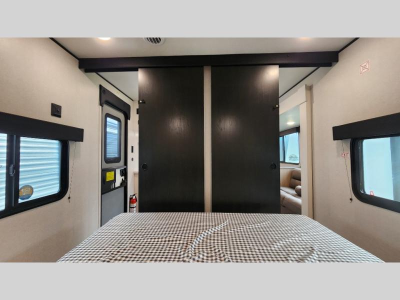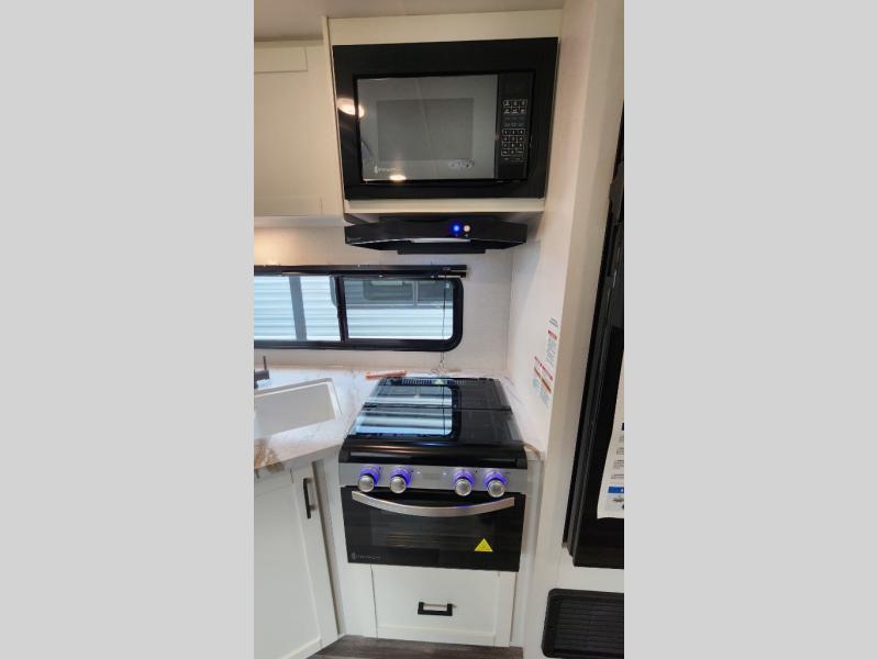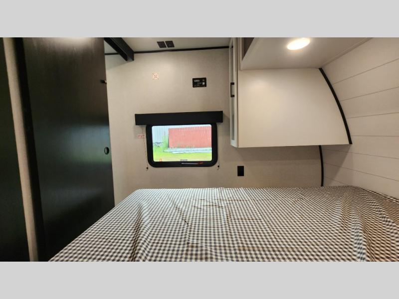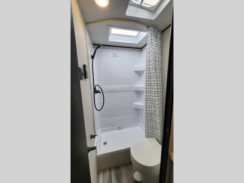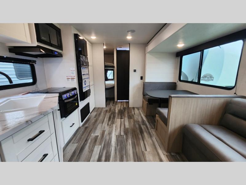 You can comfortably sleep up to ten people in this trailer thanks to the double-size bunks in back, the RV queen bed in the front bedroom, plus the booth dinette and jack-knife sofa in the main living area! The chef of your crew will have a three burner cooktop and microwave oven to prepare meals, and everyone can store their favorite drinks in the 8 cu. ft. 12V refrigerator inside, or in the outdoor refrigerator for convenience. The rear corner bathroom includes a shower and a toilet, with the sink just outside of this room so others can brush their teeth if one is taking a shower before bed. The outside storage is accessible on both sides of the unit and will easily allow you bring along camp chairs, yard games and more. A 16' powered awning with LED lights will create a nice place to gather in the evenings with family and friends!