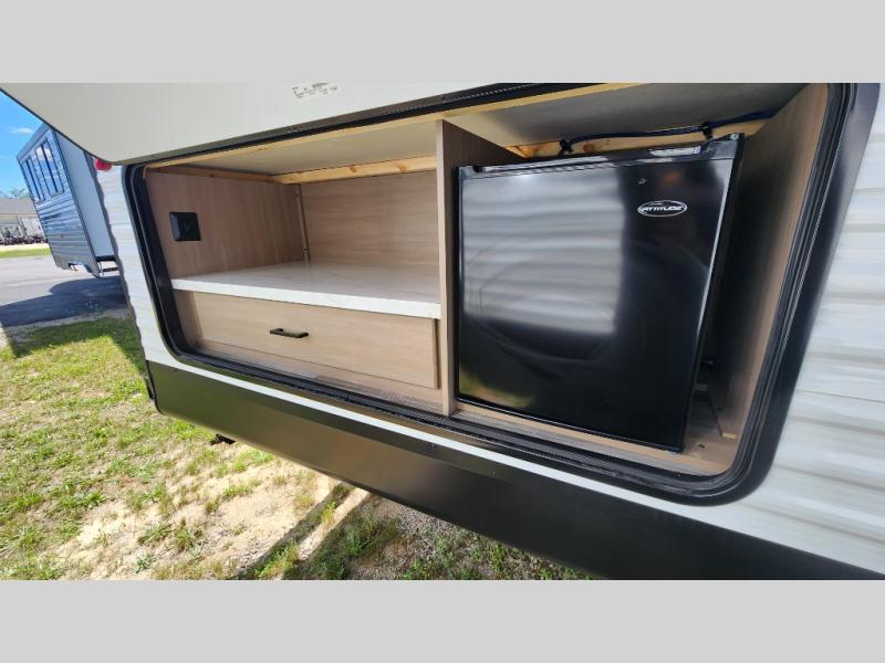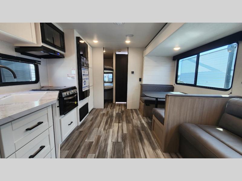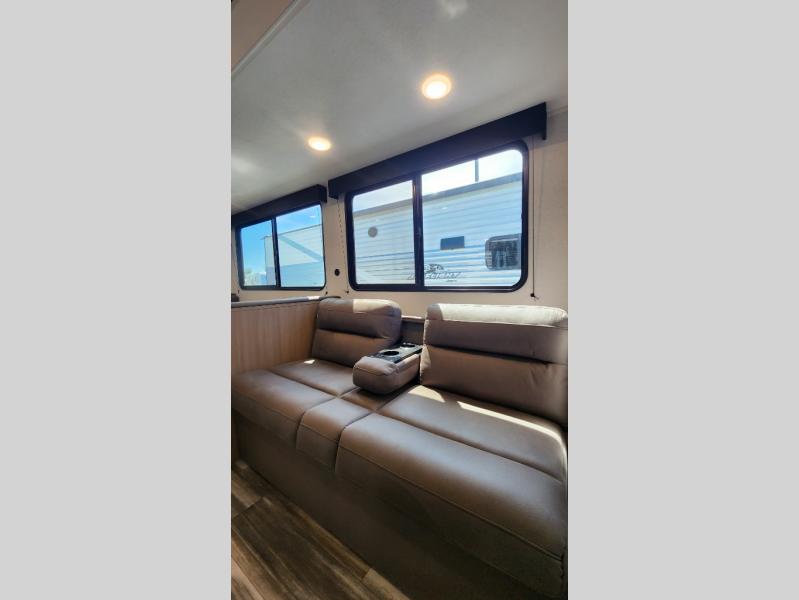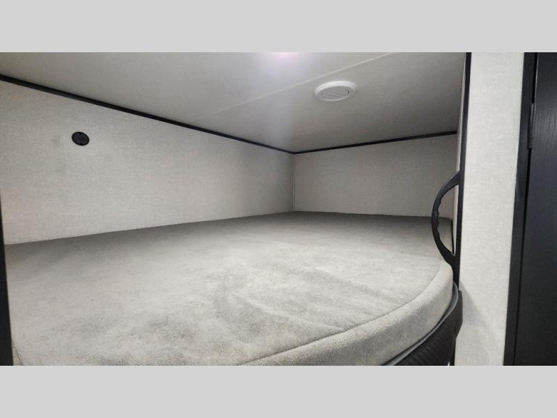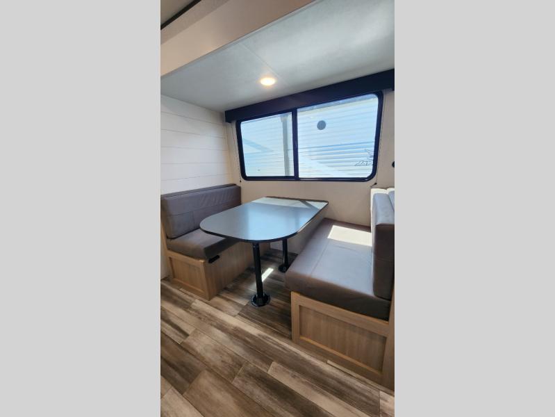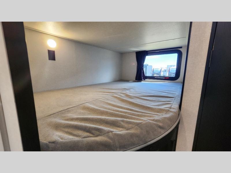 You can comfortably sleep up to ten people in this trailer thanks to the double-size bunks in back, the RV queen bed in the front bedroom, plus the booth dinette and jack-knife sofa in the main living area! The chef of your crew will have a three burner cooktop and microwave oven to prepare meals, and everyone can store their favorite drinks in the 8 cu. ft. 12V refrigerator inside, or in the outdoor refrigerator for convenience. The rear corner bathroom includes a shower and a toilet, with the sink just outside of this room so others can brush their teeth if one is taking a shower before bed. The outside storage is accessible on both sides of the unit and will easily allow you bring along camp chairs, yard games and more. A 16' powered awning with LED lights will create a nice place to gather in the evenings with family and friends!