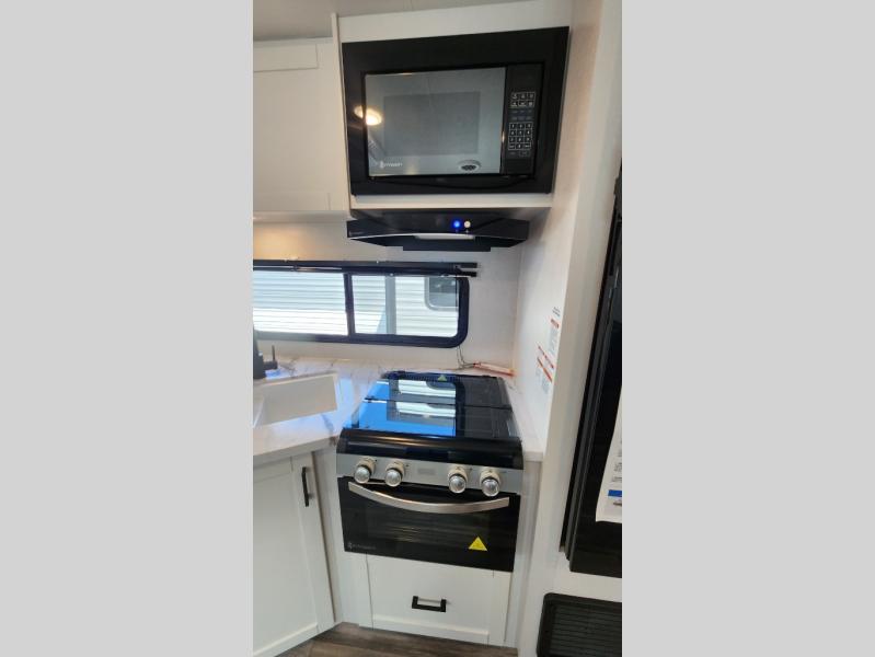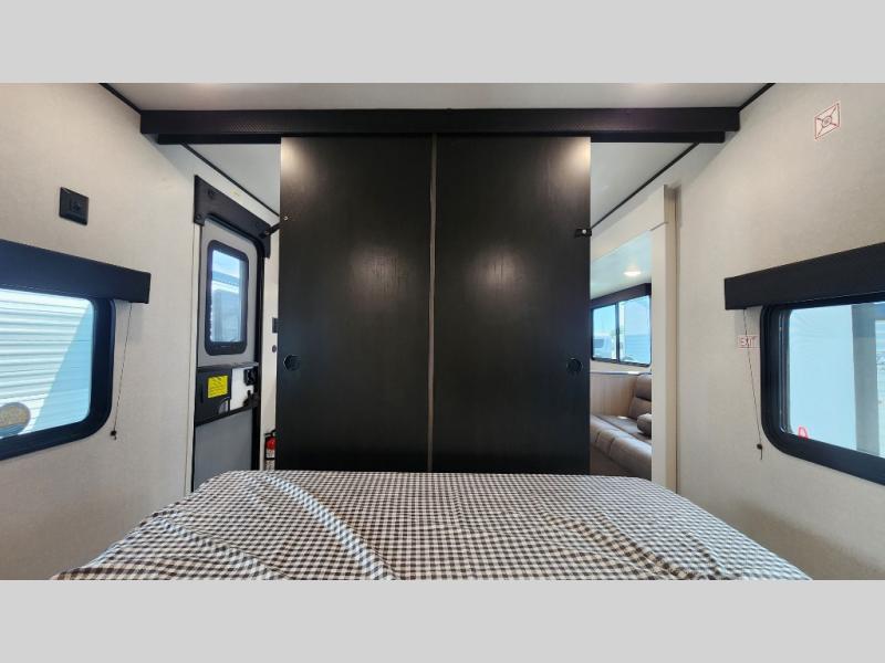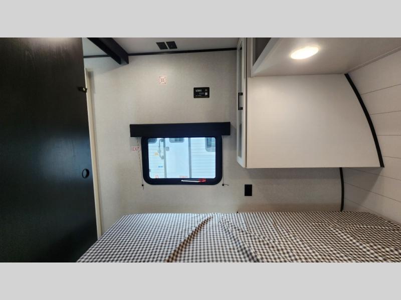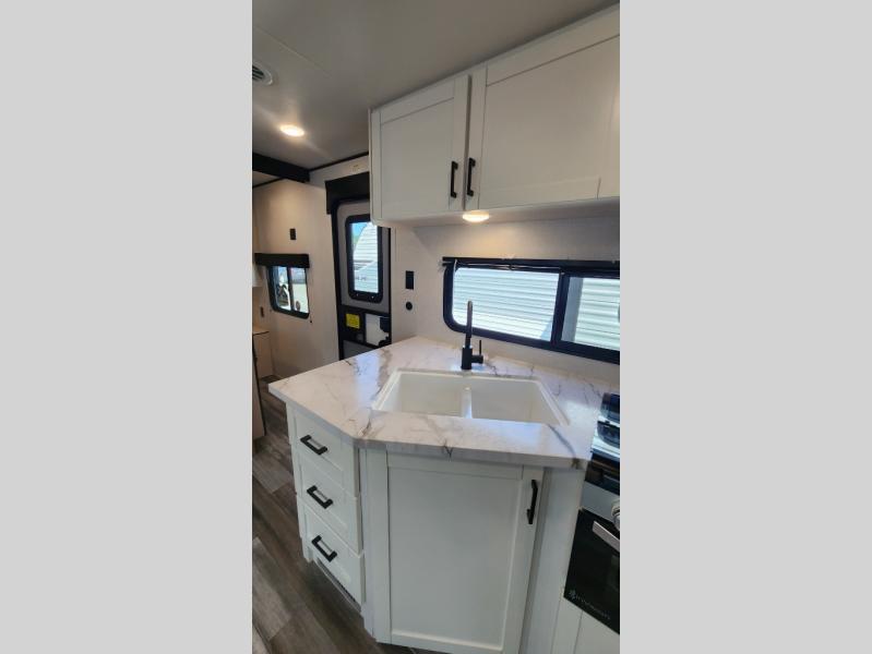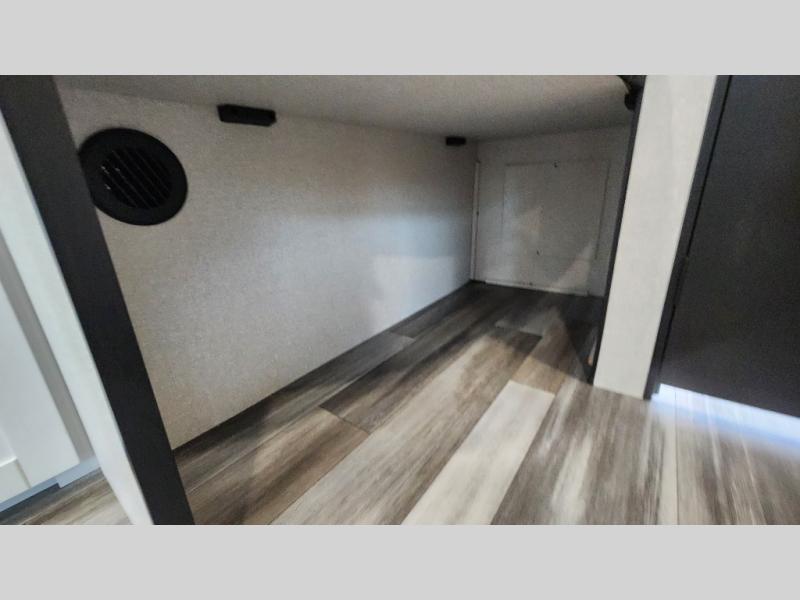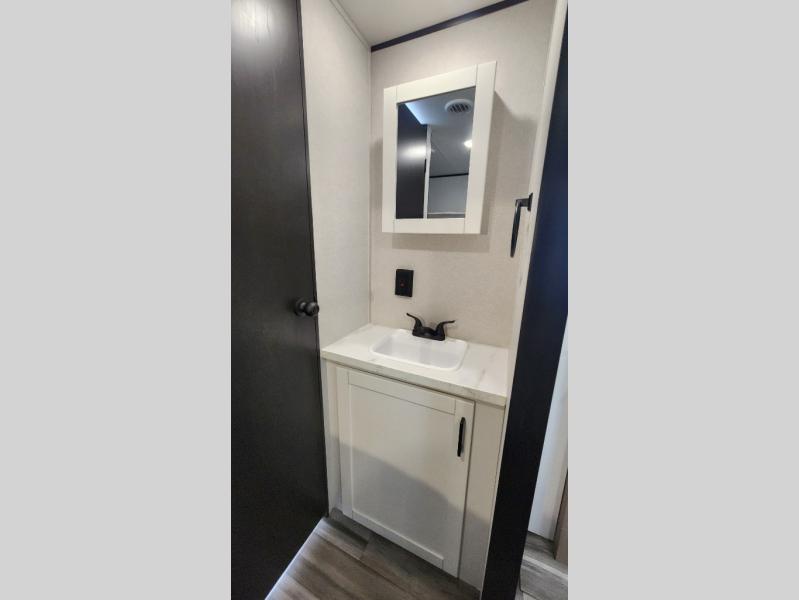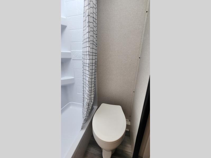 You can comfortably sleep up to ten people in this trailer thanks to the double-size bunks in back, the RV queen bed in the front bedroom, plus the booth dinette and jack-knife sofa in the main living area! The chef of your crew will have a three burner cooktop and microwave oven to prepare meals, and everyone can store their favorite drinks in the 8 cu. ft. 12V refrigerator inside, or in the outdoor refrigerator for convenience. The rear corner bathroom includes a shower and a toilet, with the sink just outside of this room so others can brush their teeth if one is taking a shower before bed. The outside storage is accessible on both sides of the unit and will easily allow you bring along camp chairs, yard games and more. A 16' powered awning with LED lights will create a nice place to gather in the evenings with family and friends!