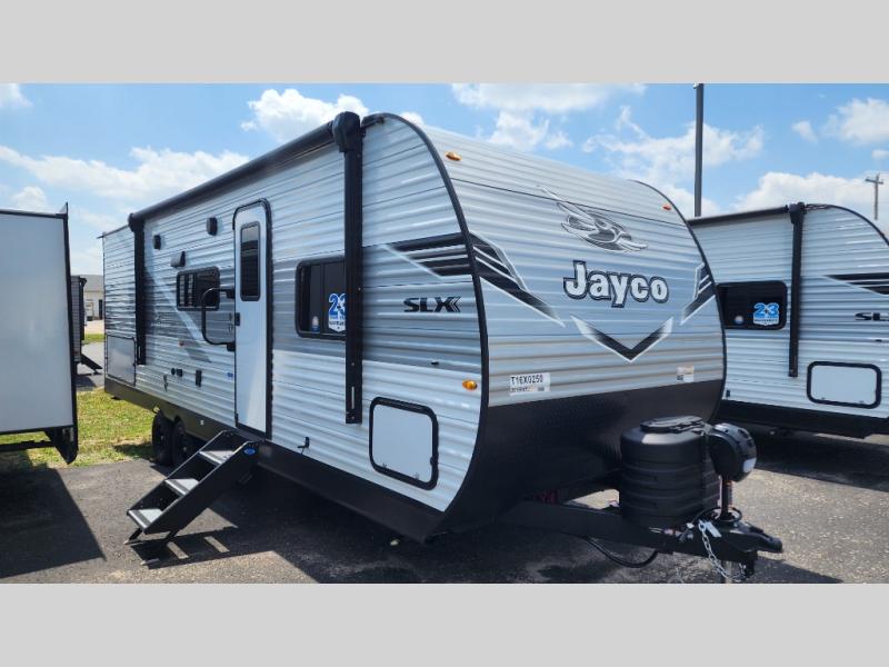 The Jayco Jay Flight SLX travel trailer is quite easy to own because it is lightweight for an easier towing experience. Built on a fully integrated A-frame with galvanized-steel, impact-resistant wheel wells, the Jay Flight SLX has quality at its very foundation. That quality continues on to the electric self-adjusting brakes, easy-lube hubs, Magnum Truss roof system, and LP quick connect. Some of what the mandatory Customer Value Package includes is backup camera prep, Keyed-Alike entry and baggage doors, and an on-demand tankless water heater.