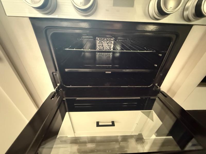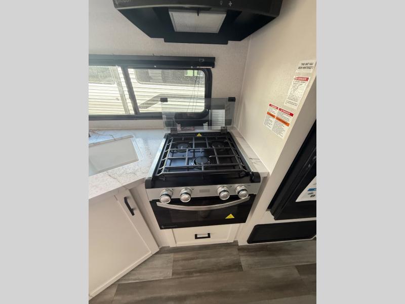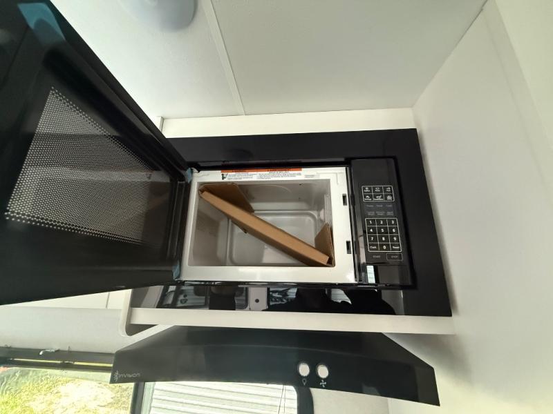 Well-Appointed Kitchen – 3-burner cooktop, microwave, and an 8 cu. ft. 12V refrigerator to feed the whole crew.