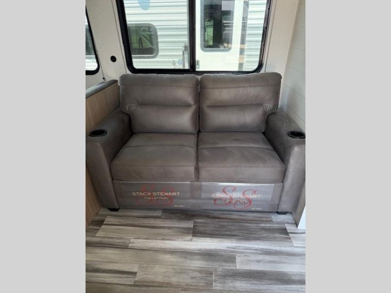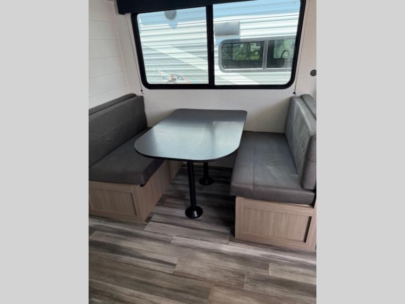 You can comfortably sleep up to ten people in this trailer thanks to the double-size bunks in back, the RV queen bed in the front bedroom, plus the booth dinette and jack-knife sofa in the main living area! The chef of your crew will have a three burner cooktop and microwave oven to prepare meals, and everyone can store their favorite drinks in the 8 cu. ft. 12V refrigerator inside, or in the outdoor refrigerator for convenience. The rear corner bathroom includes a shower and a toilet, with the sink just outside of this room so others can brush their teeth if one is taking a shower before bed. The outside storage is accessible on both sides of the unit and will easily allow you bring along camp chairs, yard games and more. A 16' powered awning with LED lights will create a nice place to gather in the evenings with family and friends!