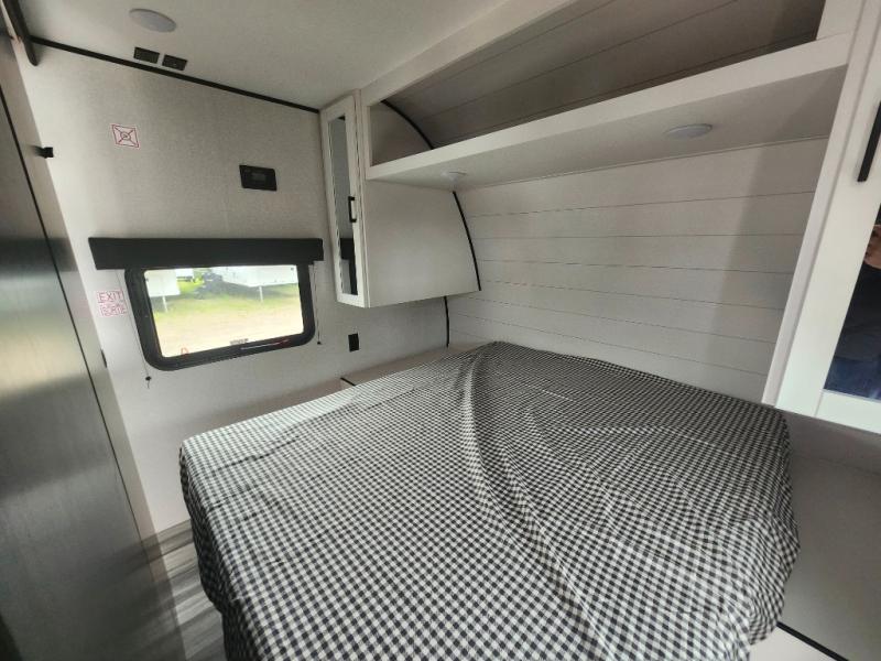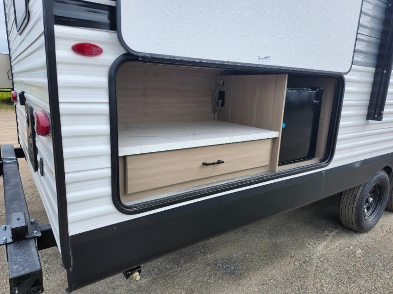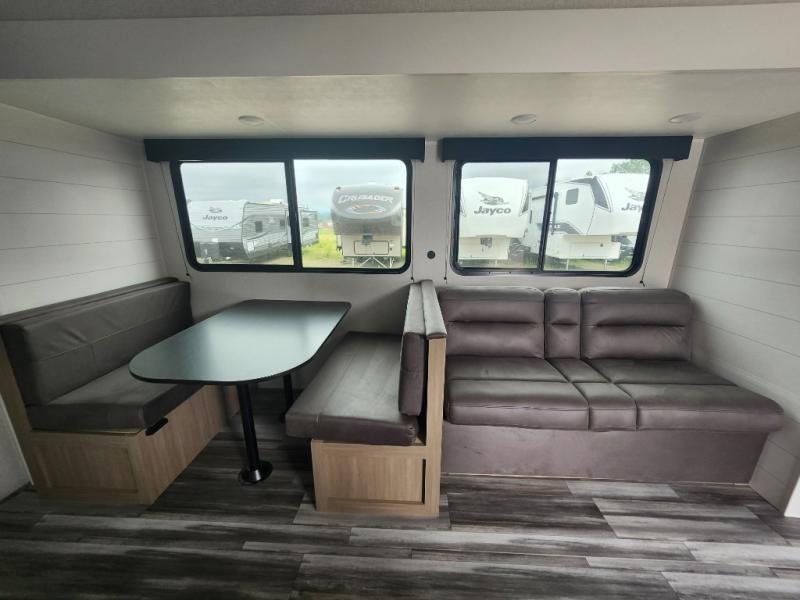 You can comfortably sleep up to ten people in this trailer thanks to the double-size bunks in back, the RV queen bed in the front bedroom, plus the booth dinette and jack-knife sofa in the main living area! The chef of your crew will have a three burner cooktop and microwave oven to prepare meals, and everyone can store their favorite drinks in the 8 cu. ft. 12V refrigerator inside, or in the outdoor refrigerator for convenience. The rear corner bathroom includes a tub/shower and a toilet, with the sink just outside of this room so others can brush their teeth if one is taking a shower before bed. The outside storage is accessible on both sides of the unit and will easily allow you bring along camp chairs, yard games and more. A 16' powered awning with LED lights will create a nice place to gather in the evenings with family and friends!