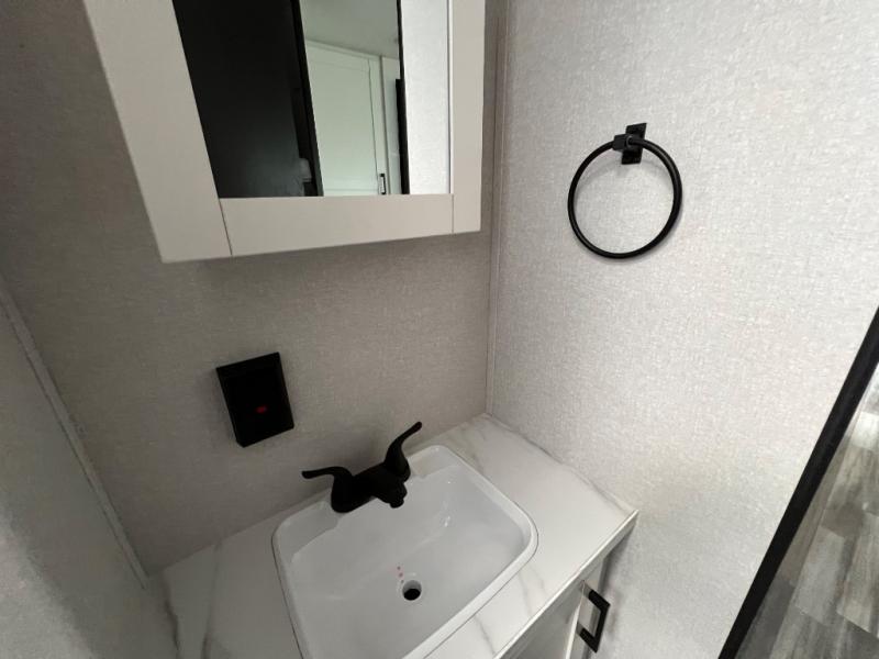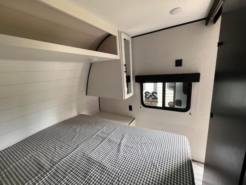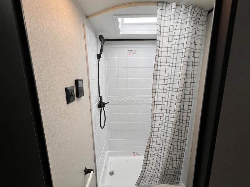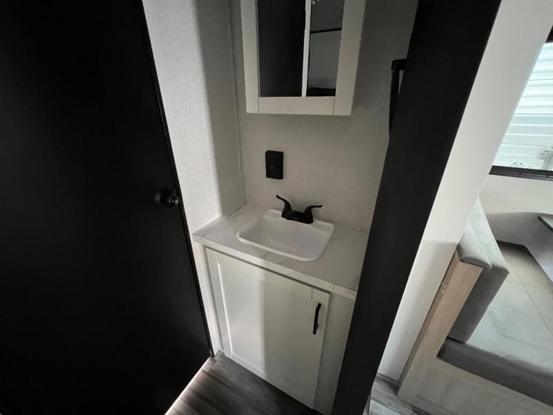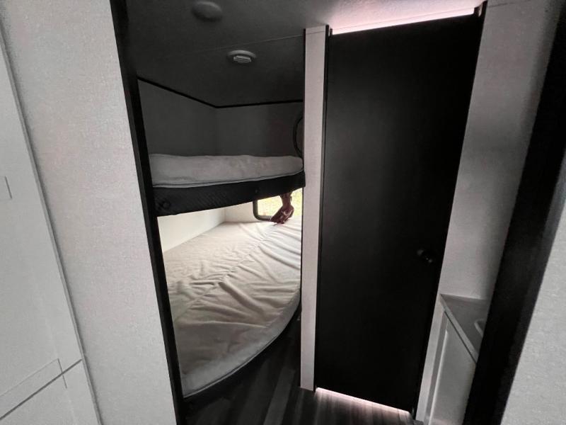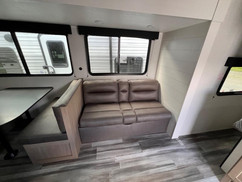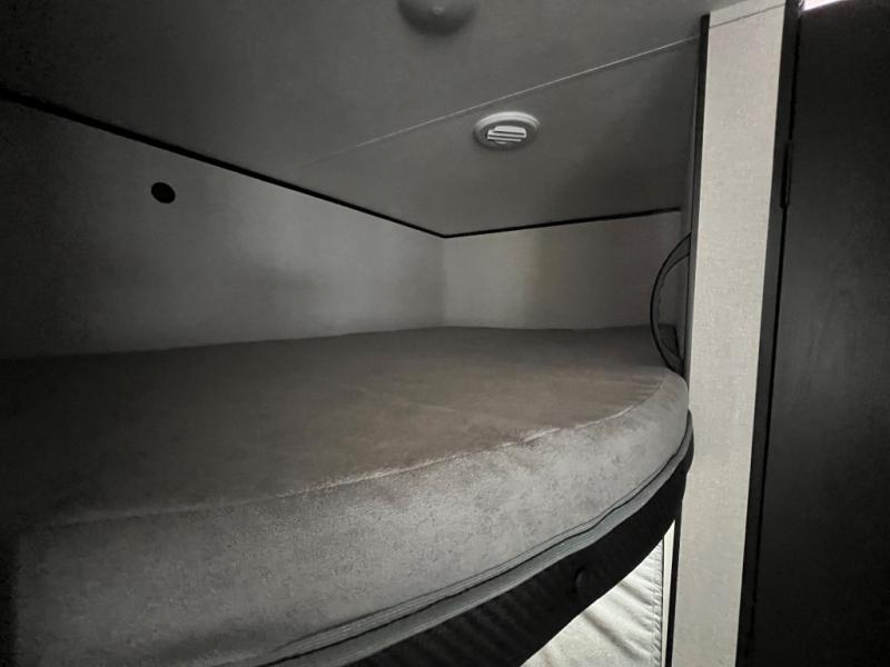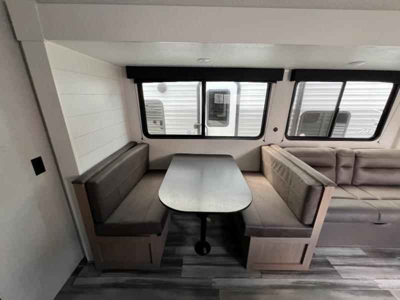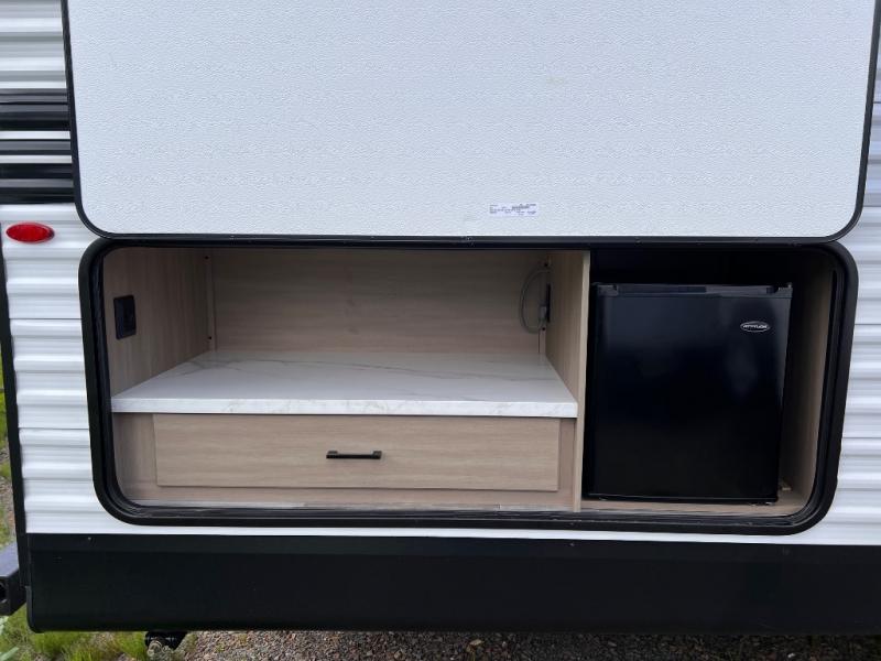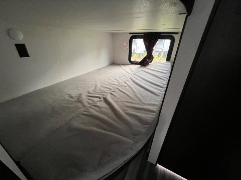 You can comfortably sleep up to ten people in this trailer thanks to the double-size bunks in back, the RV queen bed in the front bedroom, plus the booth dinette and jack-knife sofa in the main living area! The chef of your crew will have a three burner cooktop and microwave oven to prepare meals, and everyone can store their favorite drinks in the 8 cu. ft. 12V refrigerator inside, or in the outdoor refrigerator for convenience. The rear corner bathroom includes a tub/shower and a toilet, with the sink just outside of this room so others can brush their teeth if one is taking a shower before bed. The outside storage is accessible on both sides of the unit and will easily allow you bring along camp chairs, yard games and more. A 16' powered awning with LED lights will create a nice place to gather in the evenings with family and friends!