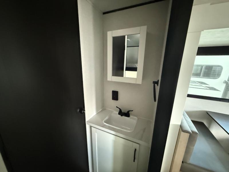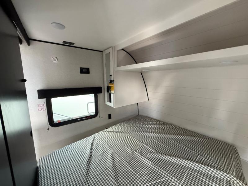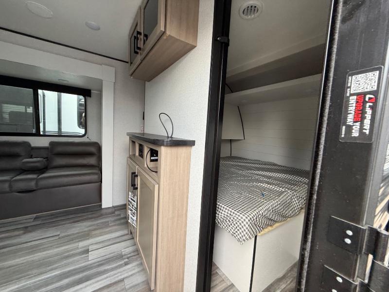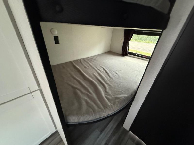 You can comfortably sleep up to ten people in this trailer thanks to the double-size bunks in back, the RV queen bed in the front bedroom, plus the booth dinette and jack-knife sofa in the main living area! The chef of your crew will have a three burner cooktop and microwave oven to prepare meals, and everyone can store their favorite drinks in the 8 cu. ft. 12V refrigerator inside, or in the outdoor refrigerator for convenience. The rear corner bathroom includes a shower and a toilet, with the sink just outside of this room so others can brush their teeth if one is taking a shower before bed. The outside storage is accessible on both sides of the unit and will easily allow you bring along camp chairs, yard games and more. A 16' powered awning with LED lights will create a nice place to gather in the evenings with family and friends!