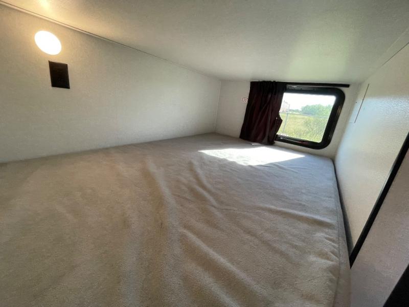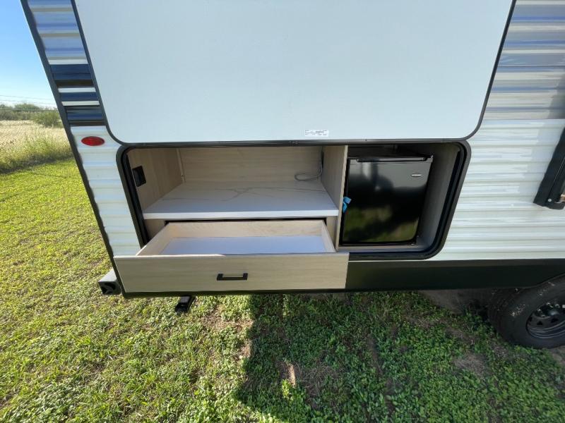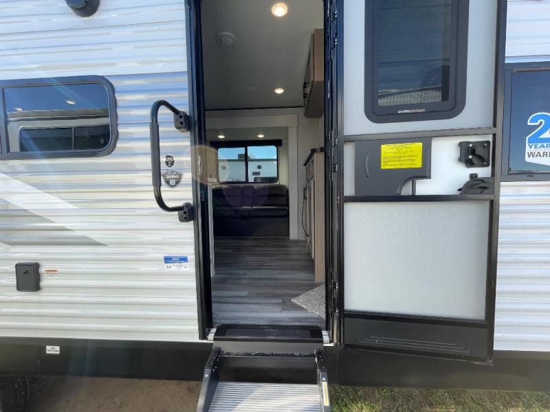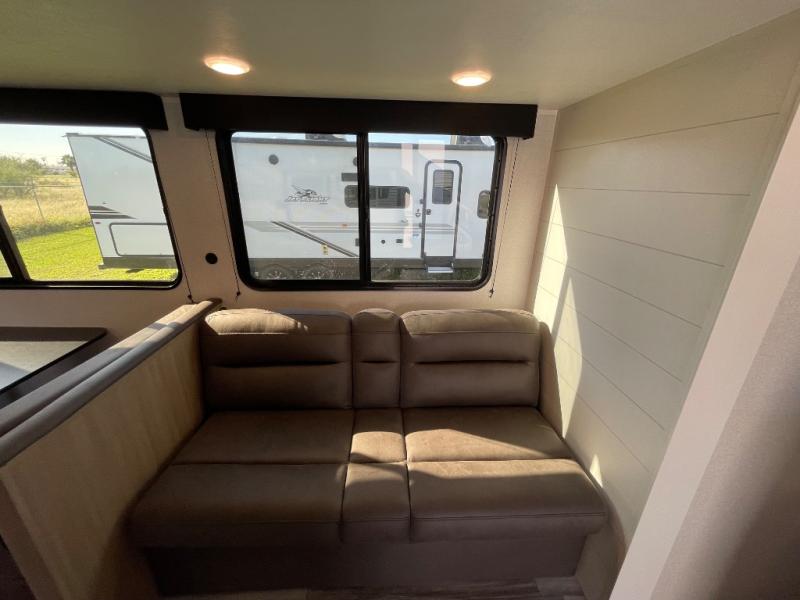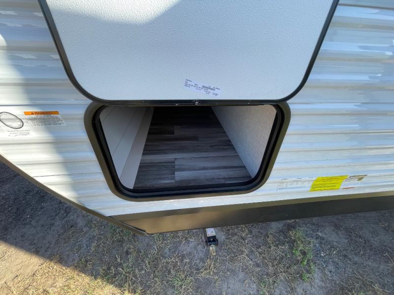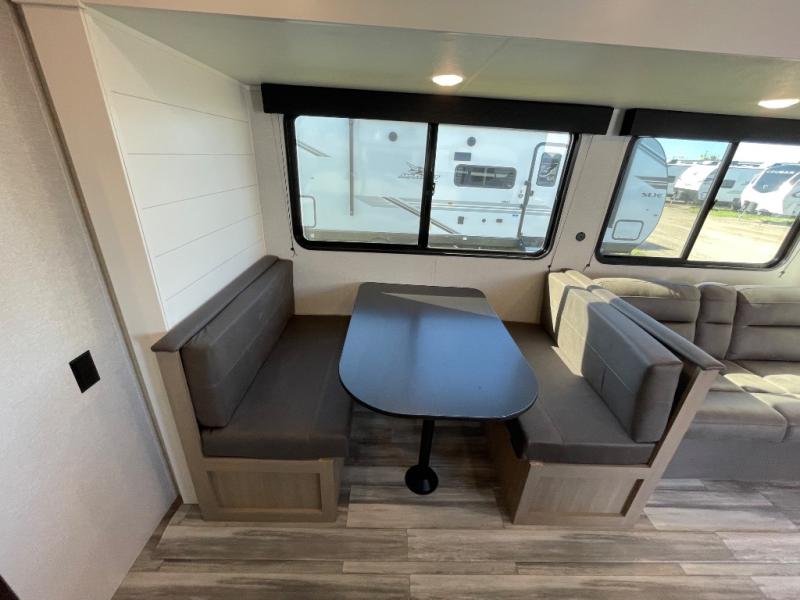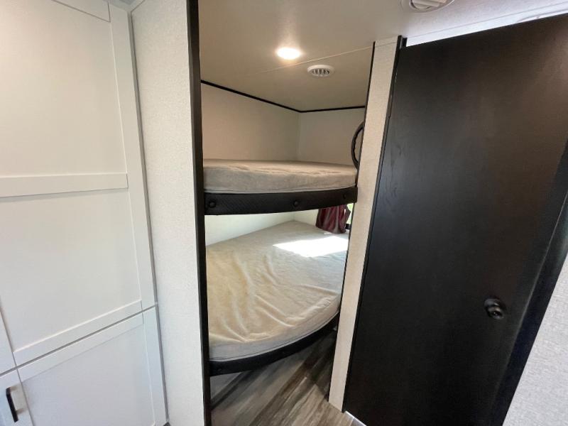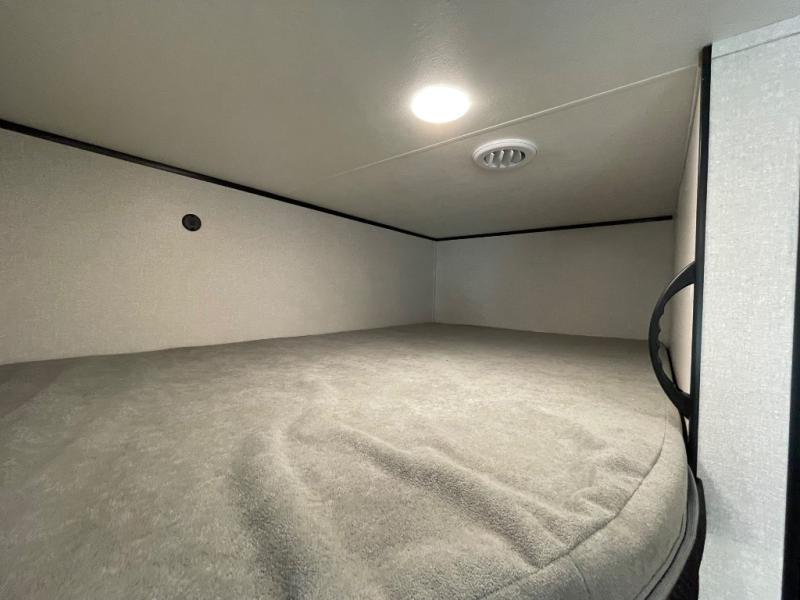 You can comfortably sleep up to ten people in this trailer thanks to the double-size bunks in back, the RV queen bed in the front bedroom, plus the booth dinette and jack-knife sofa in the main living area! The chef of your crew will have a three burner cooktop and microwave oven to prepare meals, and everyone can store their favorite drinks in the 8 cu. ft. 12V refrigerator inside, or in the outdoor refrigerator for convenience. The rear corner bathroom includes a shower and a toilet, with the sink just outside of this room so others can brush their teeth if one is taking a shower before bed. The outside storage is accessible on both sides of the unit and will easily allow you bring along camp chairs, yard games and more. A 16' powered awning with LED lights will create a nice place to gather in the evenings with family and friends!