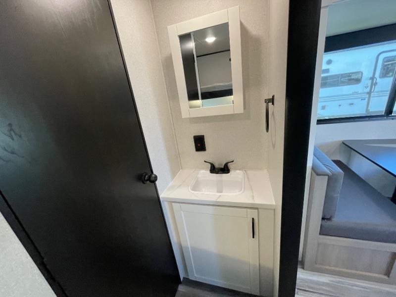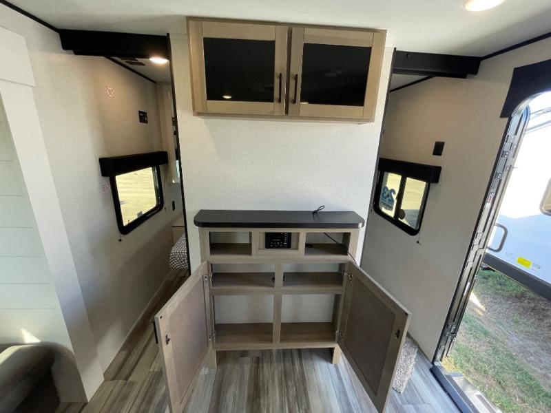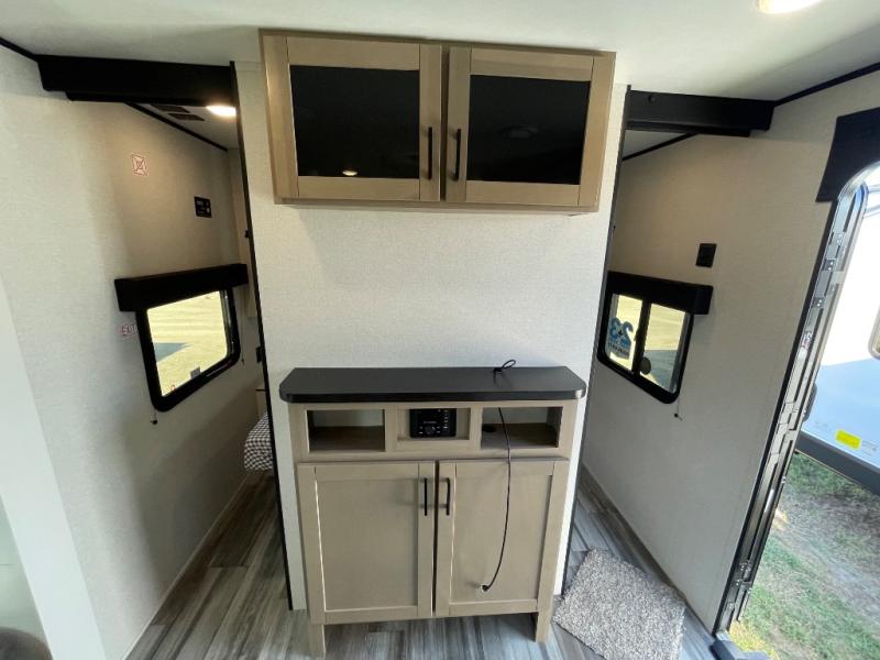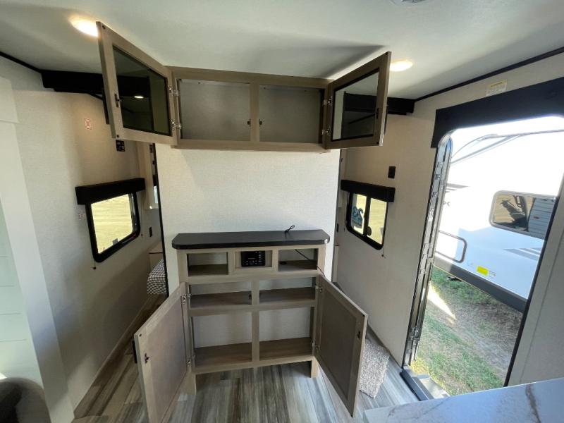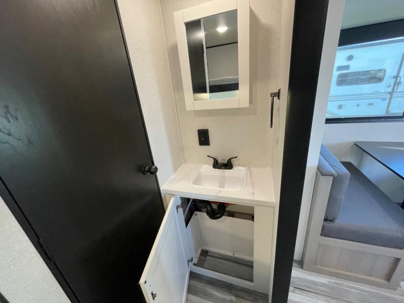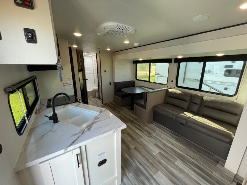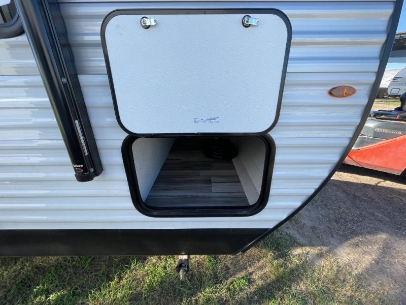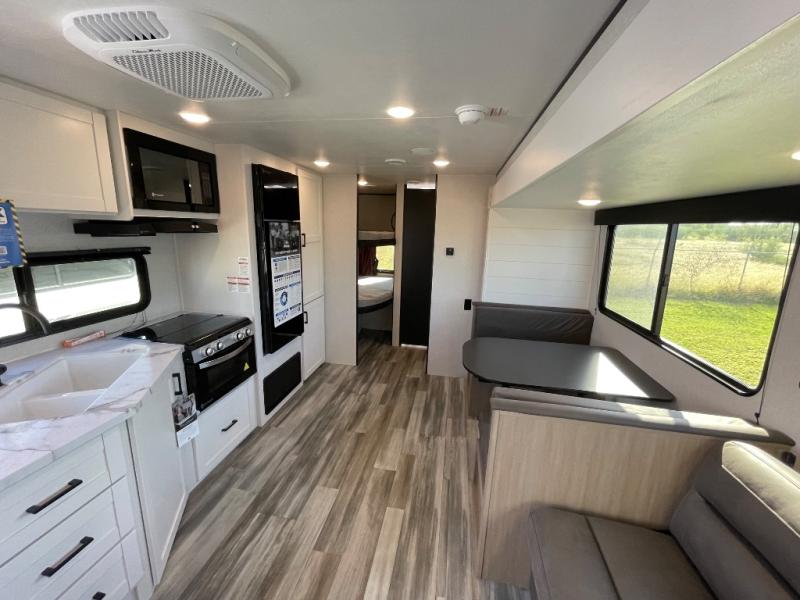 You can comfortably sleep up to ten people in this trailer thanks to the double-size bunks in back, the RV queen bed in the front bedroom, plus the booth dinette and jack-knife sofa in the main living area! The chef of your crew will have a three burner cooktop and microwave oven to prepare meals, and everyone can store their favorite drinks in the 8 cu. ft. 12V refrigerator inside, or in the outdoor refrigerator for convenience. The rear corner bathroom includes a shower and a toilet, with the sink just outside of this room so others can brush their teeth if one is taking a shower before bed. The outside storage is accessible on both sides of the unit and will easily allow you bring along camp chairs, yard games and more. A 16' powered awning with LED lights will create a nice place to gather in the evenings with family and friends!