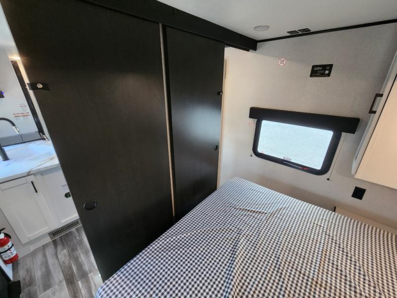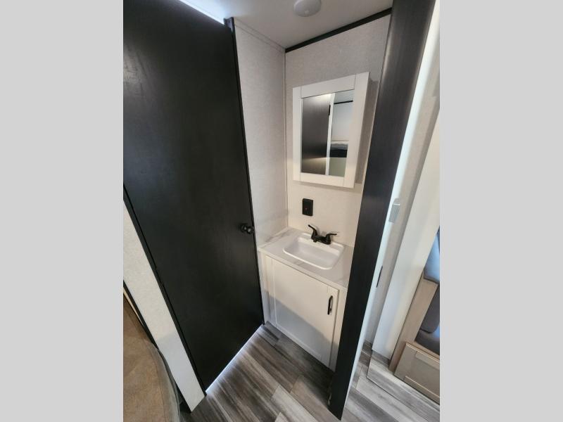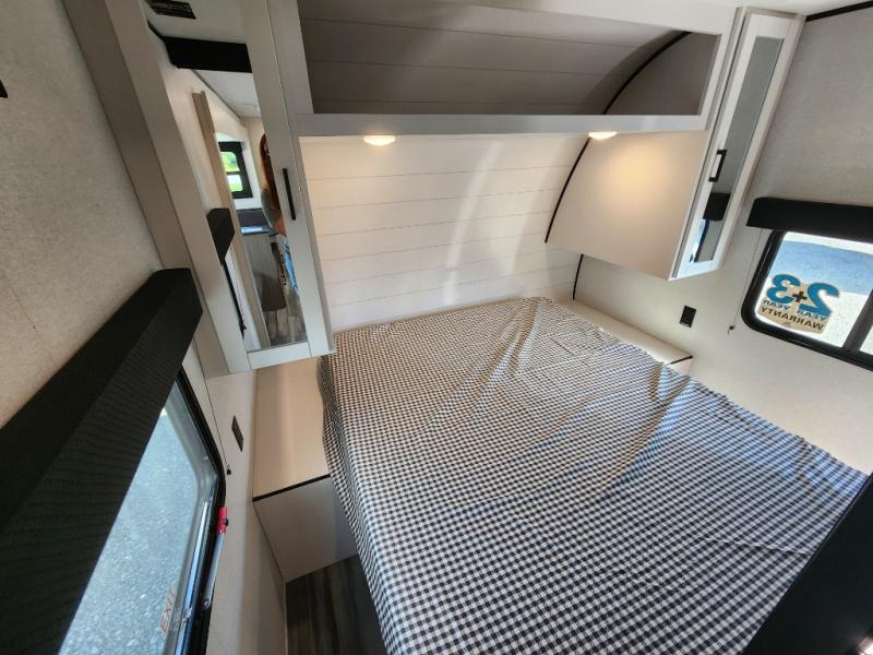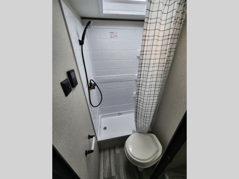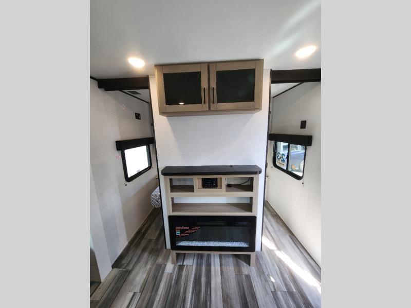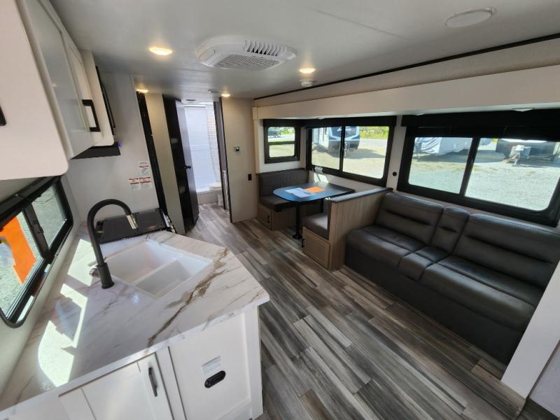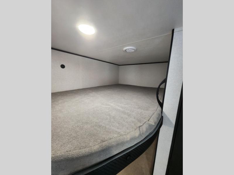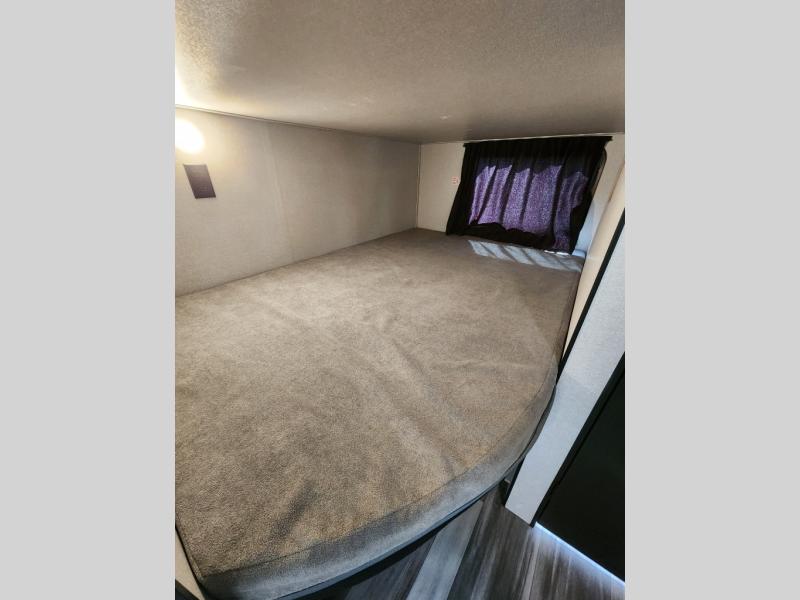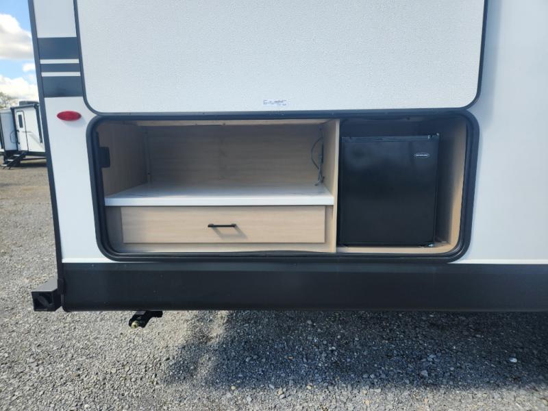 You can comfortably sleep up to ten people in this trailer thanks to the double-size bunks in back, the RV queen bed in the front bedroom, plus the booth dinette and jack-knife sofa in the main living area! The chef of your crew will have a three burner cooktop and microwave oven to prepare meals, and everyone can store their favorite drinks in the 8 cu. ft. 12V refrigerator inside, or in the outdoor refrigerator for convenience. The rear corner bathroom includes a shower and a toilet, with the sink just outside of this room so others can brush their teeth if one is taking a shower before bed. The outside storage is accessible on both sides of the unit and will easily allow you bring along camp chairs, yard games and more. A 16' powered awning with LED lights will create a nice place to gather in the evenings with family and friends!
