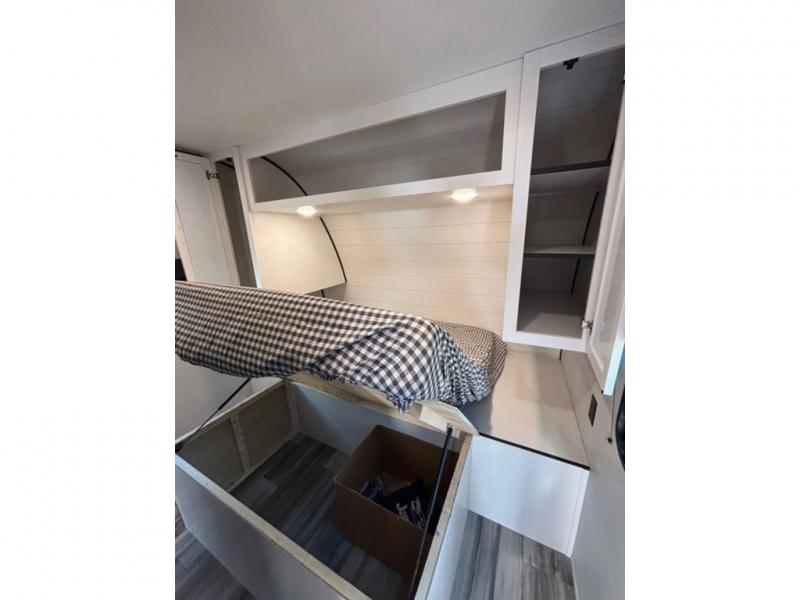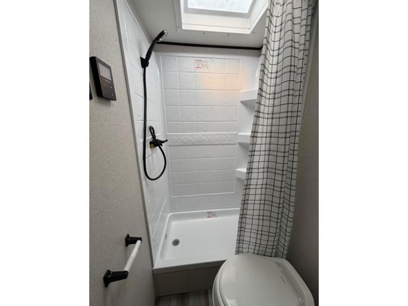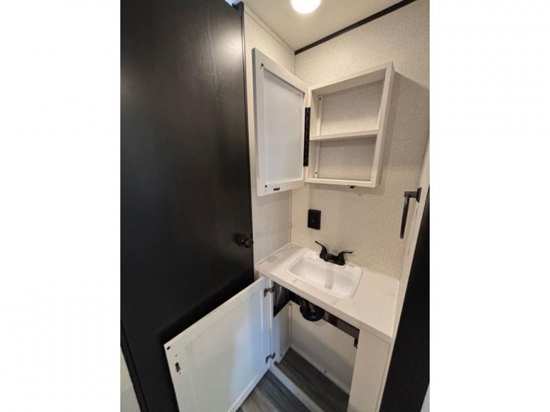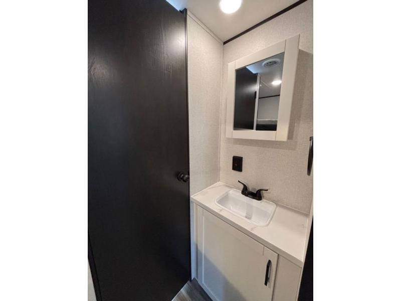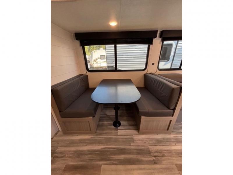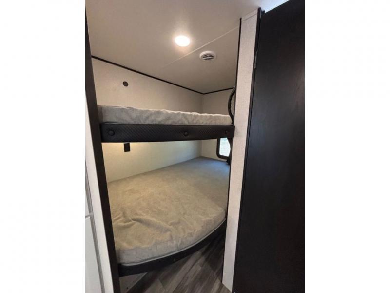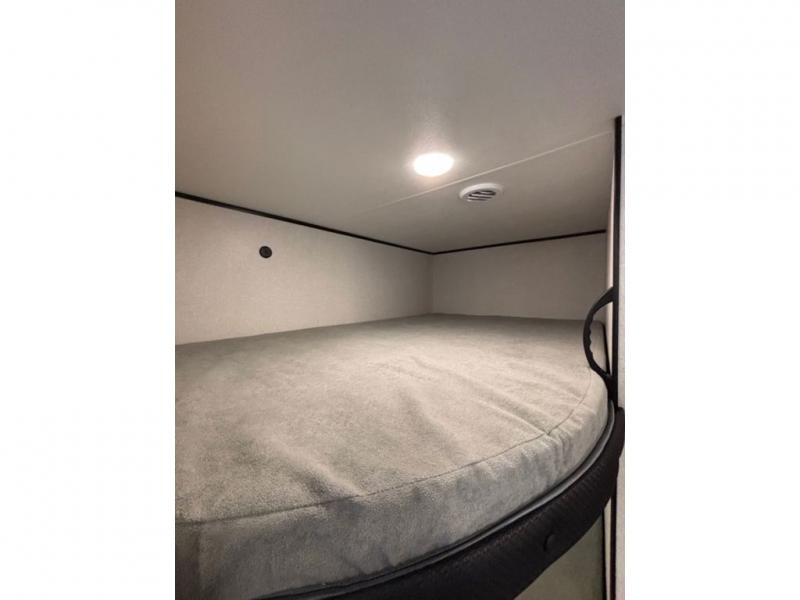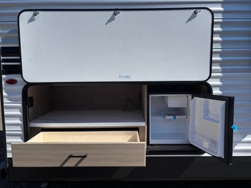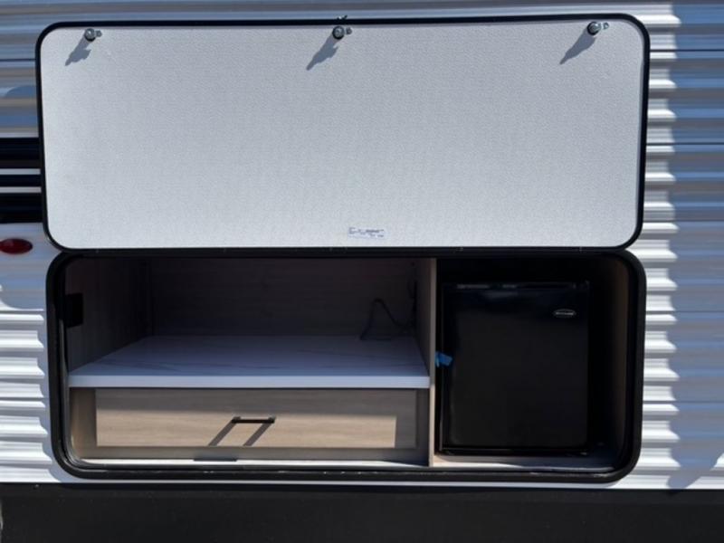 You can comfortably sleep up to ten people in this trailer thanks to the double-size bunks in back, the RV queen bed in the front bedroom, plus the booth dinette and jack-knife sofa in the main living area! The chef of your crew will have a three burner cooktop and microwave oven to prepare meals, and everyone can store their favorite drinks in the 8 cu. ft. 12V refrigerator inside, or in the outdoor refrigerator for convenience. The rear corner bathroom includes a shower and a toilet, with the sink just outside of this room so others can brush their teeth if one is taking a shower before bed. The outside storage is accessible on both sides of the unit and will easily allow you bring along camp chairs, yard games and more. A 16' powered awning with LED lights will create a nice place to gather in the evenings with family and friends!