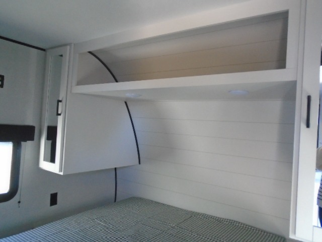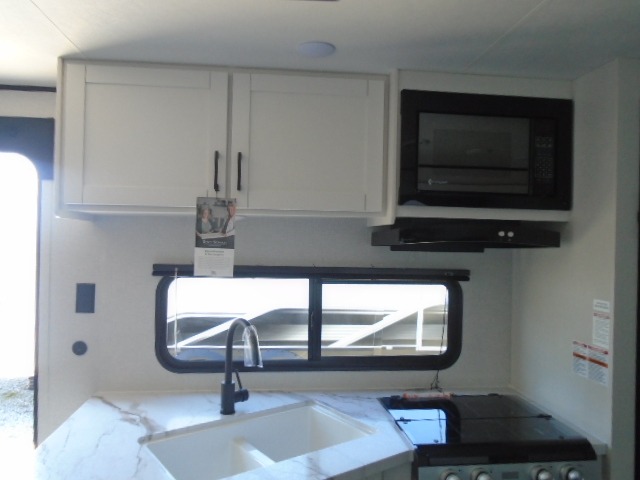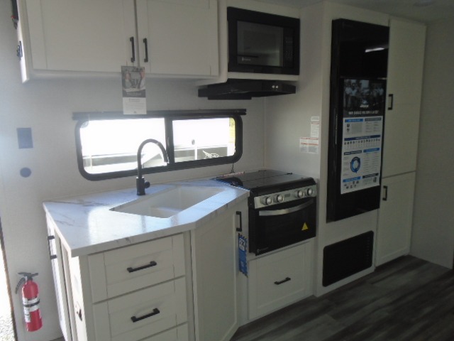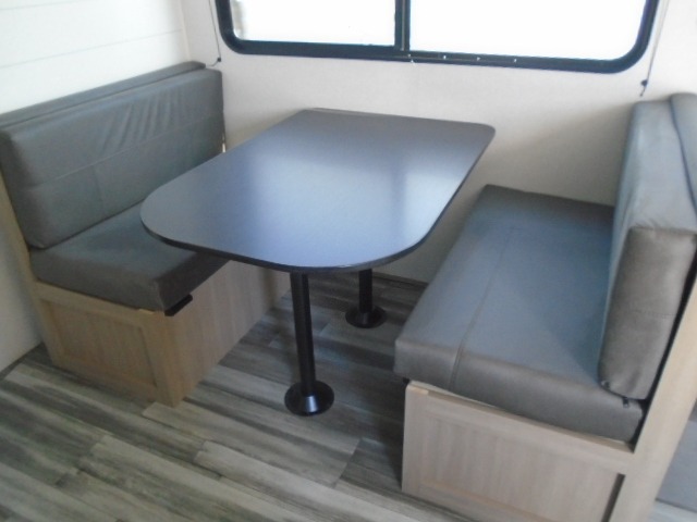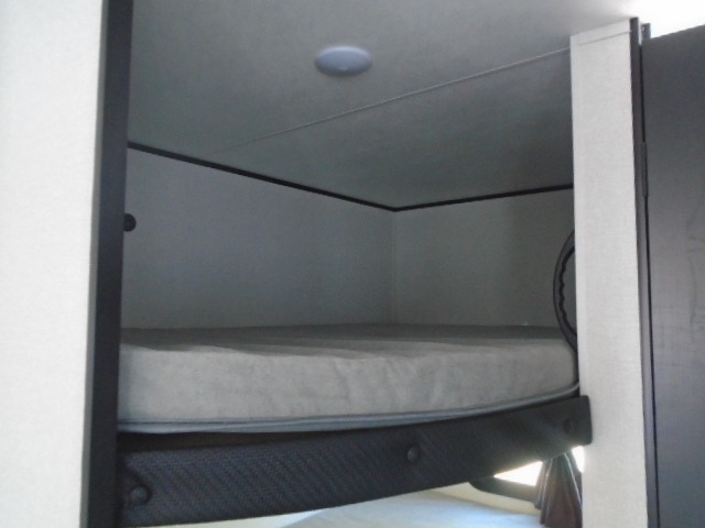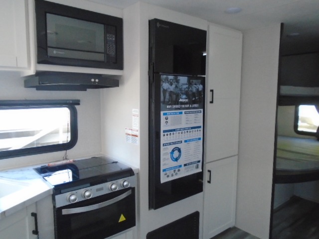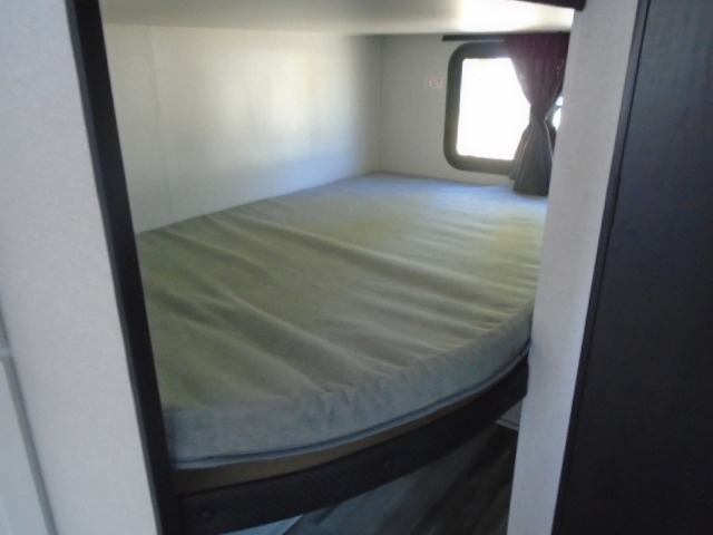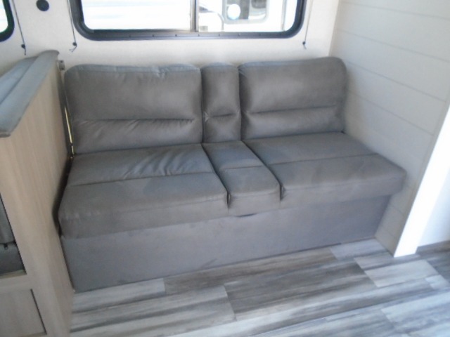You can comfortably sleep up to ten people in this trailer thanks to the double-size bunks in back, the RV queen bed in the front bedroom, plus the booth dinette and jack-knife sofa in the main living area! The chef of your crew will have a three burner cooktop and microwave oven to prepare meals, and everyone can store their favorite drinks in the 8 cu. ft. 12V refrigerator inside, or in the outdoor refrigerator for convenience. The rear corner bathroom includes a shower and a toilet, with the sink just outside of this room so others can brush their teeth if one is taking a shower before bed. The outside storage is accessible on both sides of the unit and will easily allow you bring along camp chairs, yard games and more. A 16' powered awning with LED lights will create a nice place to gather in the evenings with family and friends!