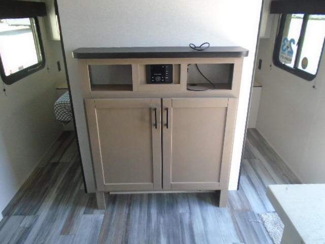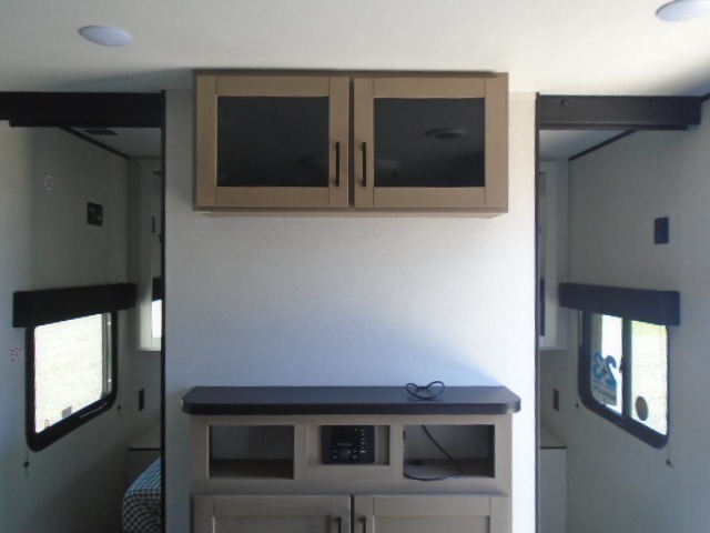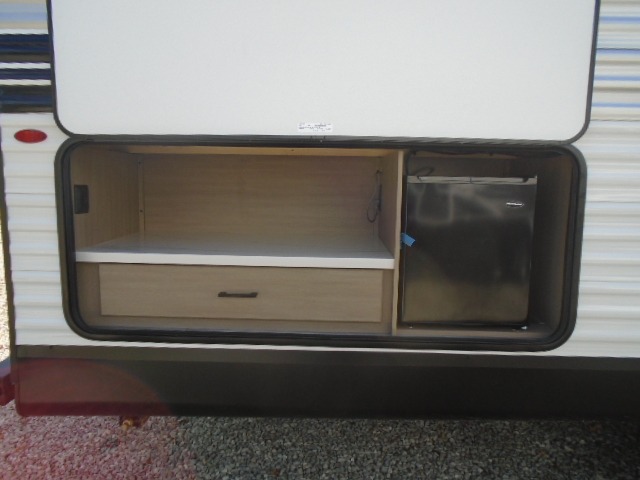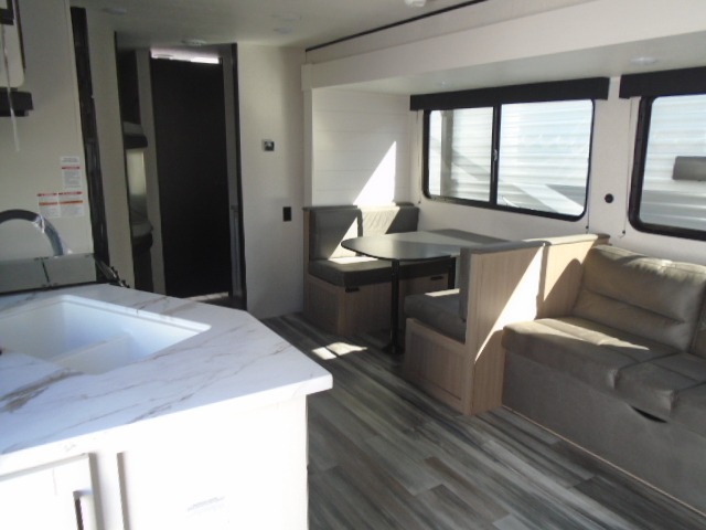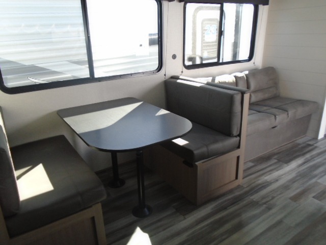 You can comfortably sleep up to ten people in this trailer thanks to the double-size bunks in back, the RV queen bed in the front bedroom, plus the booth dinette and jack-knife sofa in the main living area! The chef of your crew will have a three burner cooktop and microwave oven to prepare meals, and everyone can store their favorite drinks in the 8 cu. ft. 12V refrigerator inside, or in the outdoor refrigerator for convenience. The rear corner bathroom includes a shower and a toilet, with the sink just outside of this room so others can brush their teeth if one is taking a shower before bed. The outside storage is accessible on both sides of the unit and will easily allow you bring along camp chairs, yard games and more. A 16' powered awning with LED lights will create a nice place to gather in the evenings with family and friends!