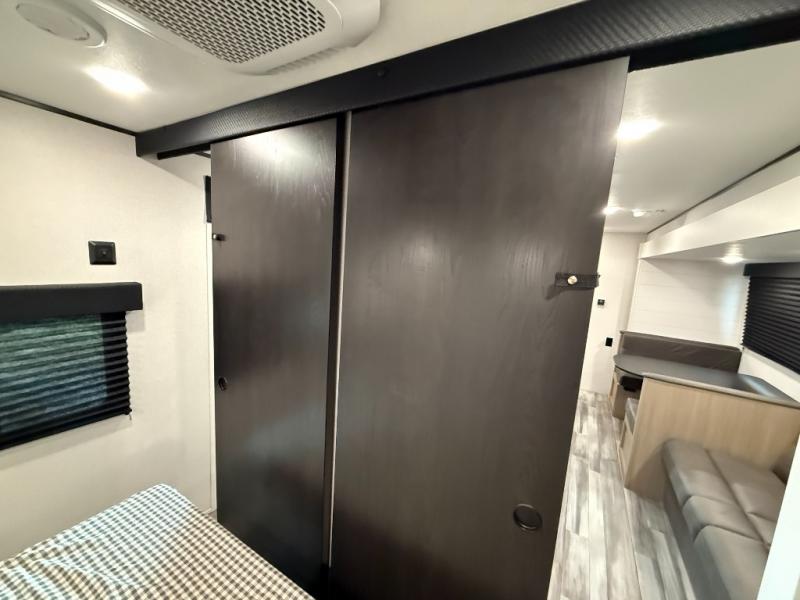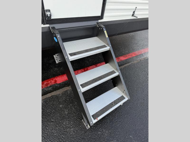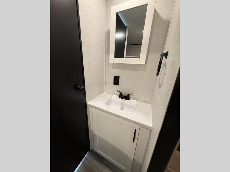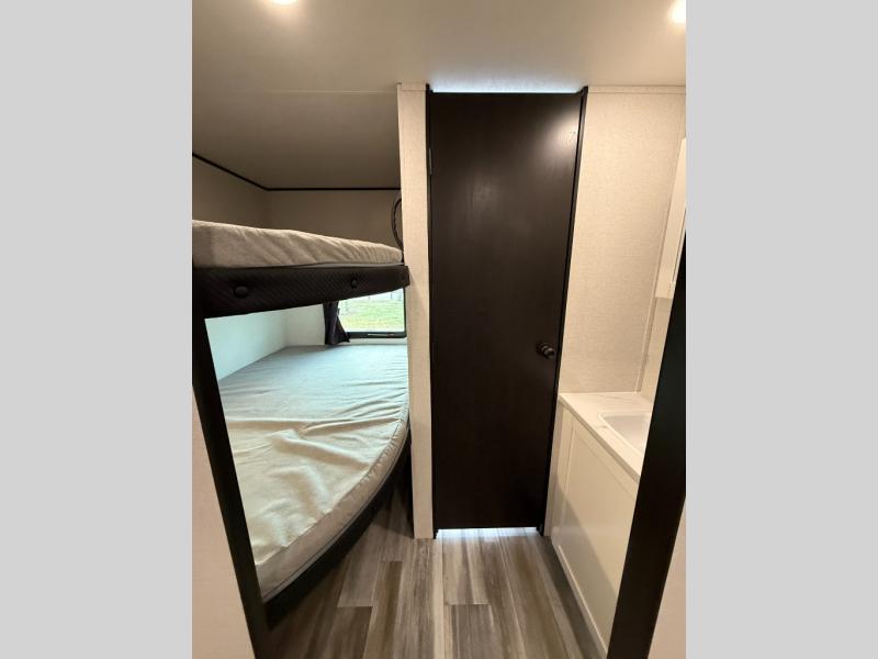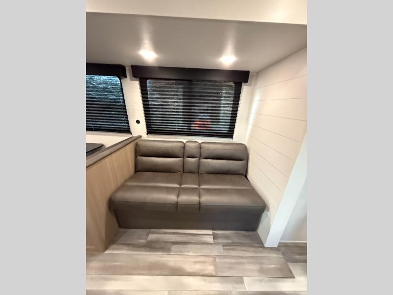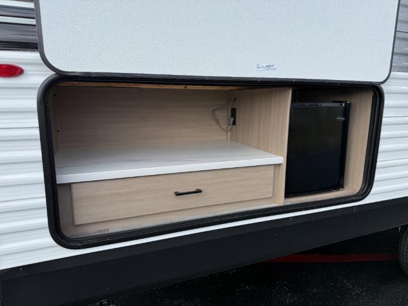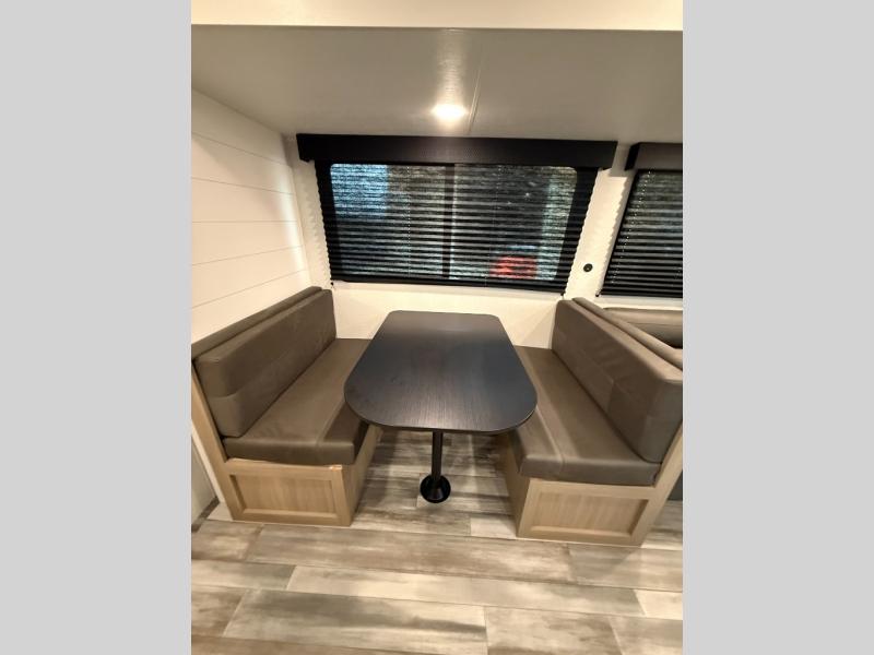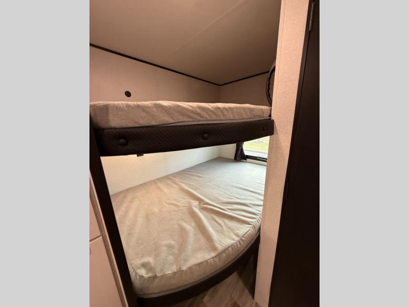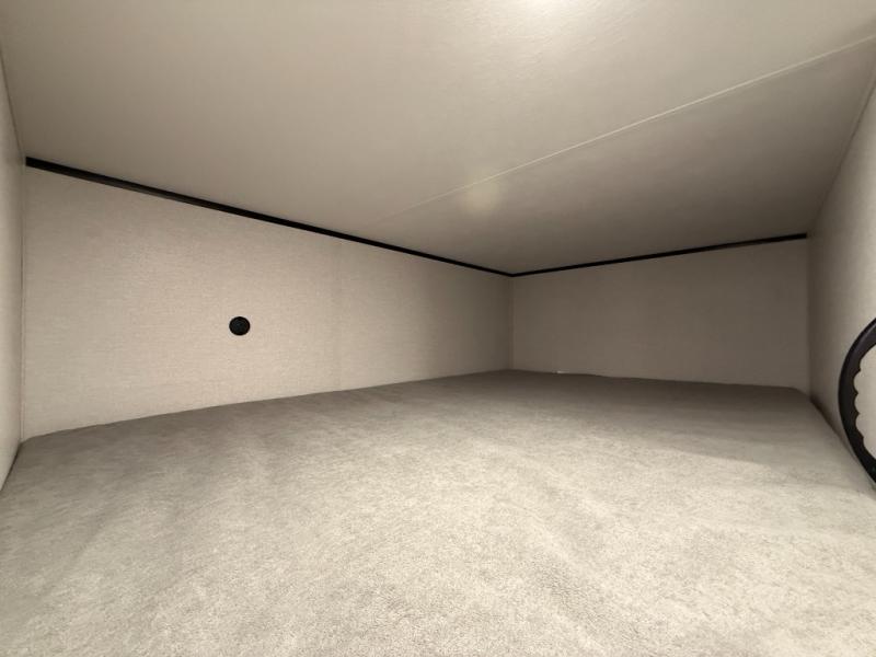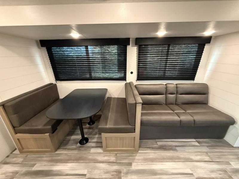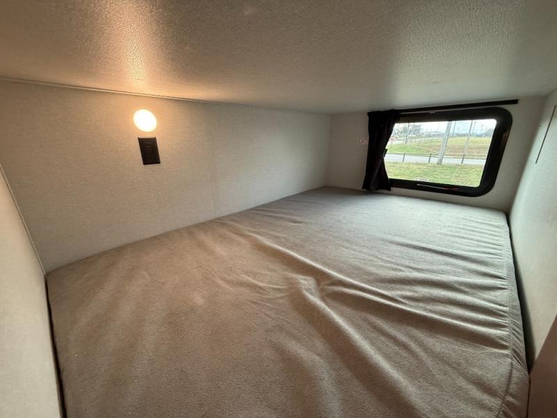 You can comfortably sleep up to ten people in this trailer thanks to the double-size bunks in back, the RV queen bed in the front bedroom, plus the booth dinette and jack-knife sofa in the main living area! The chef of your crew will have a three burner cooktop and microwave oven to prepare meals, and everyone can store their favorite drinks in the 8 cu. ft. 12V refrigerator inside, or in the outdoor refrigerator for convenience. The rear corner bathroom includes a shower and a toilet, with the sink just outside of this room so others can brush their teeth if one is taking a shower before bed. The outside storage is accessible on both sides of the unit and will easily allow you bring along camp chairs, yard games and more. A 16' powered awning with LED lights will create a nice place to gather in the evenings with family and friends!