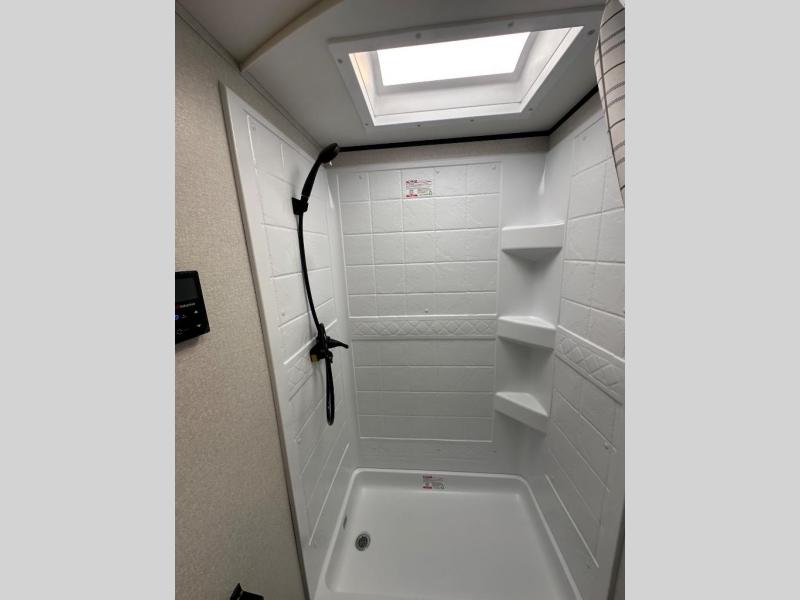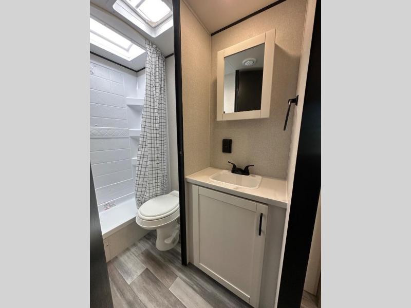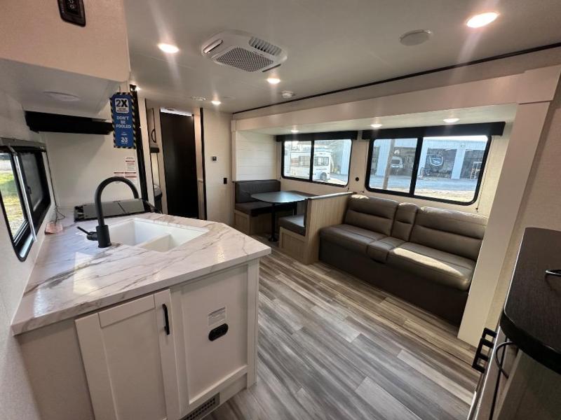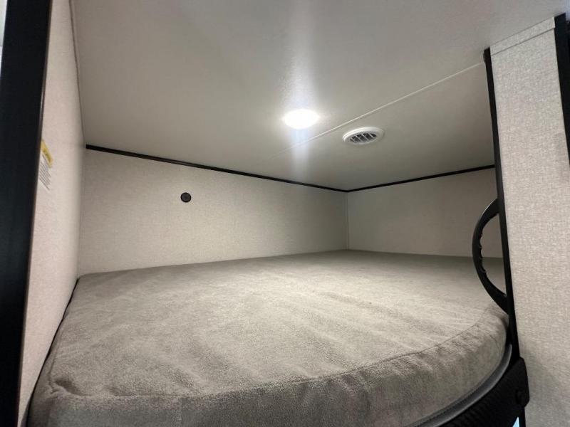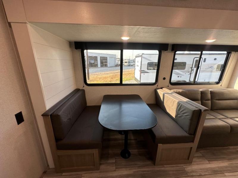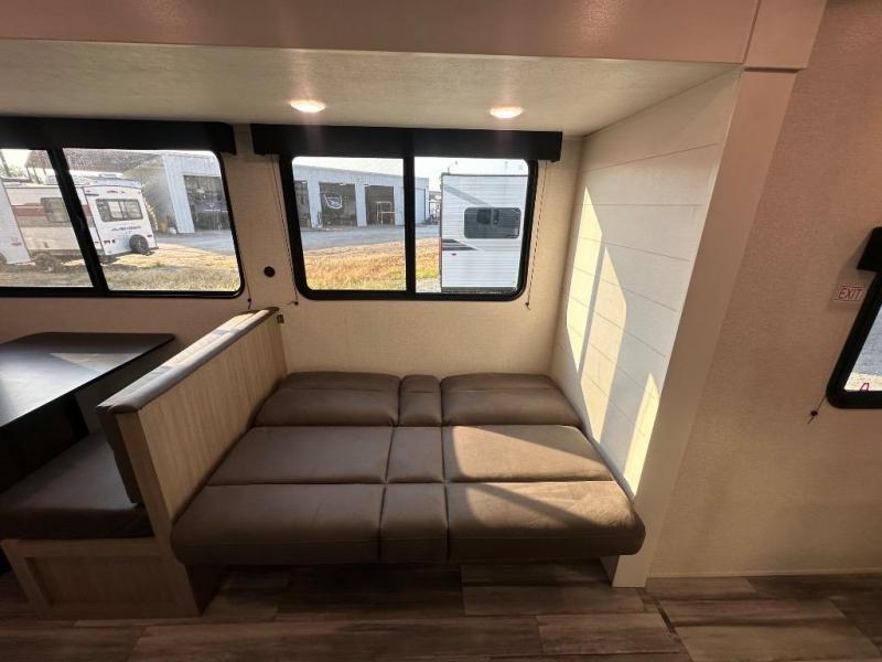 You can comfortably sleep up to ten people in this trailer thanks to the double-size bunks in back, the RV queen bed in the front bedroom, plus the booth dinette and jack-knife sofa in the main living area! The chef of your crew will have a three burner cooktop and microwave oven to prepare meals, and everyone can store their favorite drinks in the 8 cu. ft. 12V refrigerator inside, or in the outdoor refrigerator for convenience. The rear corner bathroom includes a shower and a toilet, with the sink just outside of this room so others can brush their teeth if one is taking a shower before bed. The outside storage is accessible on both sides of the unit and will easily allow you bring along camp chairs, yard games and more. A 16' powered awning with LED lights will create a nice place to gather in the evenings with family and friends!