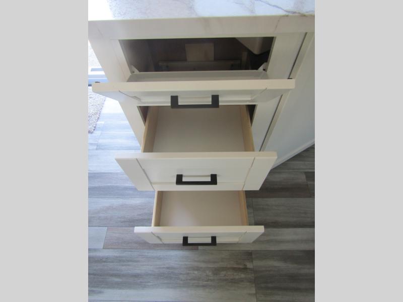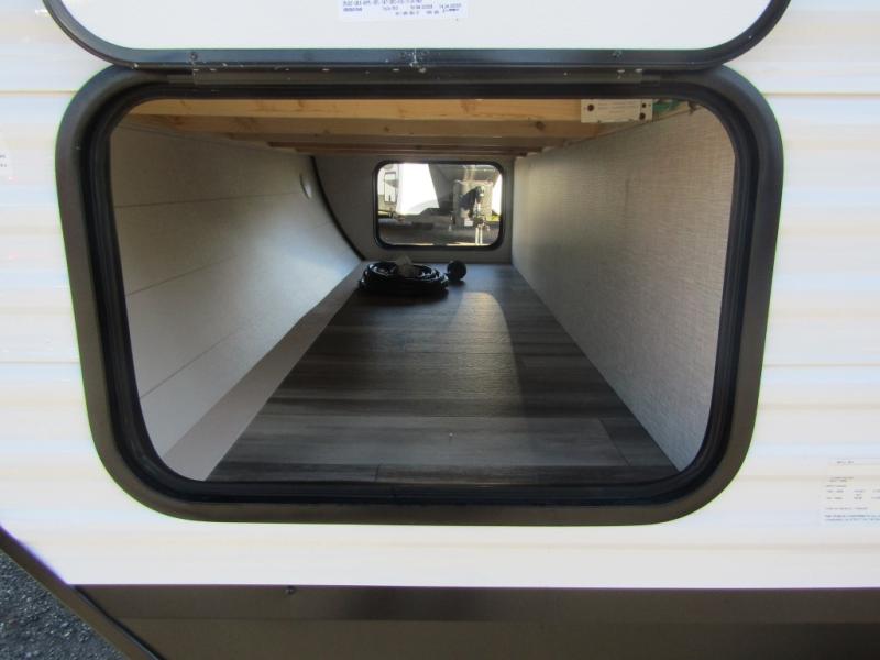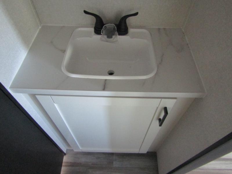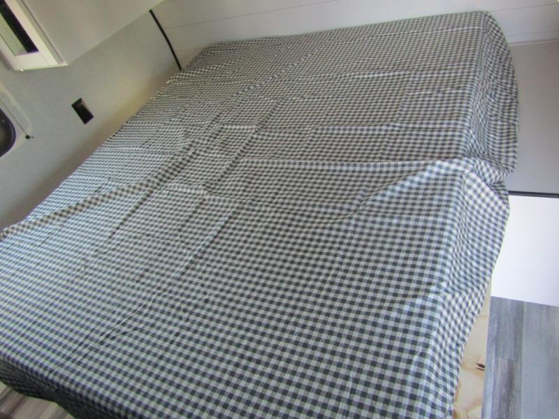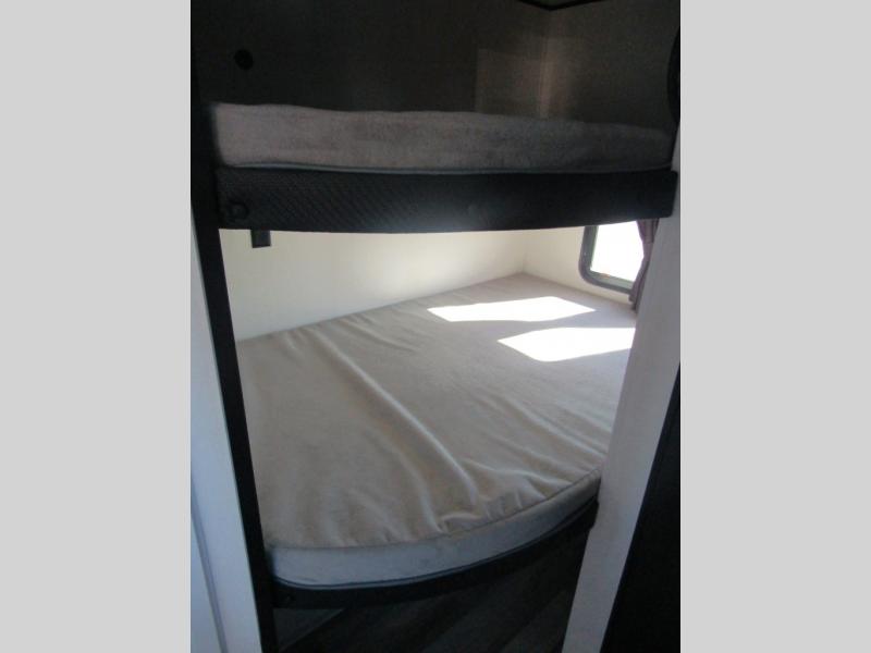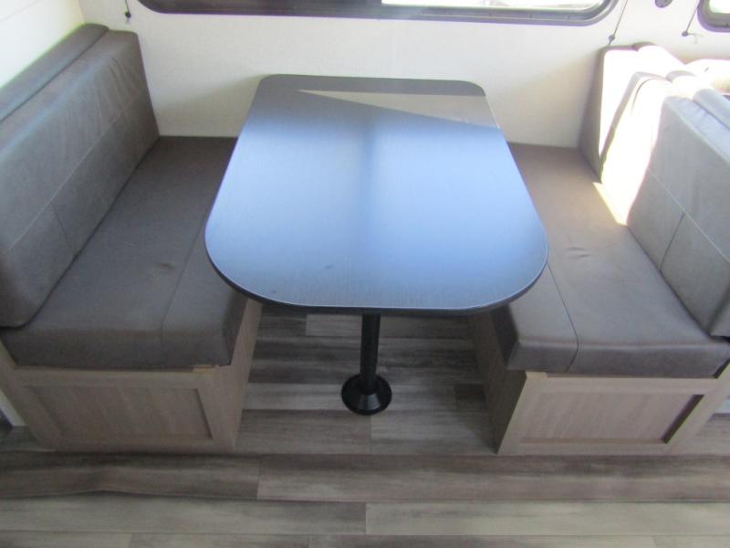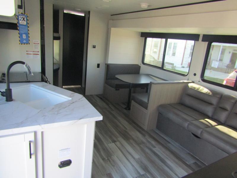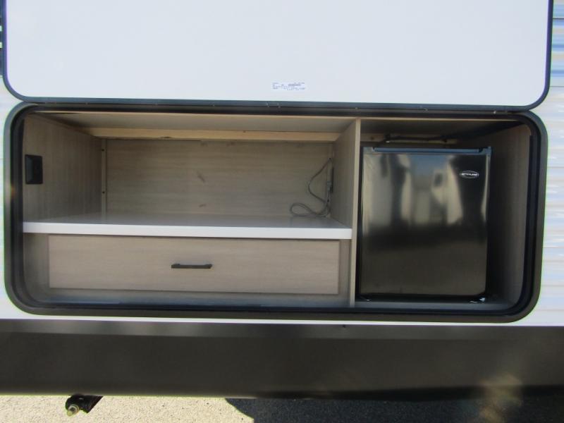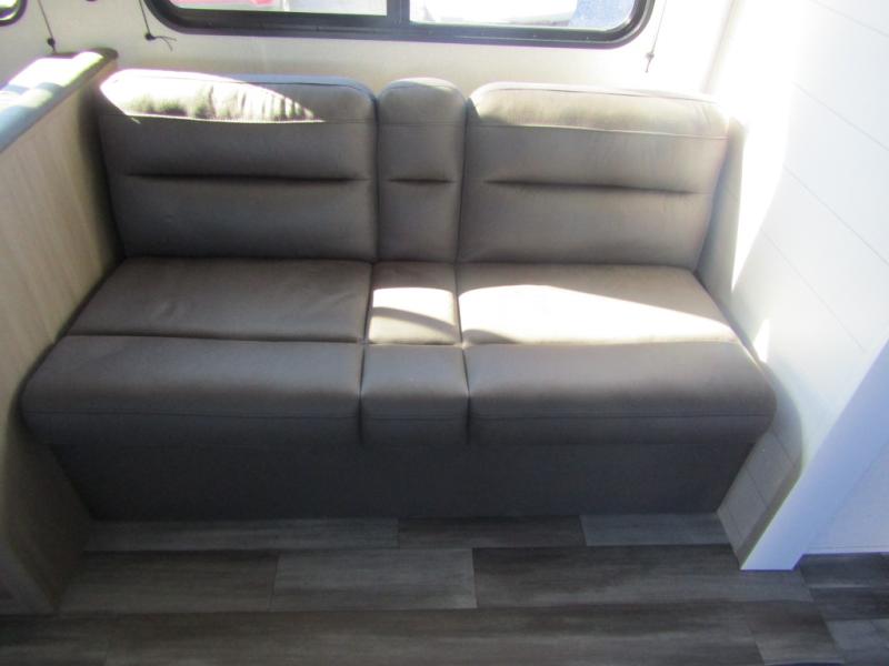 You can comfortably sleep up to ten people in this trailer thanks to the double-size bunks in back, the RV queen bed in the front bedroom, plus the booth dinette and jack-knife sofa in the main living area! The chef of your crew will have a three burner cooktop and microwave oven to prepare meals, and everyone can store their favorite drinks in the 8 cu. ft. 12V refrigerator inside, or in the outdoor refrigerator for convenience. The rear corner bathroom includes a shower and a toilet, with the sink just outside of this room so others can brush their teeth if one is taking a shower before bed. The outside storage is accessible on both sides of the unit and will easily allow you bring along camp chairs, yard games and more. A 16' powered awning with LED lights will create a nice place to gather in the evenings with family and friends!