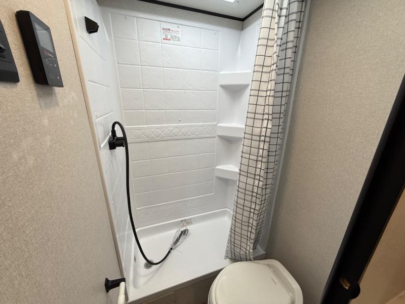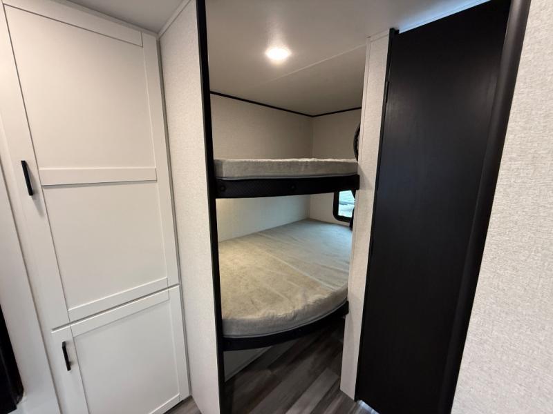 You can comfortably sleep up to ten people in this trailer thanks to the double-size bunks in back, the RV queen bed in the front bedroom, plus the booth dinette and jack-knife sofa in the main living area! The chef of your crew will have a three burner cooktop and microwave oven to prepare meals, and everyone can store their favorite drinks in the 8 cu. ft. 12V refrigerator inside, or in the outdoor refrigerator for convenience. The rear corner bathroom includes a shower and a toilet, with the sink just outside of this room so others can brush their teeth if one is taking a shower before bed. The outside storage is accessible on both sides of the unit and will easily allow you bring along camp chairs, yard games and more. A 16' powered awning with LED lights will create a nice place to gather in the evenings with family and friends!