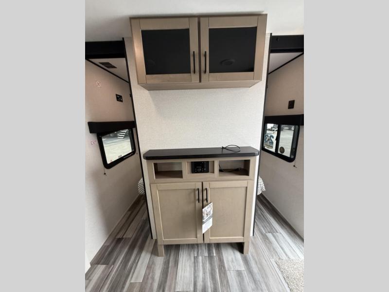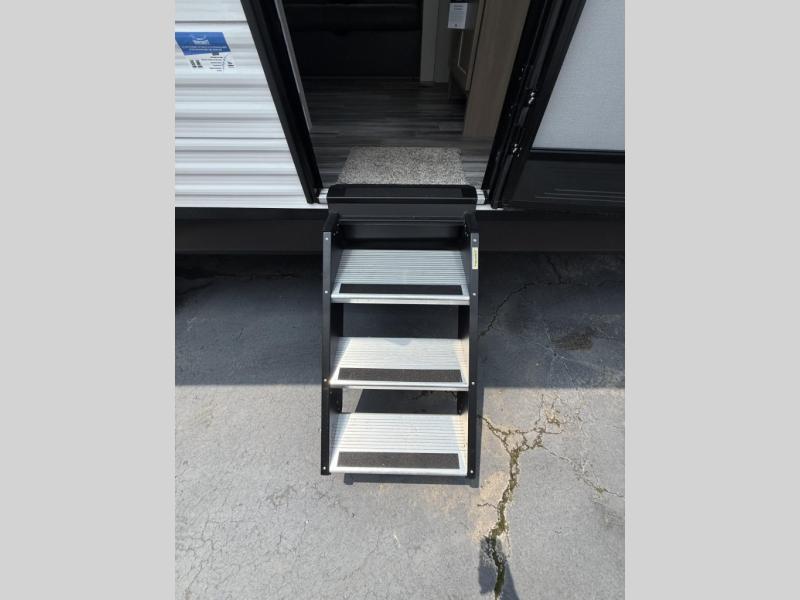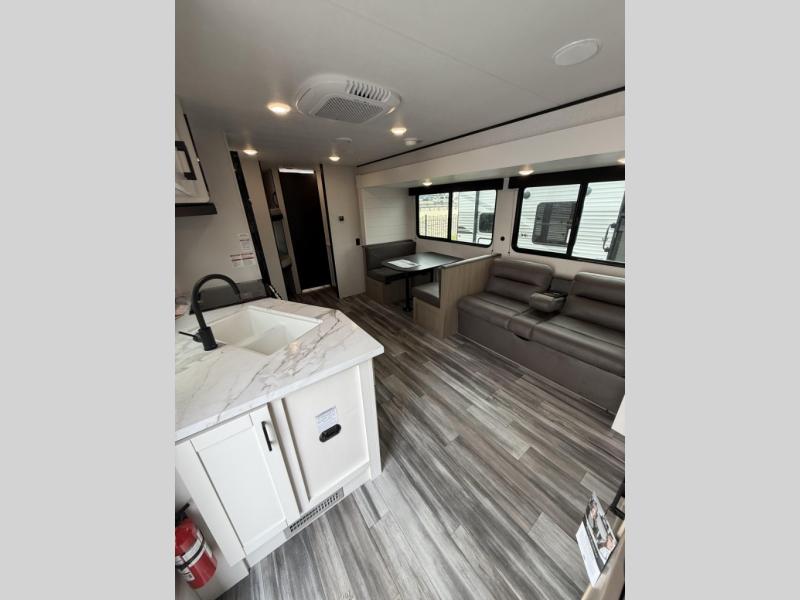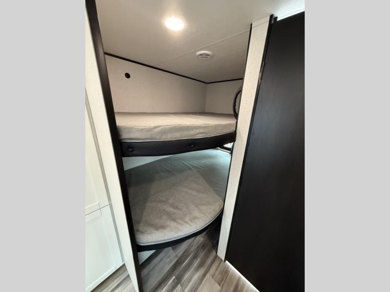 You can comfortably sleep up to ten people in this trailer thanks to the double-size bunks in back, the RV queen bed in the front bedroom, plus the booth dinette and jack-knife sofa in the main living area! The chef of your crew will have a three burner cooktop and microwave oven to prepare meals, and everyone can store their favorite drinks in the 8 cu. ft. 12V refrigerator inside, or in the outdoor refrigerator for convenience. The rear corner bathroom includes a shower and a toilet, with the sink just outside of this room so others can brush their teeth if one is taking a shower before bed. The outside storage is accessible on both sides of the unit and will easily allow you bring along camp chairs, yard games and more. A 16' powered awning with LED lights will create a nice place to gather in the evenings with family and friends!