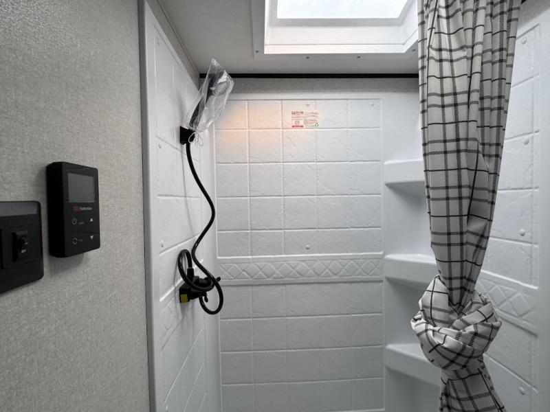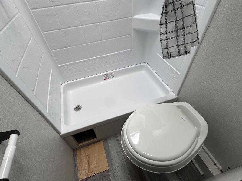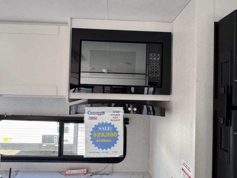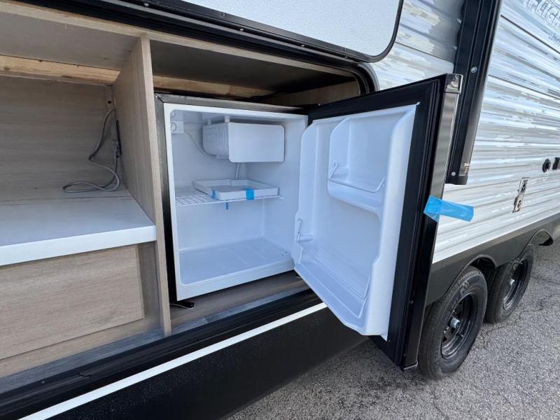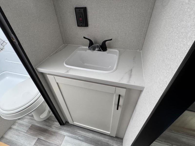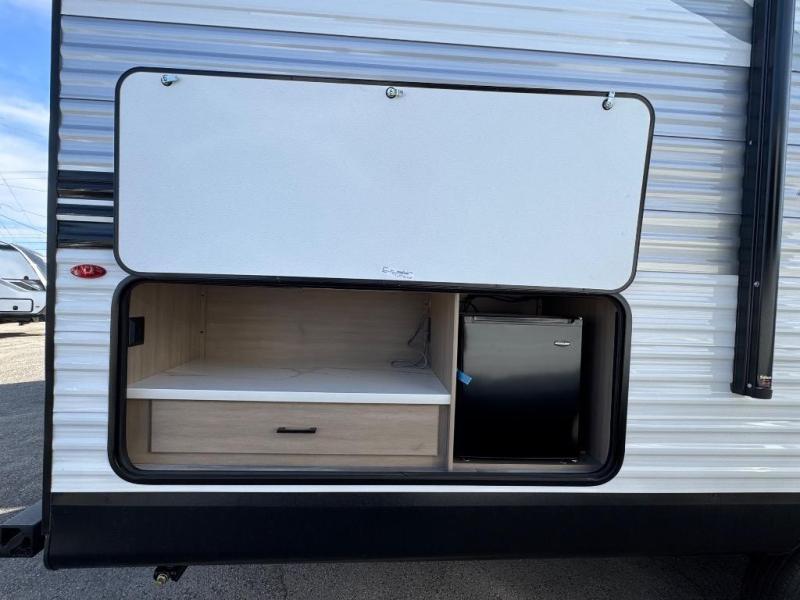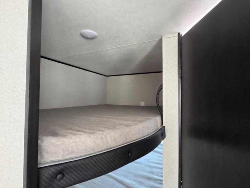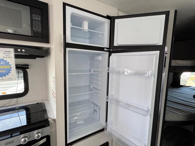 You can comfortably sleep up to ten people in this trailer thanks to the double-size bunks in back, the RV queen bed in the front bedroom, plus the booth dinette and jack-knife sofa in the main living area! The chef of your crew will have a three burner cooktop and microwave oven to prepare meals, and everyone can store their favorite drinks in the 8 cu. ft. 12V refrigerator inside, or in the outdoor refrigerator for convenience. The rear corner bathroom includes a shower and a toilet, with the sink just outside of this room so others can brush their teeth if one is taking a shower before bed. The outside storage is accessible on both sides of the unit and will easily allow you bring along camp chairs, yard games and more. A 16' powered awning with LED lights will create a nice place to gather in the evenings with family and friends!