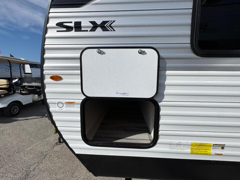 The Jayco Jay Flight SLX travel trailer is quite easy to own because it is lightweight for an easier towing experience. Built on a fully integrated A-frame with galvanized-steel, impact-resistant wheel wells, the Jay Flight SLX has quality at its very foundation. That quality continues on to the electric self-adjusting brakes, easy-lube hubs, Magnum Truss roof system, and LP quick connect. Some of what the mandatory Customer Value Package includes is backup camera prep, Keyed-Alike entry and baggage doors, and an on-demand tankless water heater.