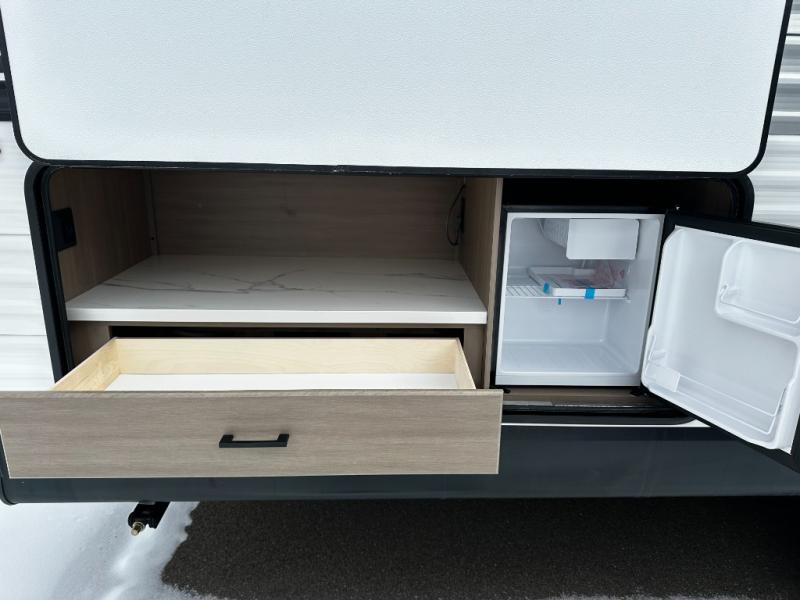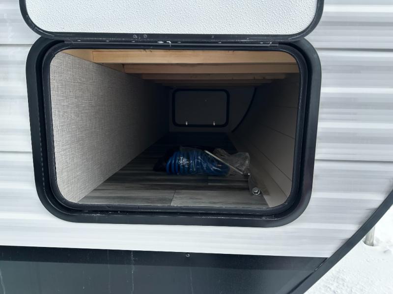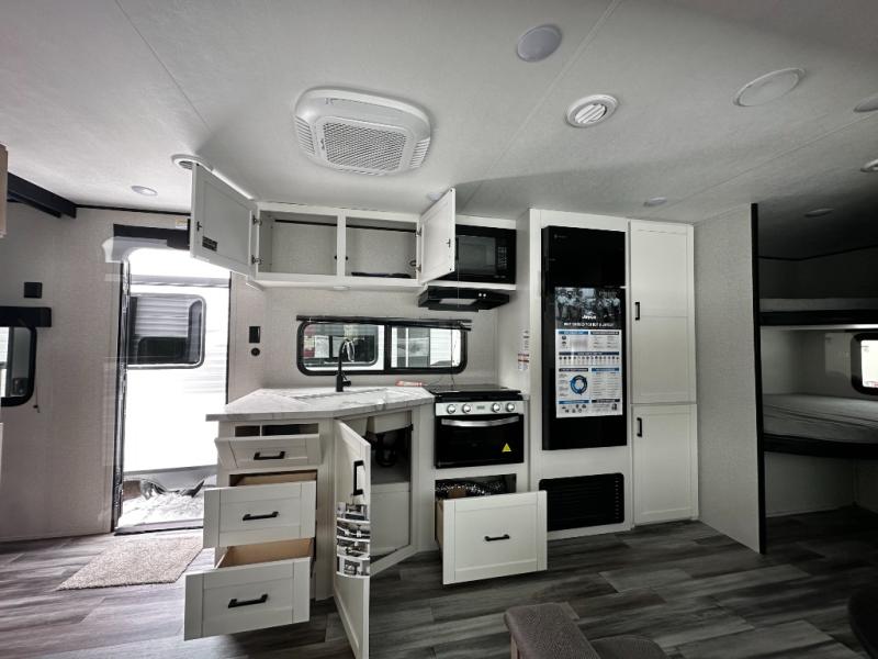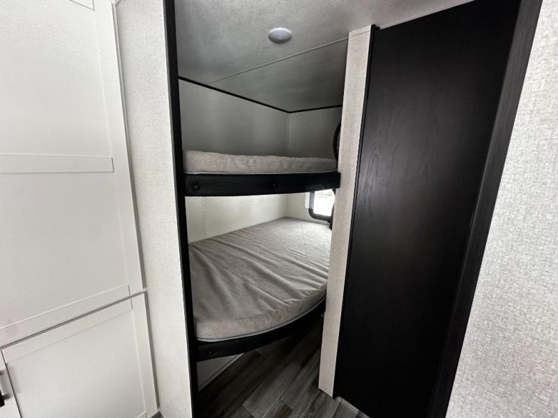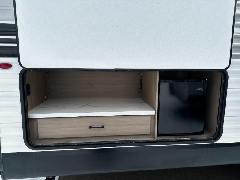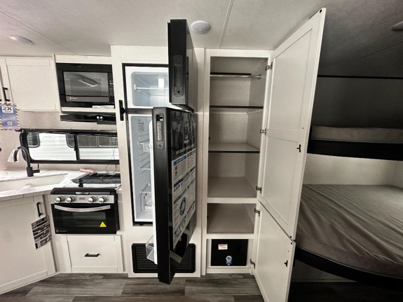 You can comfortably sleep up to ten people in this trailer thanks to the double-size bunks in back, the RV queen bed in the front bedroom, plus the booth dinette and jack-knife sofa in the main living area! The chef of your crew will have a three burner cooktop and microwave oven to prepare meals, and everyone can store their favorite drinks in the 8 cu. ft. 12V refrigerator inside, or in the outdoor refrigerator for convenience. The rear corner bathroom includes a shower and a toilet, with the sink just outside of this room so others can brush their teeth if one is taking a shower before bed. The outside storage is accessible on both sides of the unit and will easily allow you bring along camp chairs, yard games and more. A 16' powered awning with LED lights will create a nice place to gather in the evenings with family and friends!