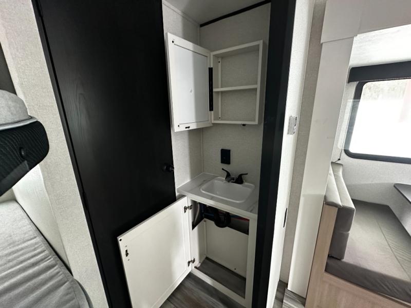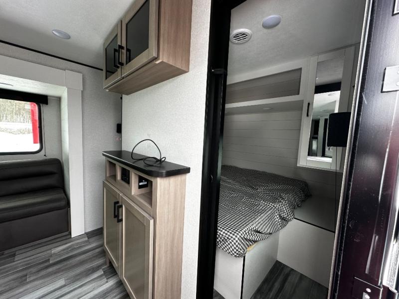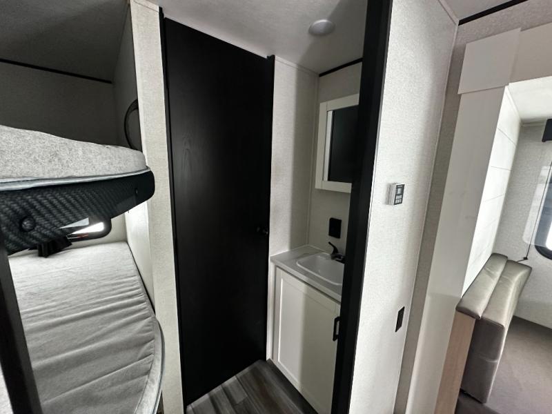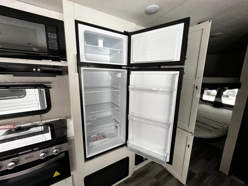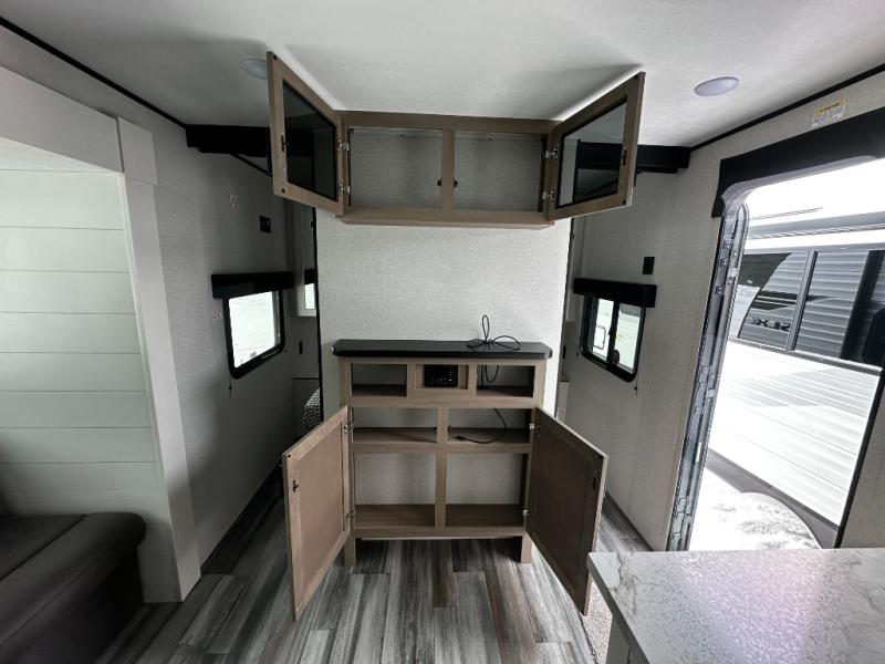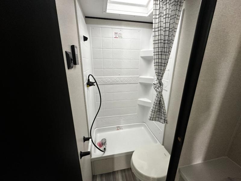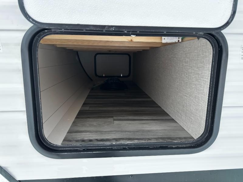You can comfortably sleep up to ten people in this trailer thanks to the double-size bunks in back, the RV queen bed in the front bedroom, plus the booth dinette and jack-knife sofa in the main living area! The chef of your crew will have a three burner cooktop and microwave oven to prepare meals, and everyone can store their favorite drinks in the 8 cu. ft. 12V refrigerator inside, or in the outdoor refrigerator for convenience. The rear corner bathroom includes a shower and a toilet, with the sink just outside of this room so others can brush their teeth if one is taking a shower before bed. The outside storage is accessible on both sides of the unit and will easily allow you bring along camp chairs, yard games and more. A 16' powered awning with LED lights will create a nice place to gather in the evenings with family and friends!