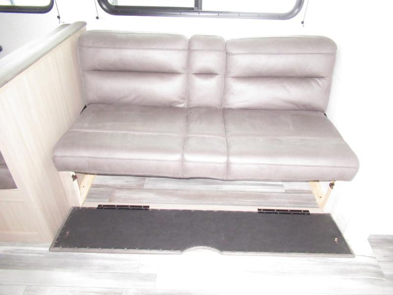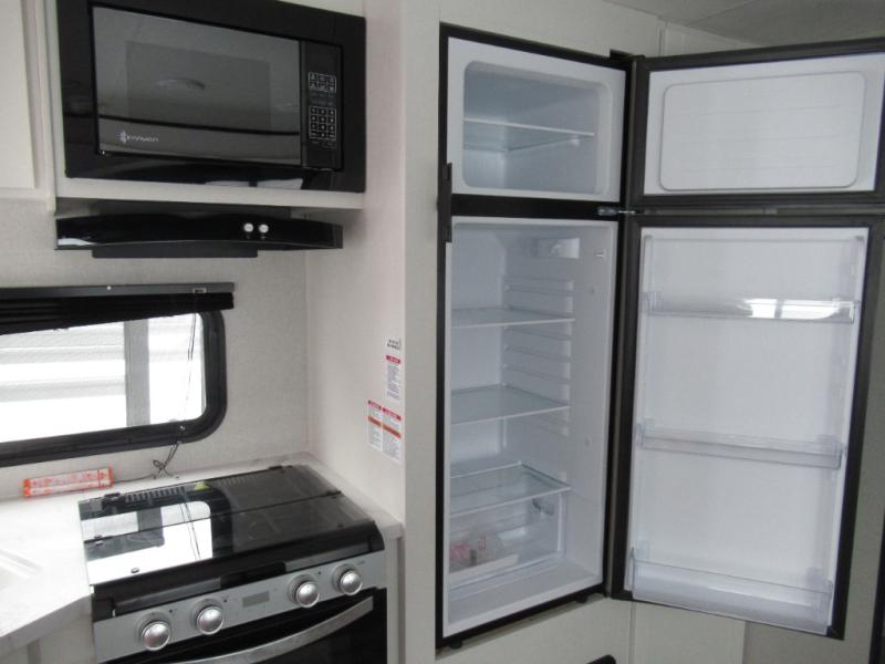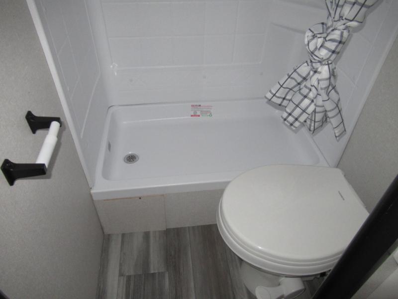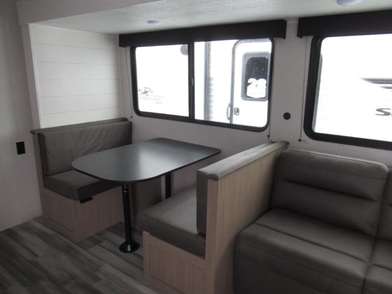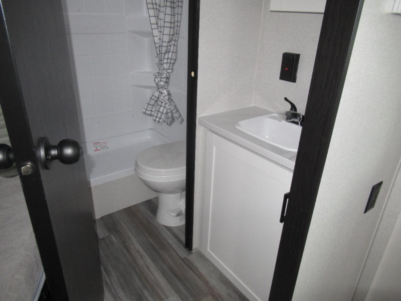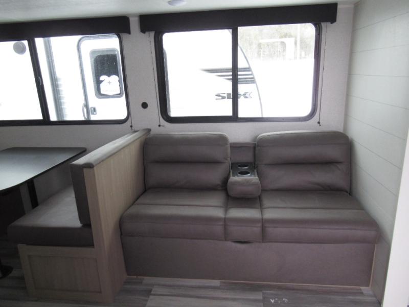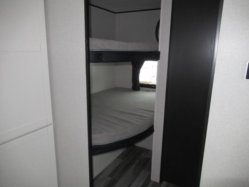 You can comfortably sleep up to ten people in this trailer thanks to the double-size bunks in back, the RV queen bed in the front bedroom, plus the booth dinette and jack-knife sofa in the main living area! The chef of your crew will have a three burner cooktop and microwave oven to prepare meals, and everyone can store their favorite drinks in the 8 cu. ft. 12V refrigerator inside, or in the outdoor refrigerator for convenience. The rear corner bathroom includes a shower and a toilet, with the sink just outside of this room so others can brush their teeth if one is taking a shower before bed. The outside storage is accessible on both sides of the unit and will easily allow you bring along camp chairs, yard games and more. A 16' powered awning with LED lights will create a nice place to gather in the evenings with family and friends!