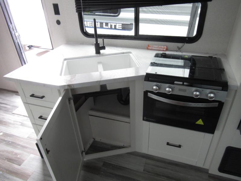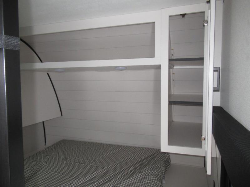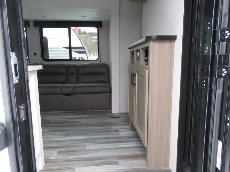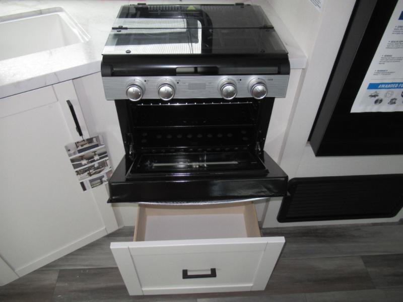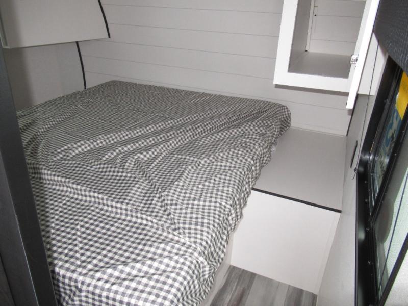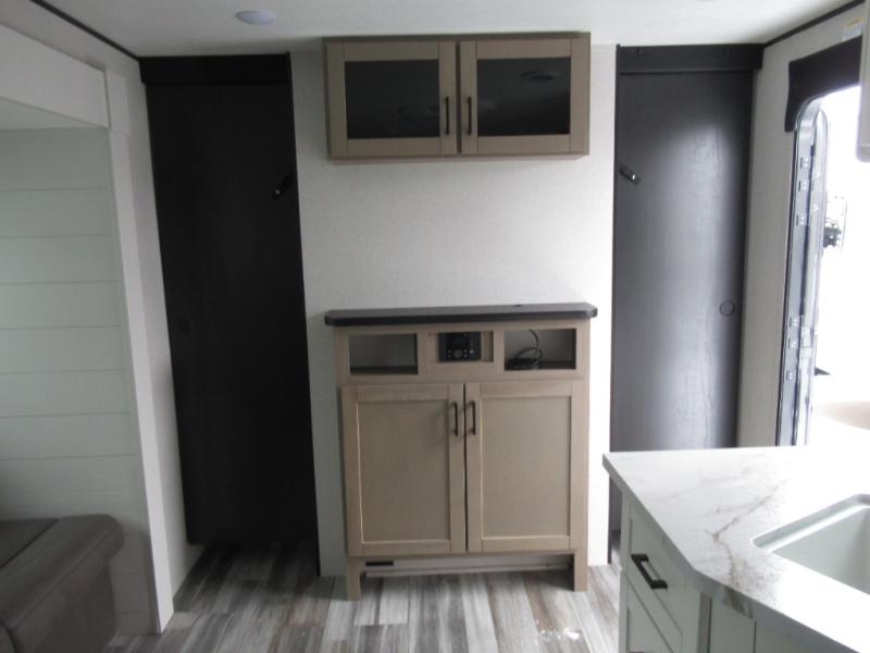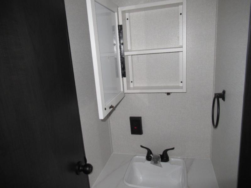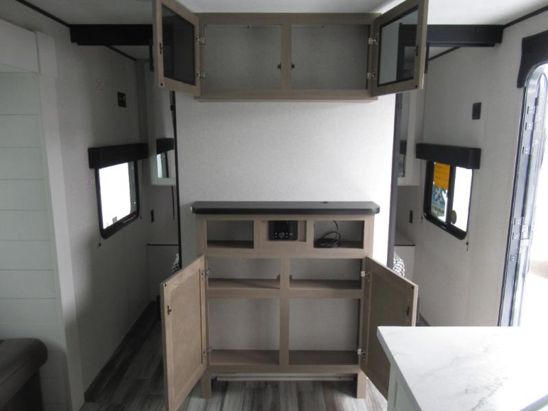 You can comfortably sleep up to ten people in this trailer thanks to the double-size bunks in back, the RV queen bed in the front bedroom, plus the booth dinette and jack-knife sofa in the main living area! The chef of your crew will have a three burner cooktop and microwave oven to prepare meals, and everyone can store their favorite drinks in the 8 cu. ft. 12V refrigerator inside, or in the outdoor refrigerator for convenience. The rear corner bathroom includes a shower and a toilet, with the sink just outside of this room so others can brush their teeth if one is taking a shower before bed. The outside storage is accessible on both sides of the unit and will easily allow you bring along camp chairs, yard games and more. A 16' powered awning with LED lights will create a nice place to gather in the evenings with family and friends!