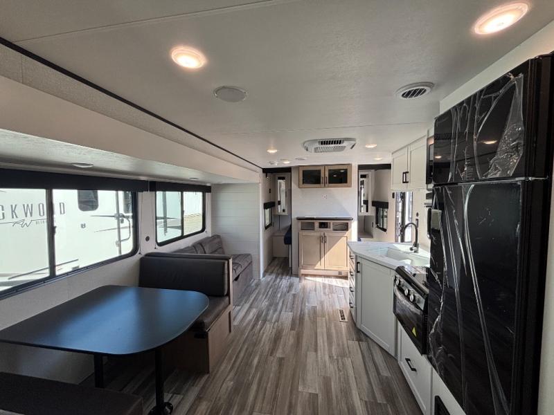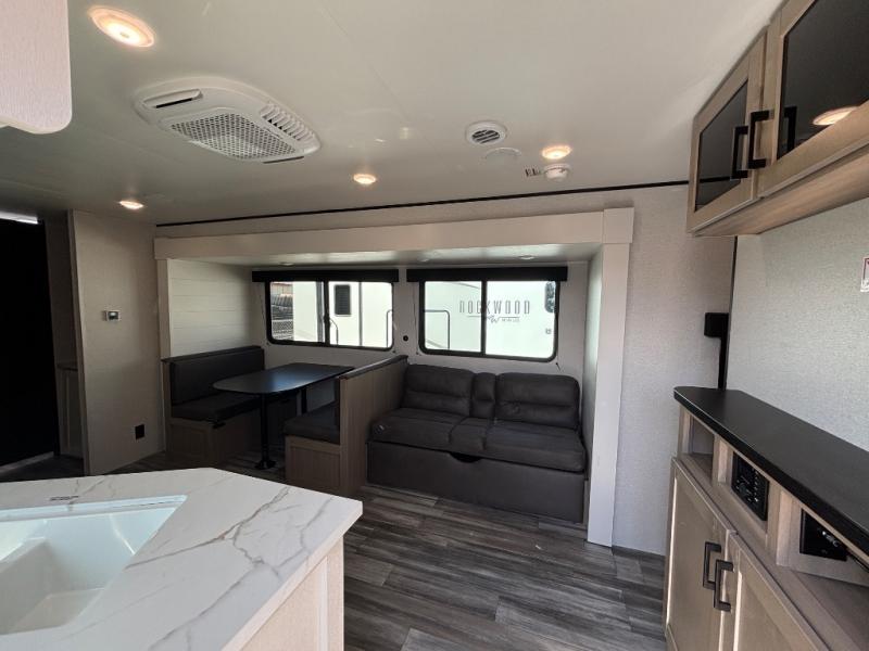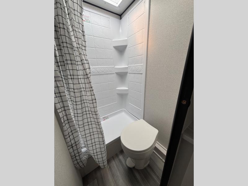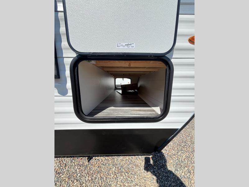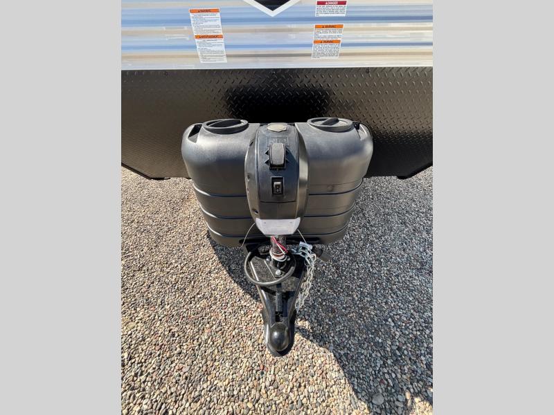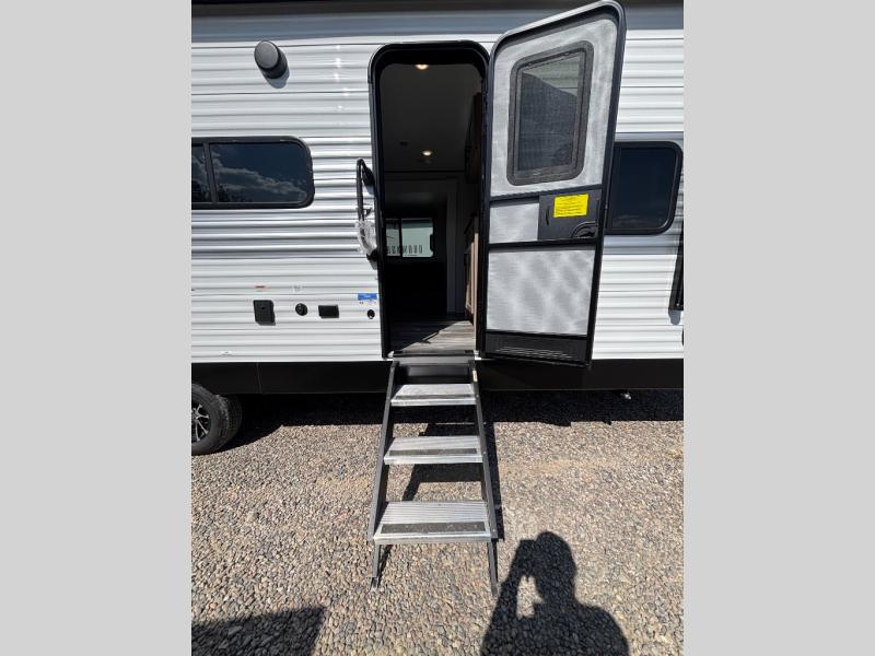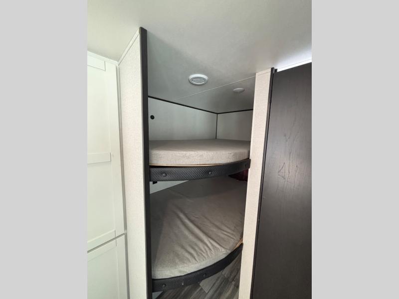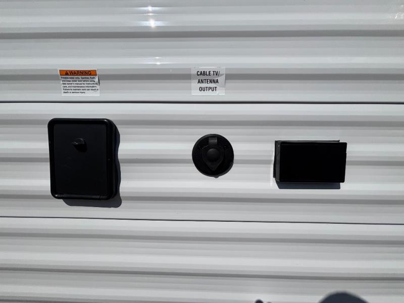 You can comfortably sleep up to ten people in this trailer thanks to the double-size bunks, the RV queen bed in the front bedroom, plus the booth dinette and jack-knife sofa in the main living area! The chef of your crew will have a three burner cooktop and microwave oven to prepare meals, and everyone can store their favorite drinks in the 8 cu. ft. 12V refrigerator inside, or in the outdoor refrigerator for convenience. The rear corner bathroom includes a shower and a toilet, with the sink just outside of this room so others can brush their teeth if one is taking a shower before bed. The outside storage is accessible on both sides of the unit and will easily allow you bring along camp chairs, yard games and more. A 16' powered awning with LED lights will create a nice place to gather in the evenings with family and friends!