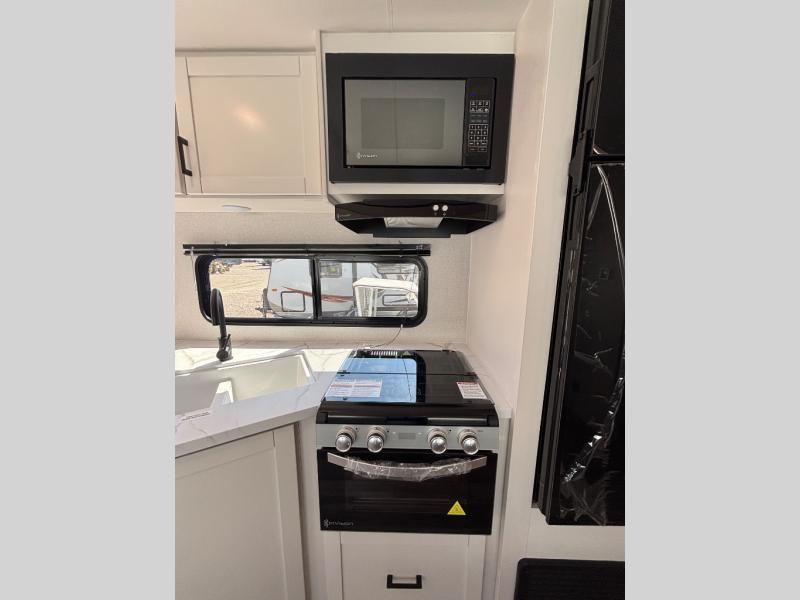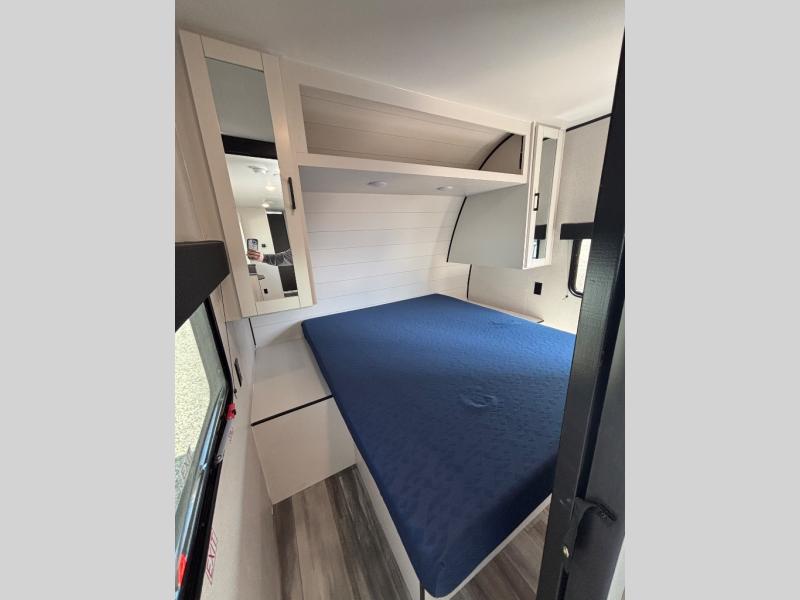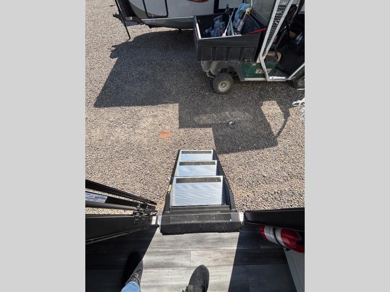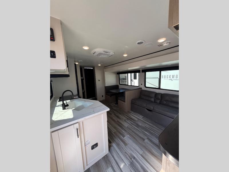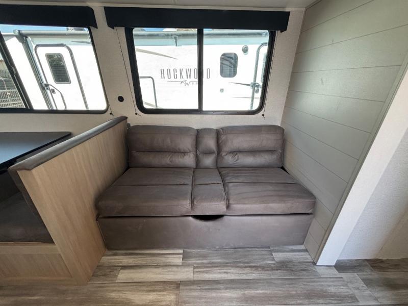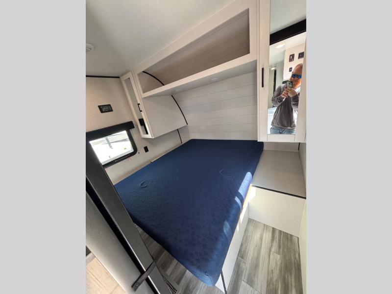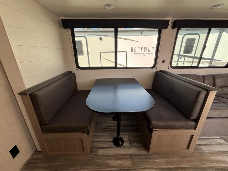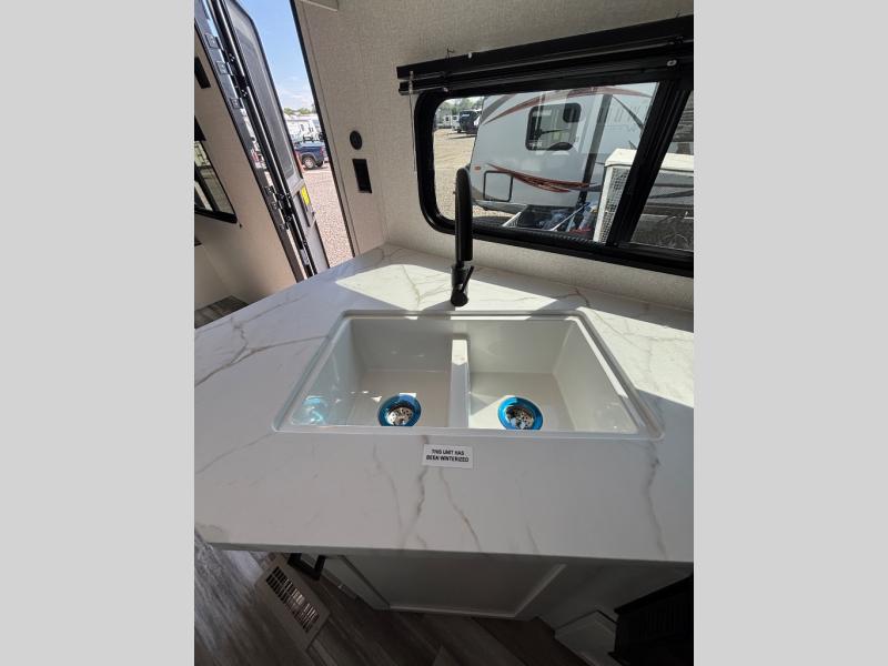 You can comfortably sleep up to ten people in this trailer thanks to the double-size bunks, the RV queen bed in the front bedroom, plus the booth dinette and jack-knife sofa in the main living area! The chef of your crew will have a three burner cooktop and microwave oven to prepare meals, and everyone can store their favorite drinks in the 8 cu. ft. 12V refrigerator inside, or in the outdoor refrigerator for convenience. The rear corner bathroom includes a shower and a toilet, with the sink just outside of this room so others can brush their teeth if one is taking a shower before bed. The outside storage is accessible on both sides of the unit and will easily allow you bring along camp chairs, yard games and more. A 16' powered awning with LED lights will create a nice place to gather in the evenings with family and friends!