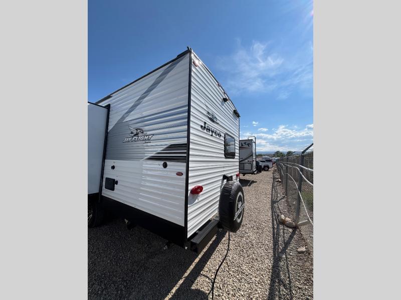 The Jayco Jay Flight SLX travel trailer is quite easy to own because it is lightweight for an easier towing experience. Built on a fully integrated A-frame with galvanized-steel, impact-resistant wheel wells, the Jay Flight SLX has quality at its very foundation. That quality continues on to the electric self-adjusting brakes, easy-lube hubs, Magnum Truss roof system, and LP quick connect. Some of what the mandatory Customer Value Package includes is backup camera prep, Keyed-Alike entry and baggage doors, and an on-demand tankless water heater.
