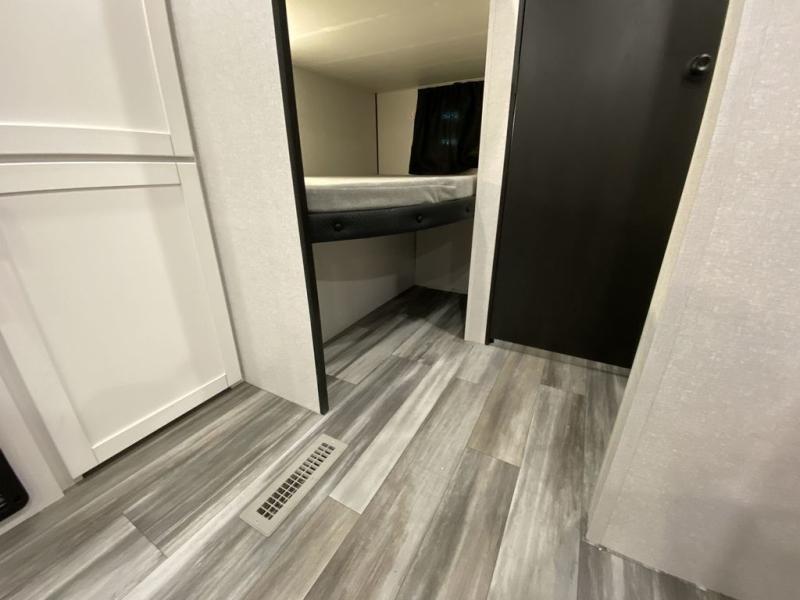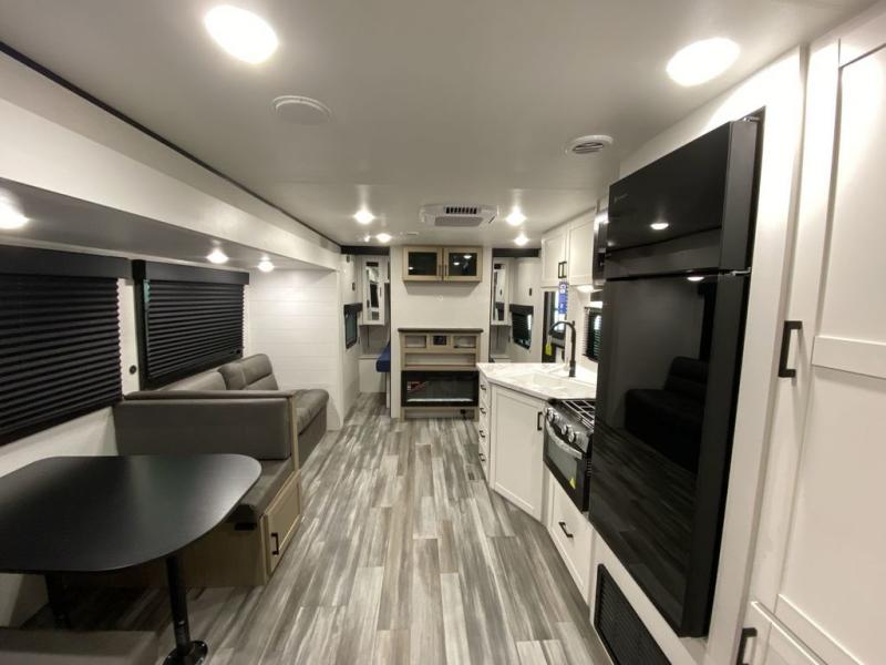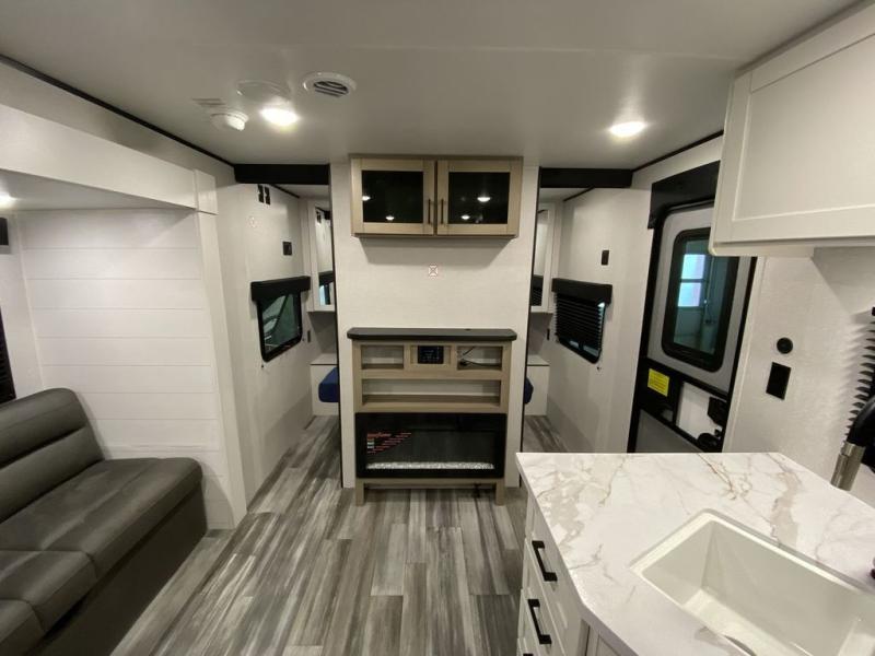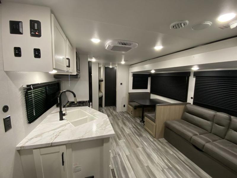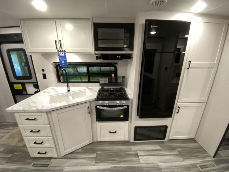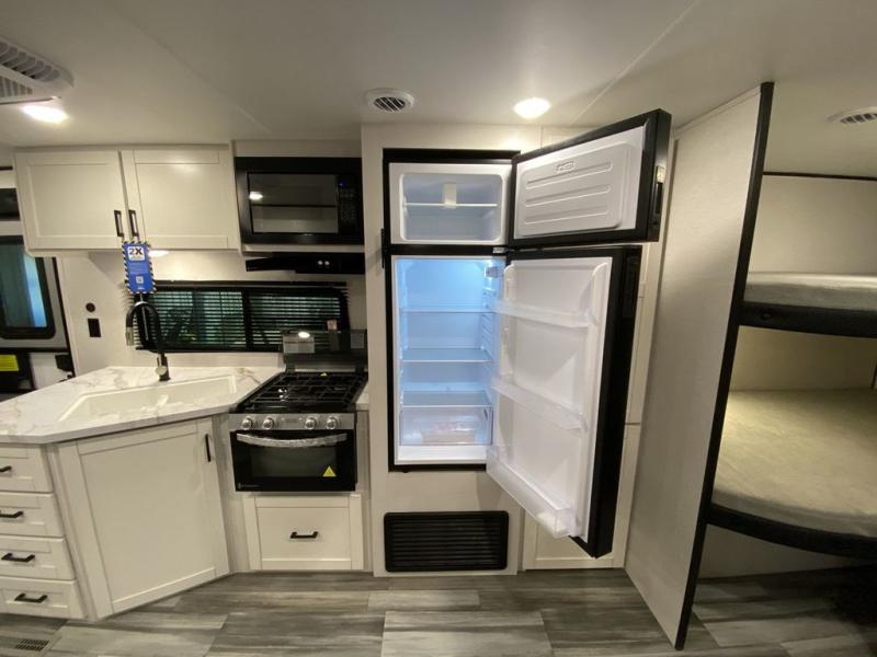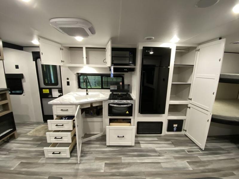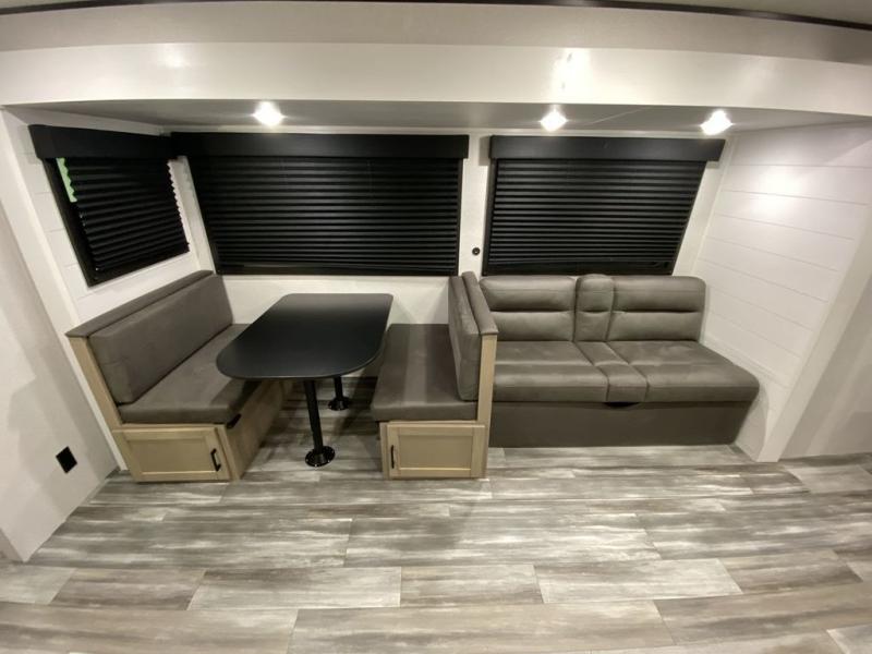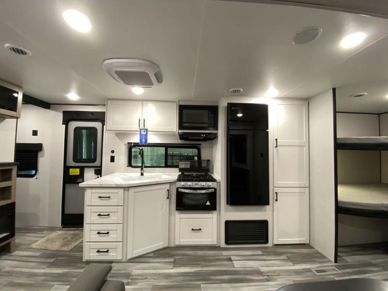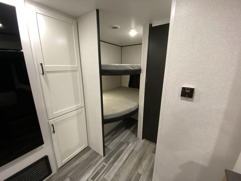 You can comfortably sleep up to ten people in this trailer thanks to the double-size bunks, the RV queen bed in the front bedroom, plus the booth dinette and jack-knife sofa in the main living area! The chef of your crew will have a three burner cooktop and microwave oven to prepare meals, and everyone can store their favorite drinks in the 8 cu. ft. 12V refrigerator inside, or in the outdoor refrigerator for convenience. The rear corner bathroom includes a shower and a toilet, with the sink just outside of this room so others can brush their teeth if one is taking a shower before bed. The outside storage is accessible on both sides of the unit and will easily allow you bring along camp chairs, yard games and more. A 16' powered awning with LED lights will create a nice place to gather in the evenings with family and friends!