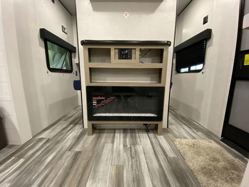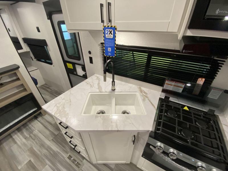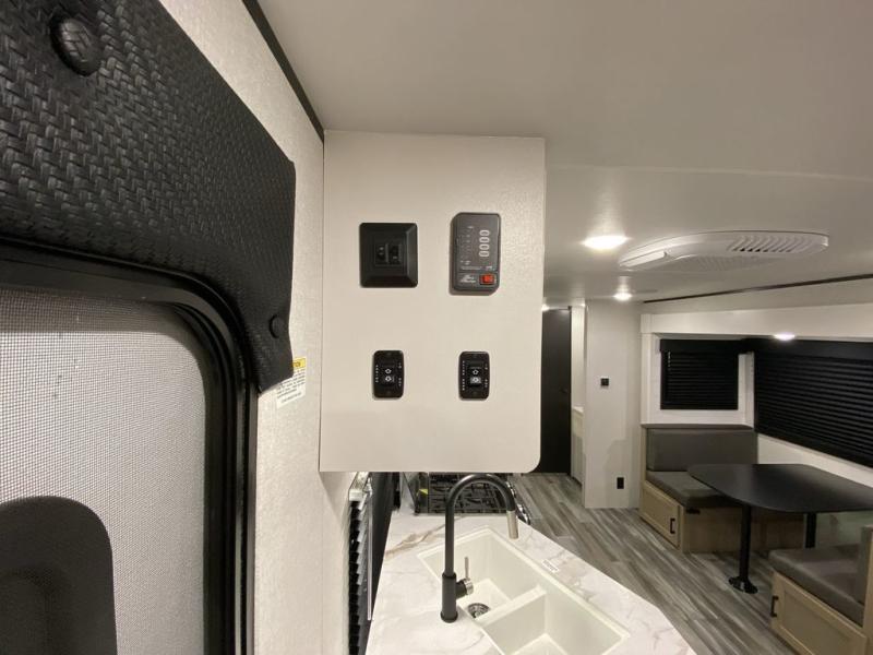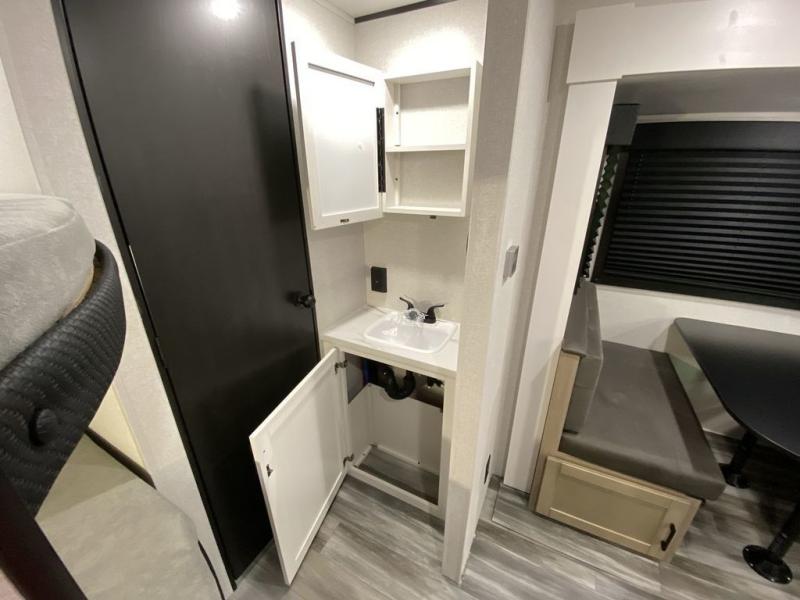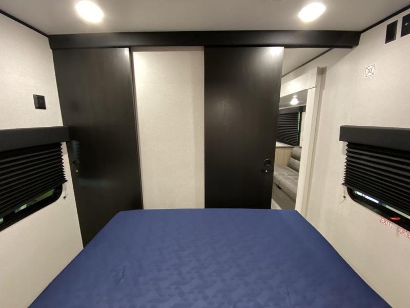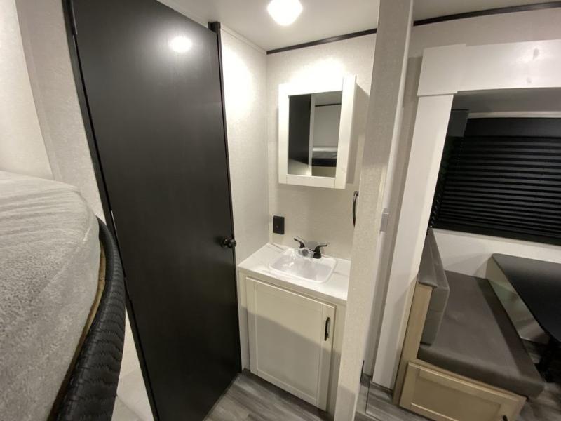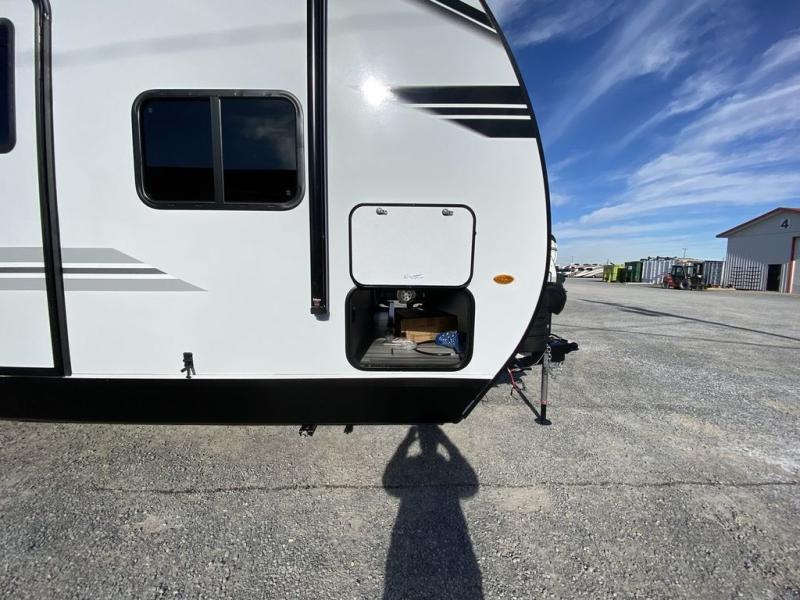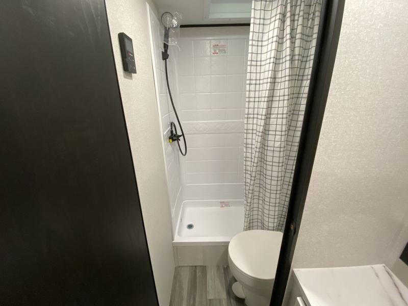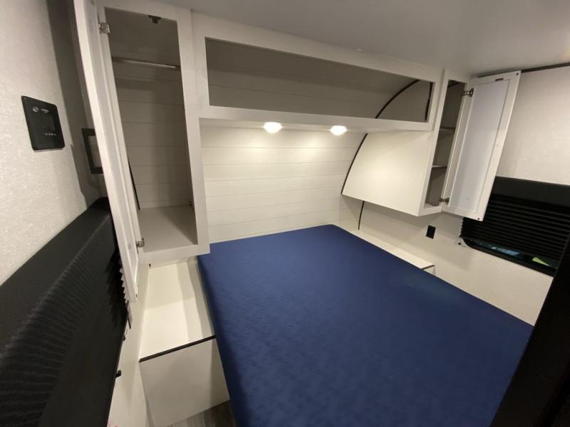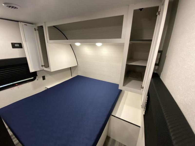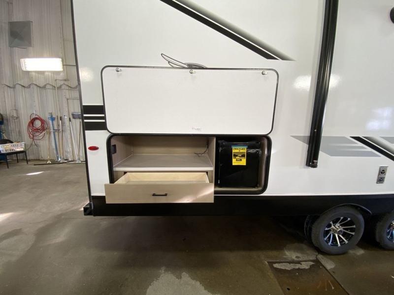 You can comfortably sleep up to ten people in this trailer thanks to the double-size bunks, the RV queen bed in the front bedroom, plus the booth dinette and jack-knife sofa in the main living area! The chef of your crew will have a three burner cooktop and microwave oven to prepare meals, and everyone can store their favorite drinks in the 8 cu. ft. 12V refrigerator inside, or in the outdoor refrigerator for convenience. The rear corner bathroom includes a shower and a toilet, with the sink just outside of this room so others can brush their teeth if one is taking a shower before bed. The outside storage is accessible on both sides of the unit and will easily allow you bring along camp chairs, yard games and more. A 16' powered awning with LED lights will create a nice place to gather in the evenings with family and friends!