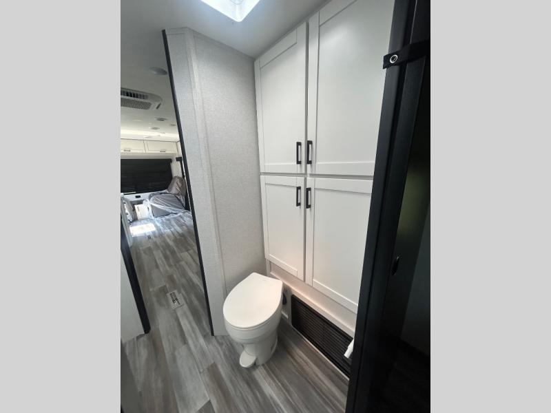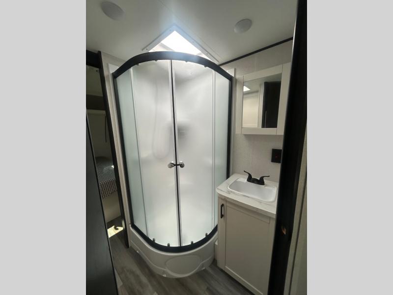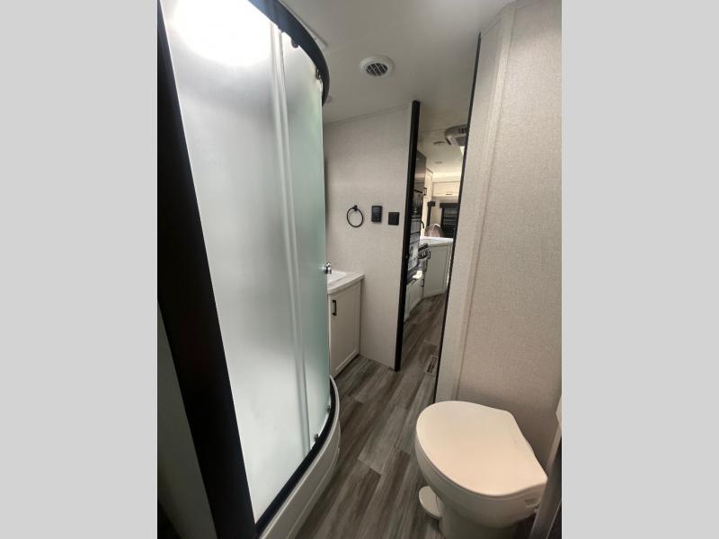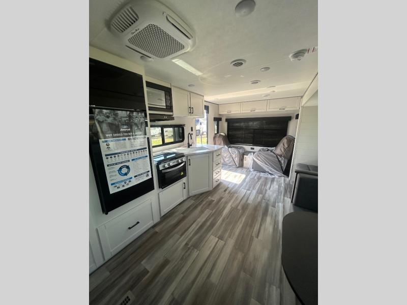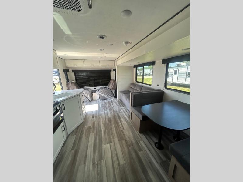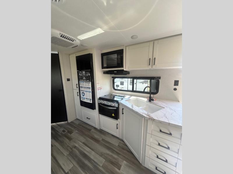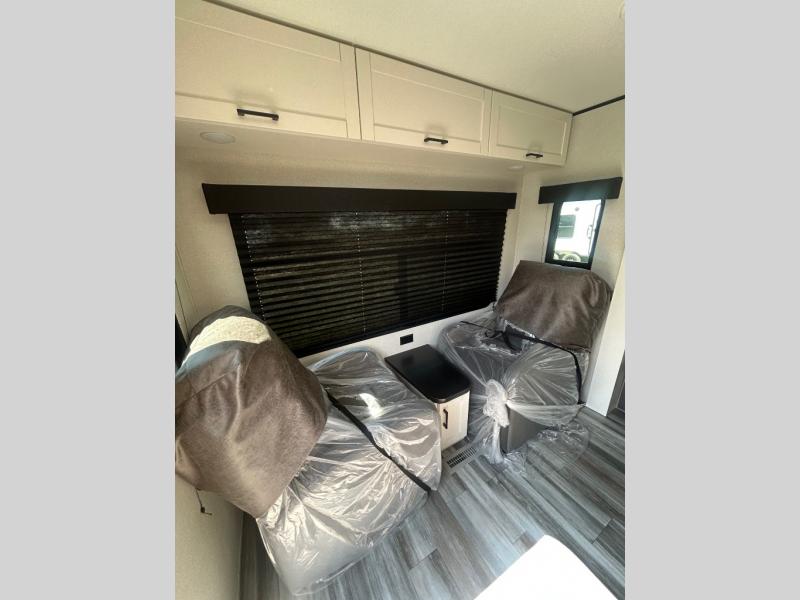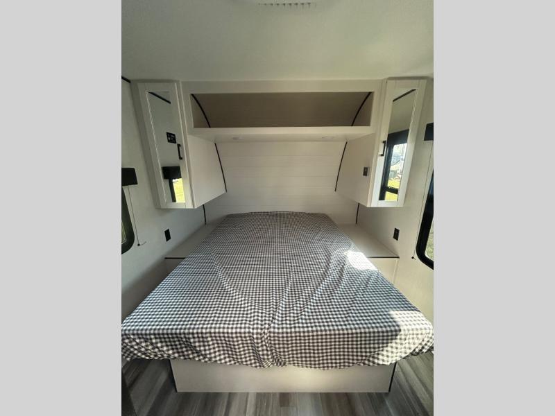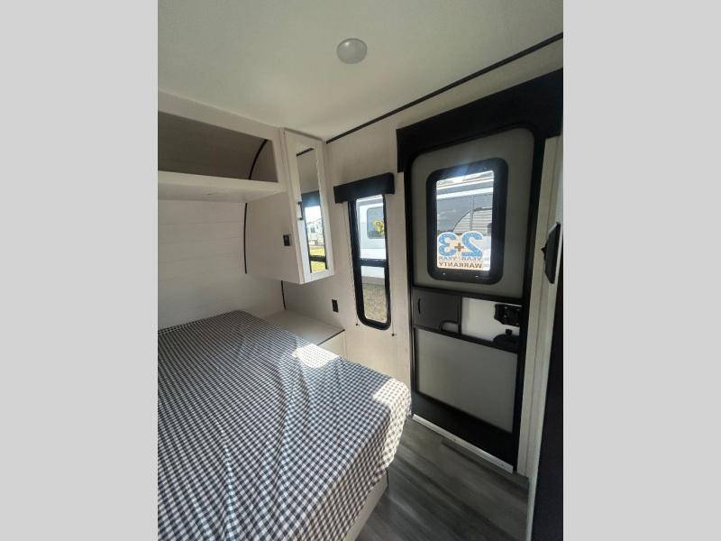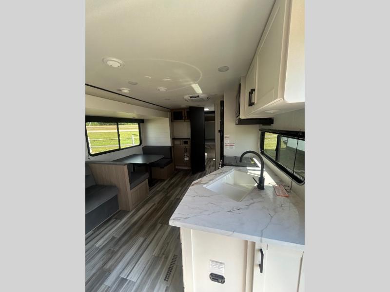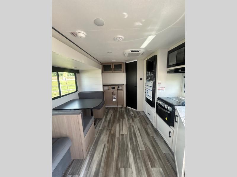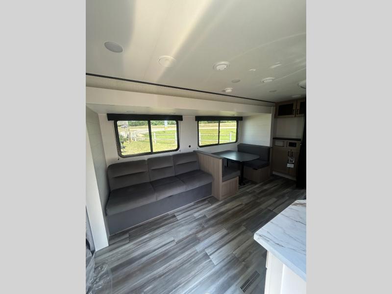 You can comfortably sleep up to six people in this trailer thanks to the RV queen bed in the front bedroom, plus the booth dinette and jack-knife sofa in the main living area! The chef of your crew will have a three burner cooktop and microwave oven to prepare meals, and everyone can store their favorite drinks in the 8 cu. ft. 12V refrigerator. The walk-through bath is spacious and includes a radius shower, toilet, a sink, and linen closet and is the full width of the unit. The outside storage will let you bring along camp chairs and games, fishing poles and more, plus the 18' 3" power awning with LED lights will create a nice place to gather in the evenings!