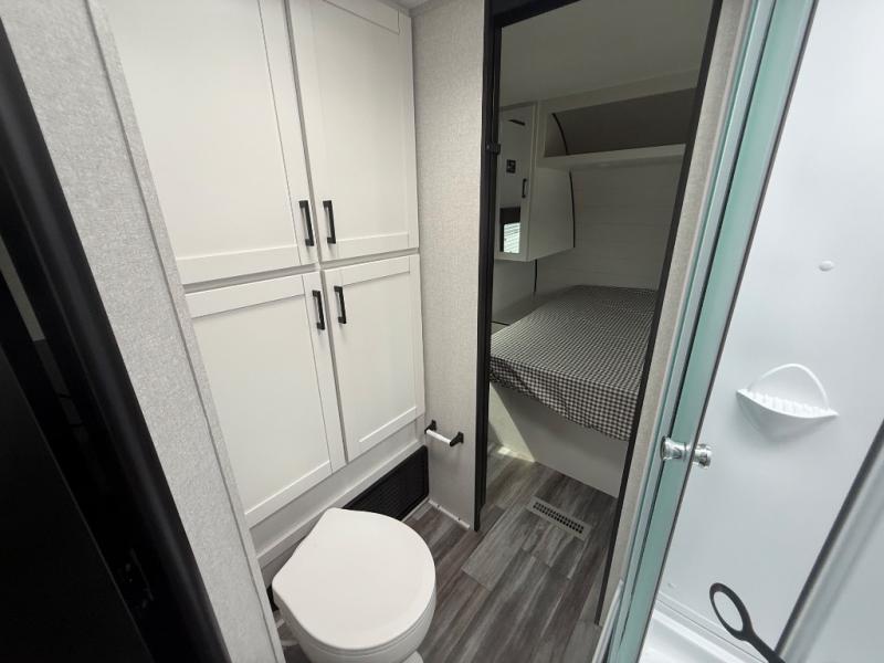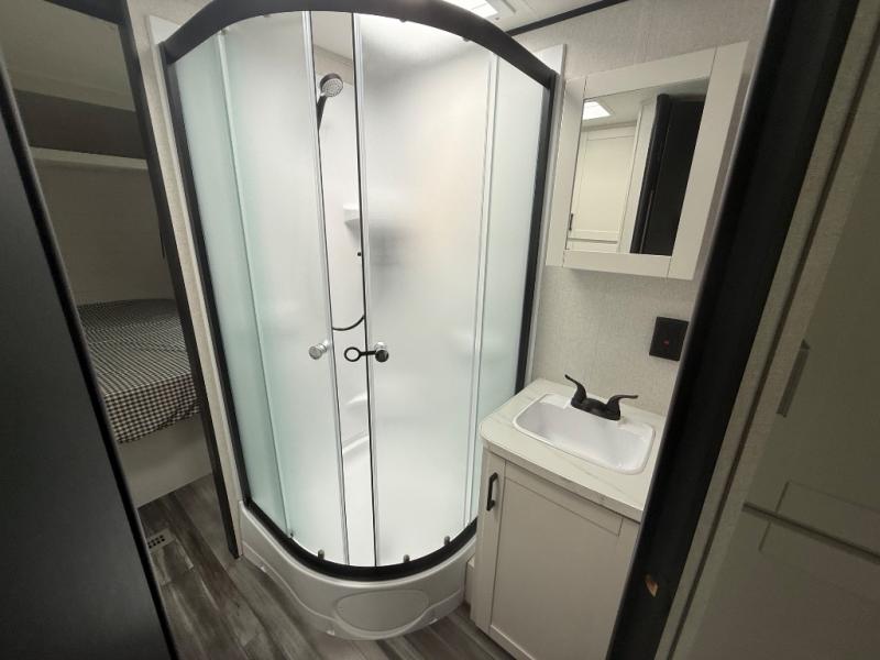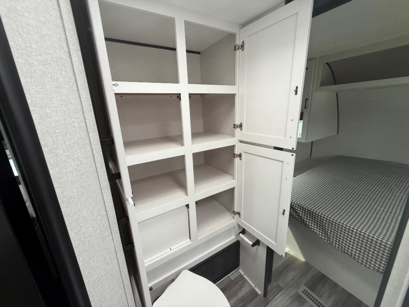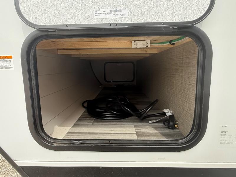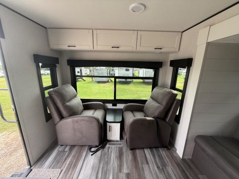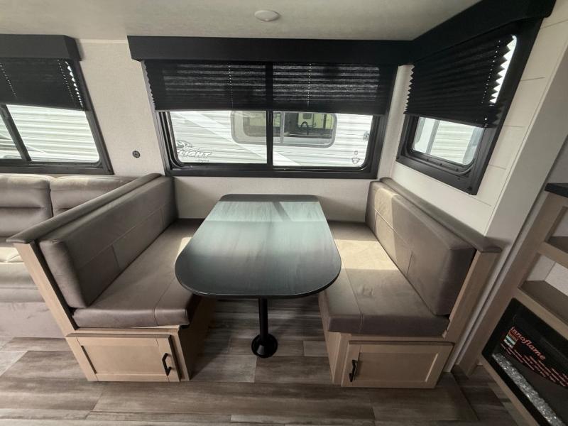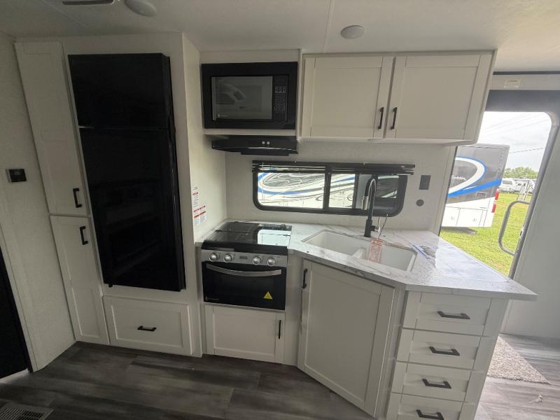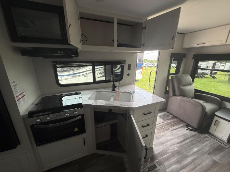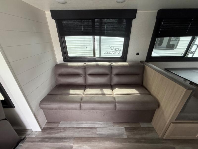 You can comfortably sleep up to six people in this trailer thanks to the RV queen bed in the front bedroom, plus the booth dinette and jack-knife sofa in the main living area! The chef of your crew will have a three burner cooktop and microwave oven to prepare meals, and everyone can store their favorite drinks in the 8 cu. ft. 12V refrigerator. The walk-through bath is spacious and includes a radius shower, toilet, a sink, and linen closet and is the full width of the unit. The outside storage will let you bring along camp chairs and games, fishing poles and more, plus the 18' 3" power awning with LED lights will create a nice place to gather in the evenings!