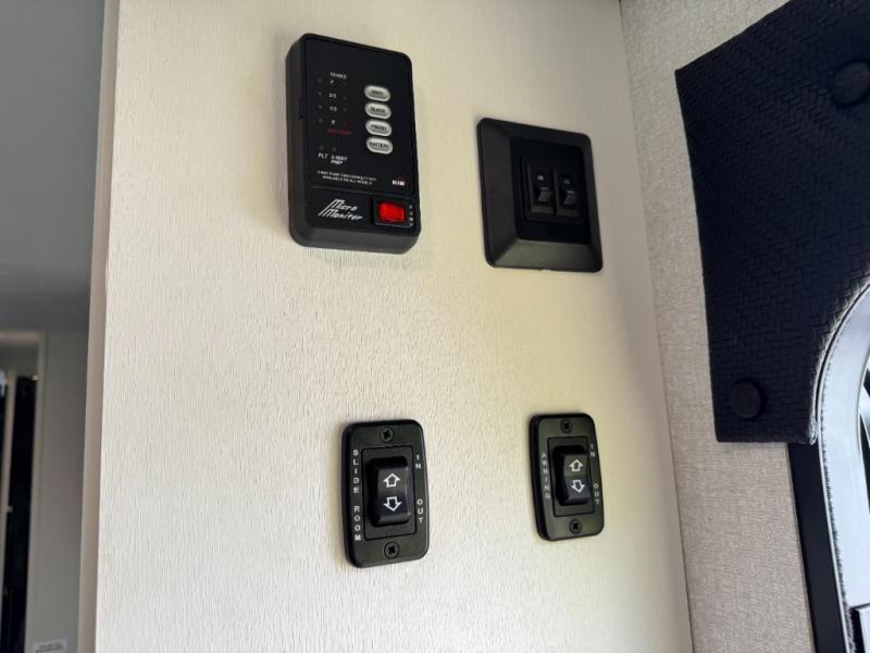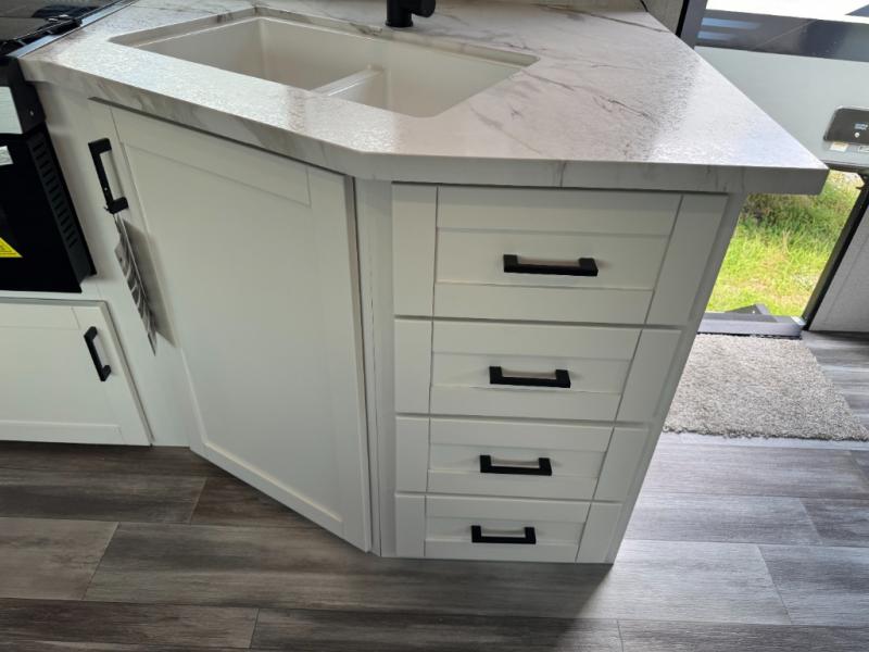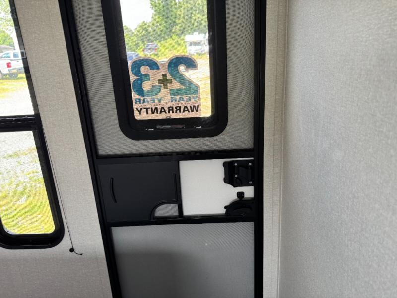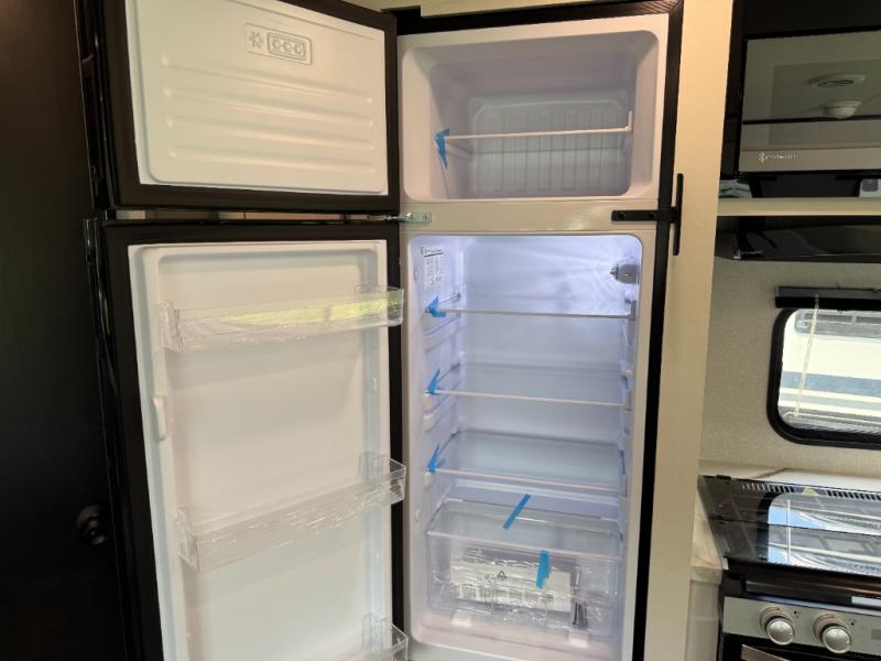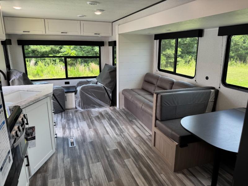 You can comfortably sleep up to six people in this trailer thanks to the RV queen bed in the front bedroom, plus the booth dinette and jack-knife sofa in the main living area! The chef of your crew will have a three burner cooktop and microwave oven to prepare meals, and everyone can store their favorite drinks in the 8 cu. ft. 12V refrigerator. The walk-through bath is spacious and includes a radius shower, toilet, a sink, and linen closet and is the full width of the unit. The outside storage will let you bring along camp chairs and games, fishing poles and more, plus the 18' 3" power awning with LED lights will create a nice place to gather in the evenings!