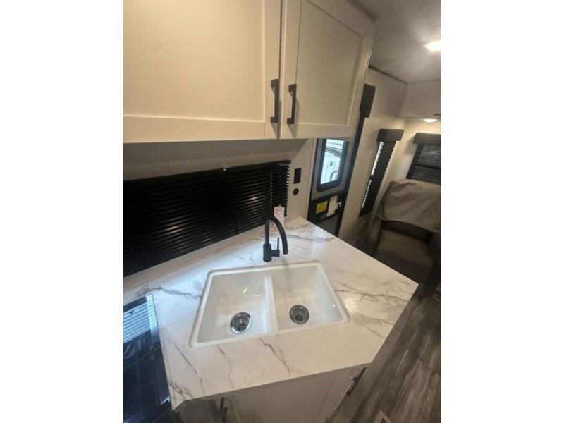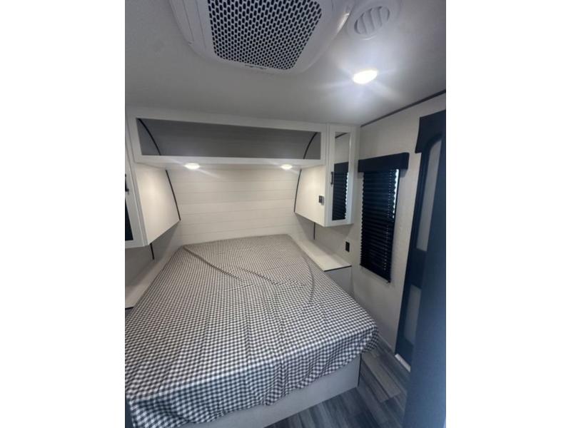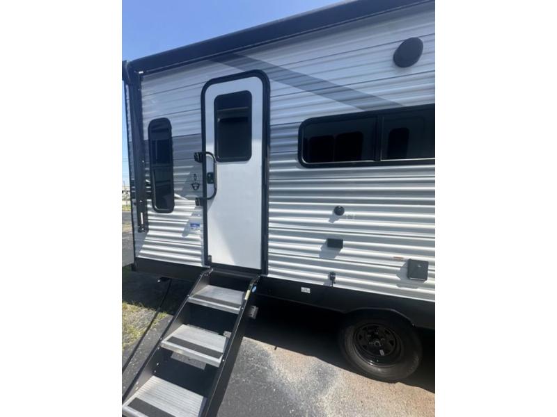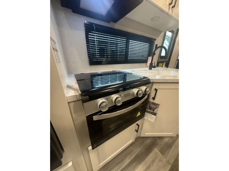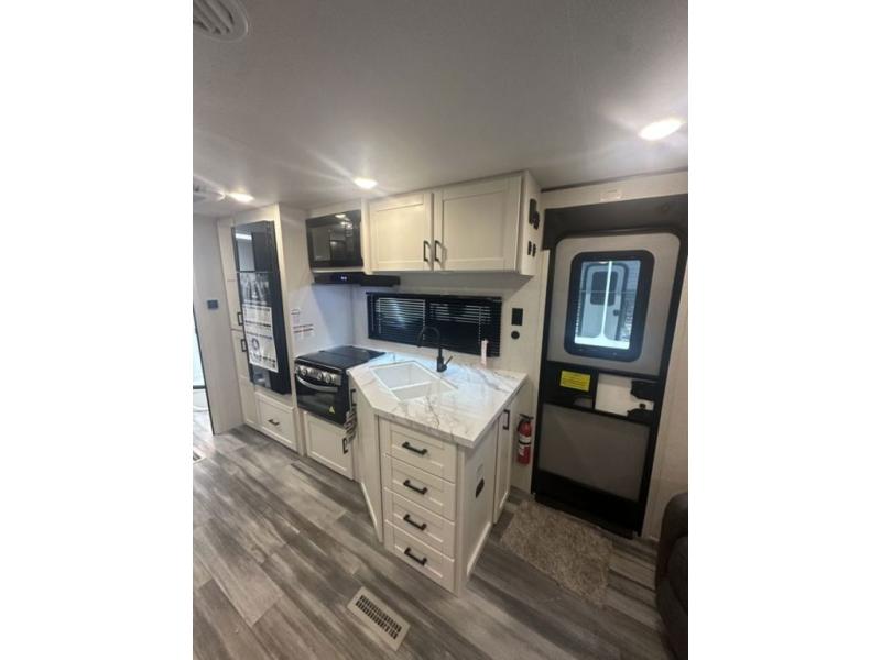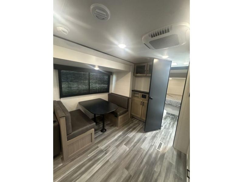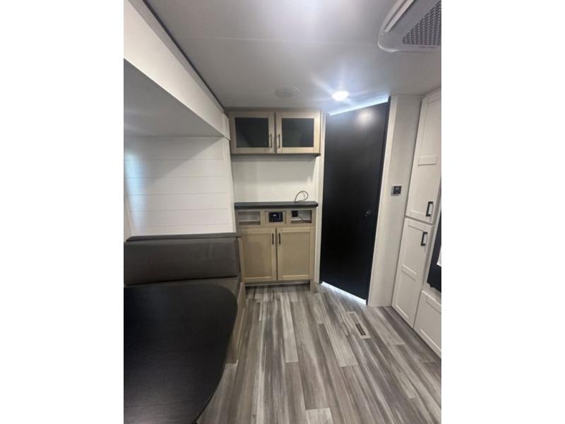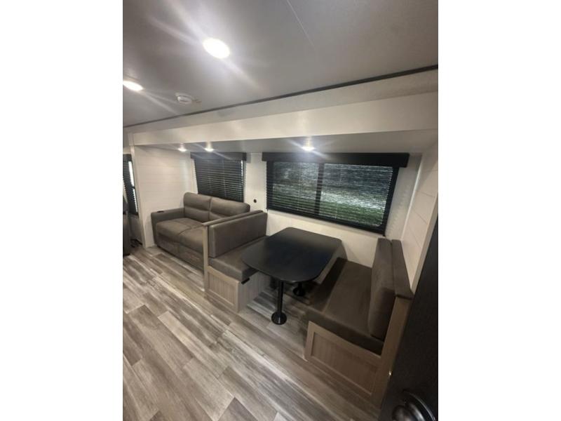 You can comfortably sleep up to six people in this trailer thanks to the RV queen bed in the front bedroom, plus the booth dinette and jack-knife sofa in the main living area! The chef of your crew will have a three burner cooktop and microwave oven to prepare meals, and everyone can store their favorite drinks in the 8 cu. ft. 12V refrigerator. The walk-through bath is spacious and includes a radius shower, toilet, a sink, and linen closet and is the full width of the unit. The outside storage will let you bring along camp chairs and games, fishing poles and more, plus the 18' 3" power awning with LED lights will create a nice place to gather in the evenings!