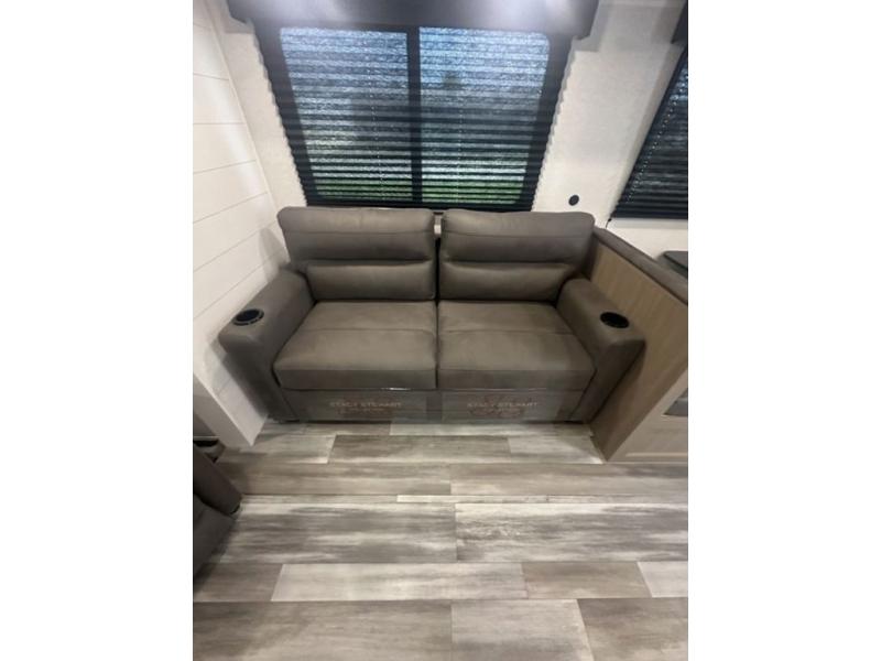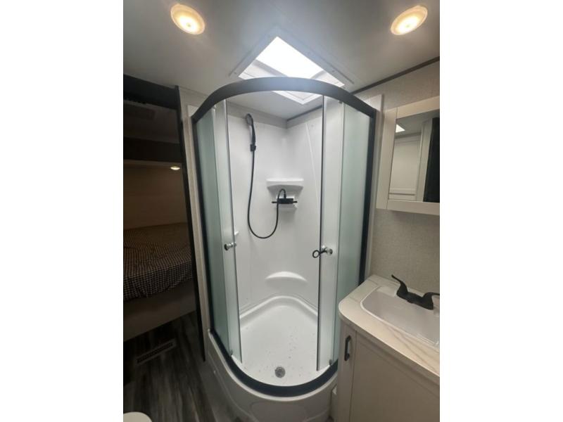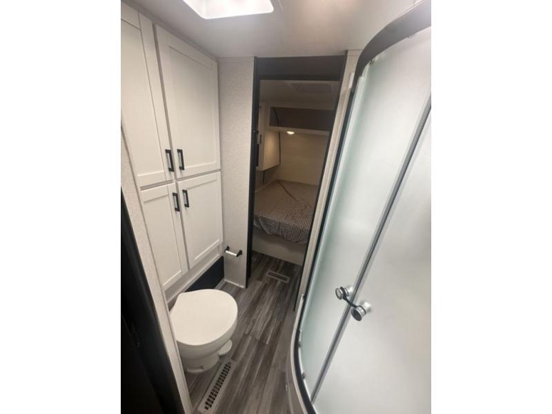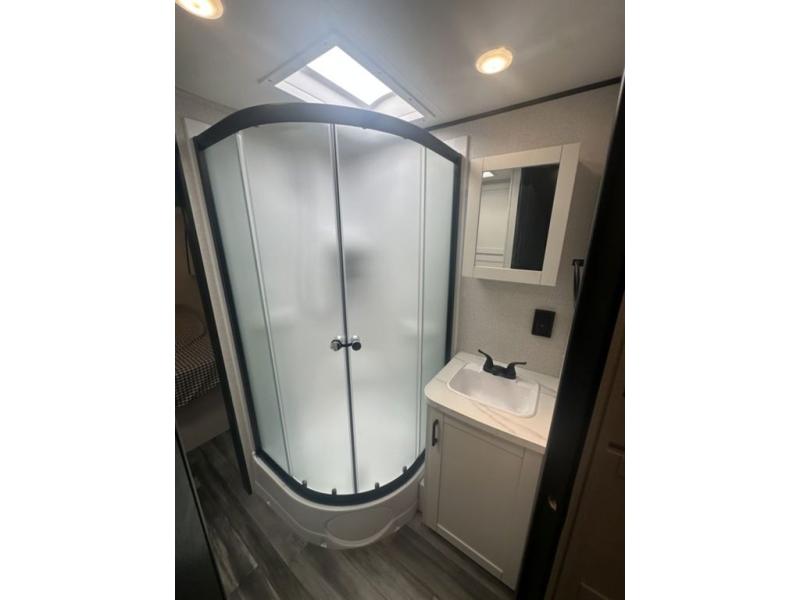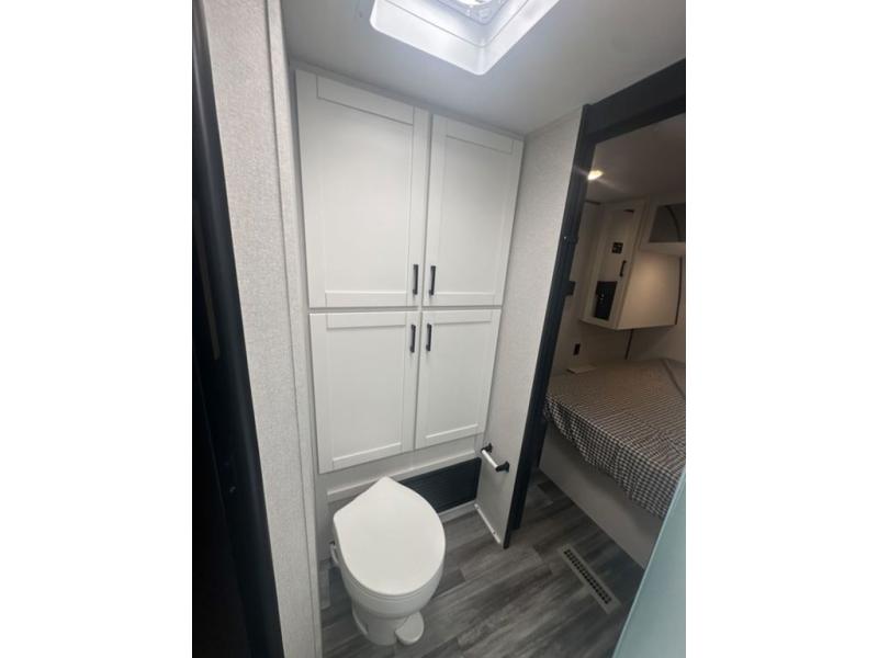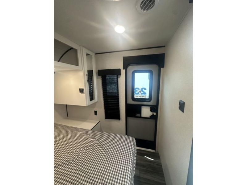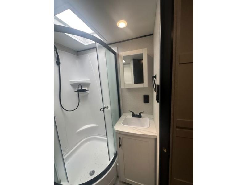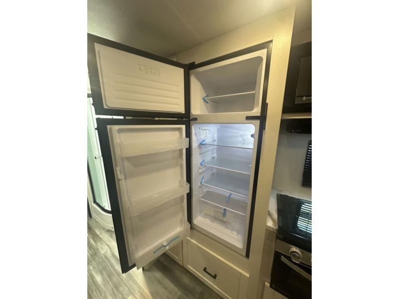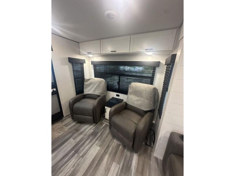 You can comfortably sleep up to six people in this trailer thanks to the RV queen bed in the front bedroom, plus the booth dinette and jack-knife sofa in the main living area! The chef of your crew will have a three burner cooktop and microwave oven to prepare meals, and everyone can store their favorite drinks in the 8 cu. ft. 12V refrigerator. The walk-through bath is spacious and includes a radius shower, toilet, a sink, and linen closet and is the full width of the unit. The outside storage will let you bring along camp chairs and games, fishing poles and more, plus the 18' 3" power awning with LED lights will create a nice place to gather in the evenings!