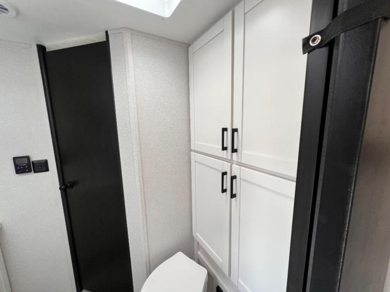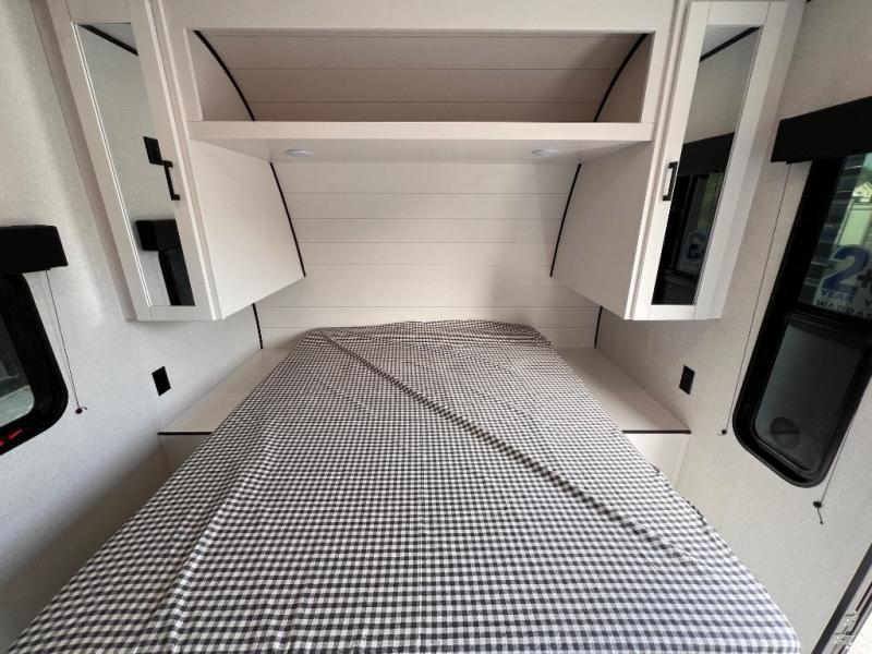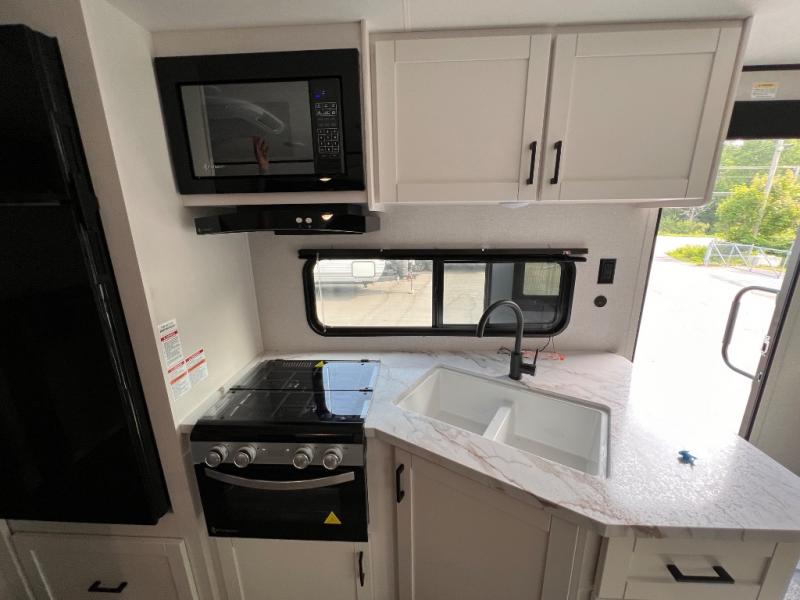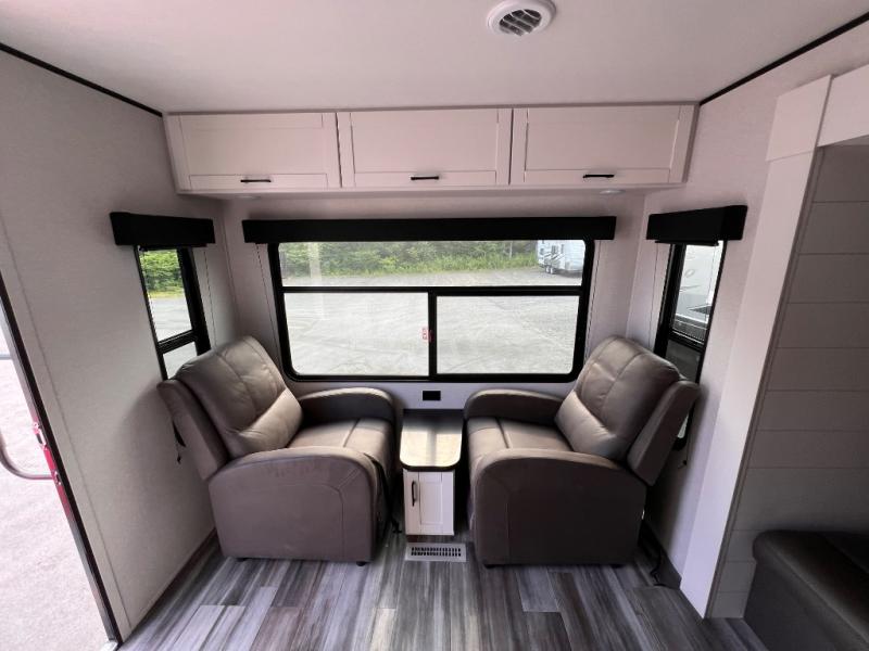 You can comfortably sleep up to six people in this trailer thanks to the RV queen bed in the front bedroom, plus the booth dinette and jack-knife sofa in the main living area! The chef of your crew will have a three burner cooktop and microwave oven to prepare meals, and everyone can store their favorite drinks in the 8 cu. ft. 12V refrigerator. The walk-through bath is spacious and includes a radius shower, toilet, a sink, and linen closet and is the full width of the unit. The outside storage will let you bring along camp chairs and games, fishing poles and more, plus the 18' 3" power awning with LED lights will create a nice place to gather in the evenings!