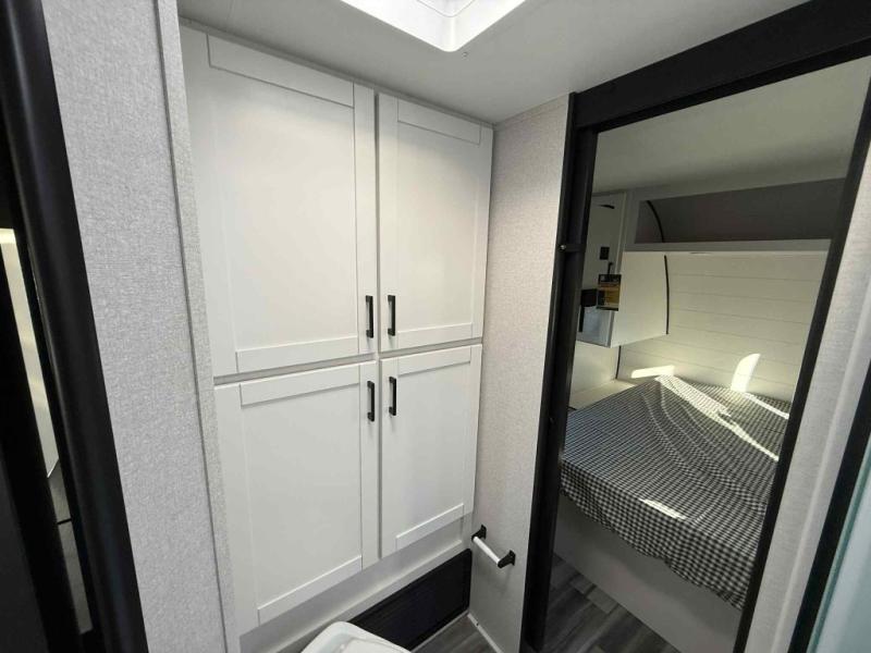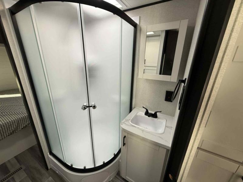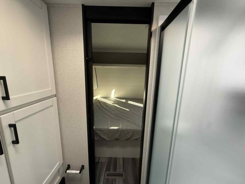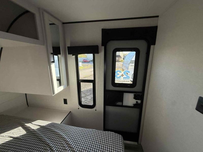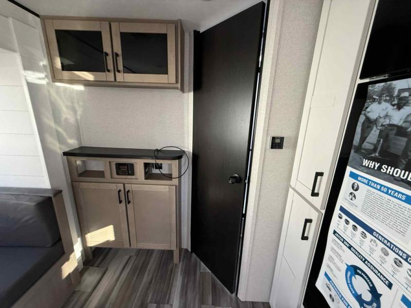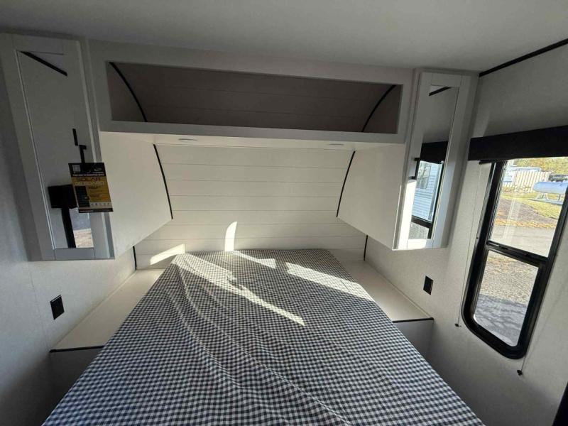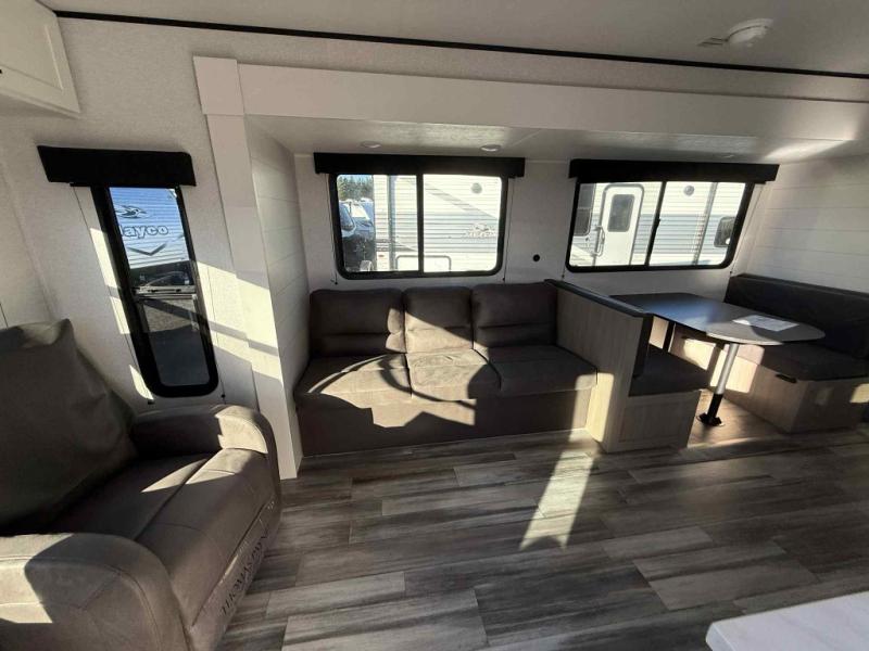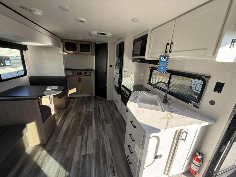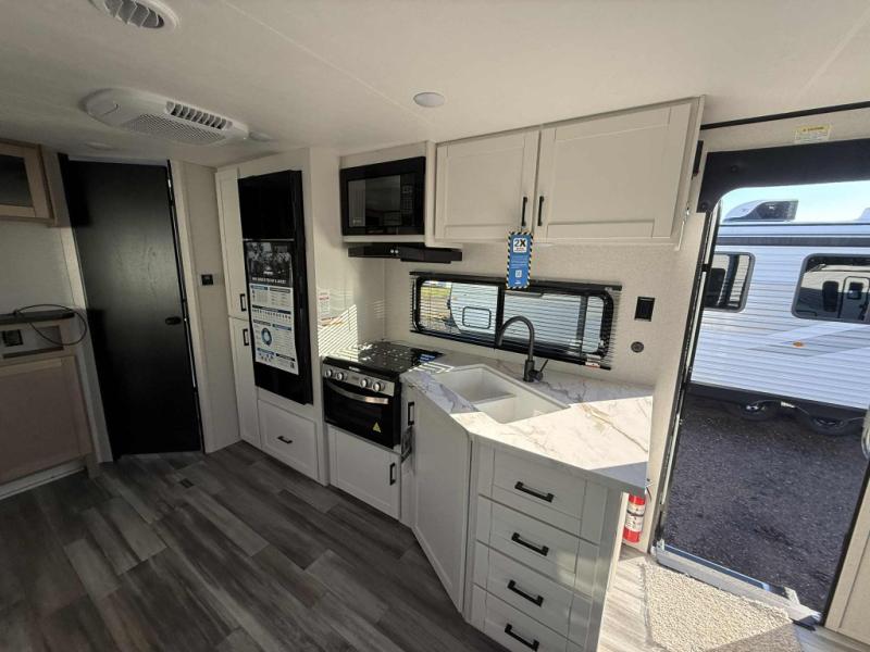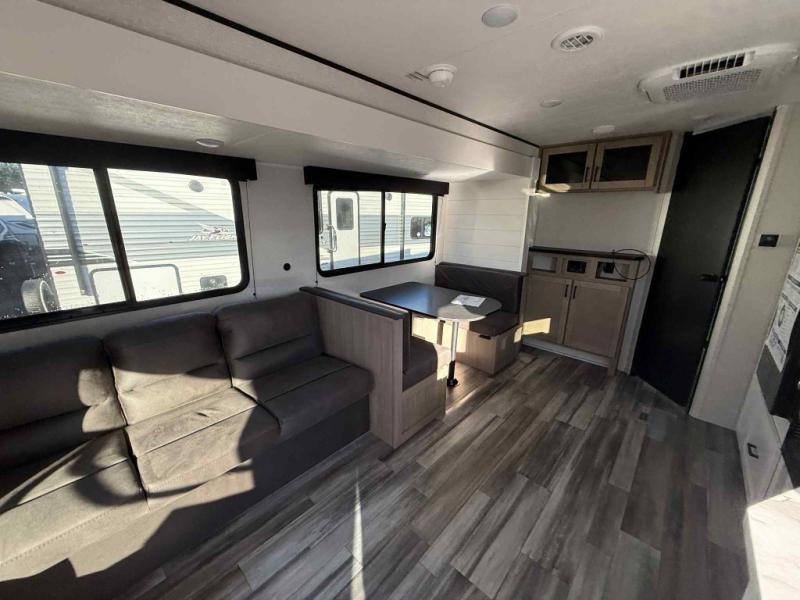 You can comfortably sleep up to six people in this trailer thanks to the RV queen bed in the front bedroom, plus the booth dinette and jack-knife sofa in the main living area! The chef of your crew will have a three burner cooktop and microwave oven to prepare meals, and everyone can store their favorite drinks in the 8 cu. ft. 12V refrigerator. The walk-through bath is spacious and includes a radius shower, toilet, a sink, and linen closet and is the full width of the unit. The outside storage will let you bring along camp chairs and games, fishing poles and more, plus the 18' 3" power awning with LED lights will create a nice place to gather in the evenings!