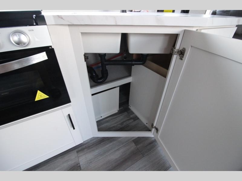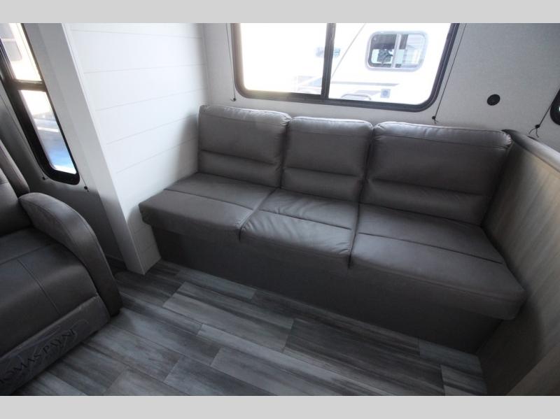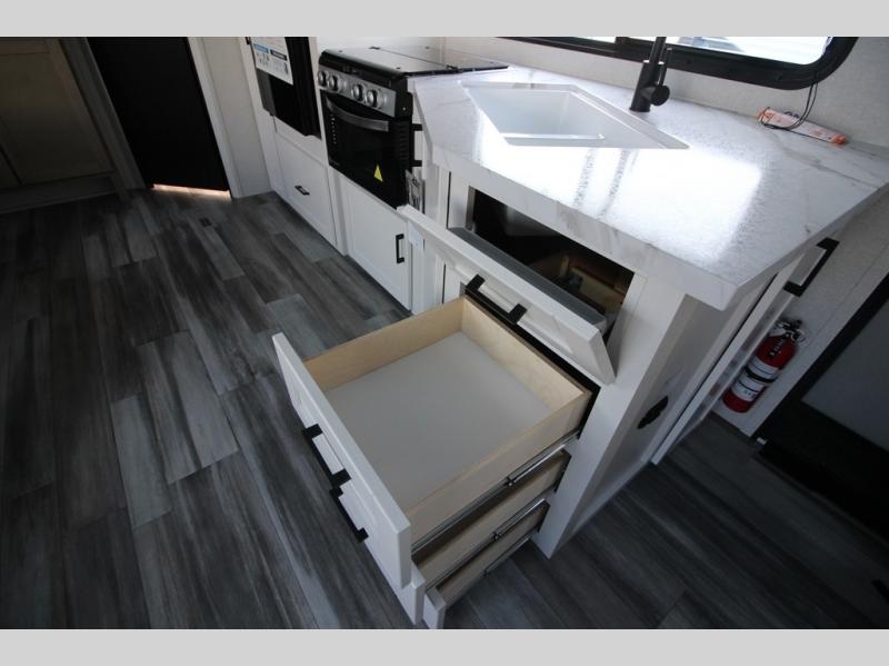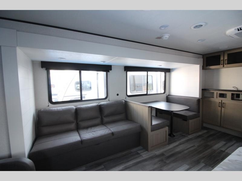 You can comfortably sleep up to six people in this trailer thanks to the RV queen bed in the front bedroom, plus the booth dinette and jack-knife sofa in the main living area! The chef of your crew will have a three burner cooktop and microwave oven to prepare meals, and everyone can store their favorite drinks in the 8 cu. ft. 12V refrigerator. The walk-through bath is spacious and includes a radius shower, toilet, a sink, and linen closet and is the full width of the unit. The outside storage will let you bring along camp chairs and games, fishing poles and more, plus the 18' 3" power awning with LED lights will create a nice place to gather in the evenings!