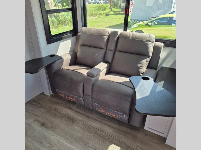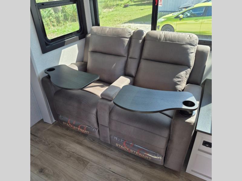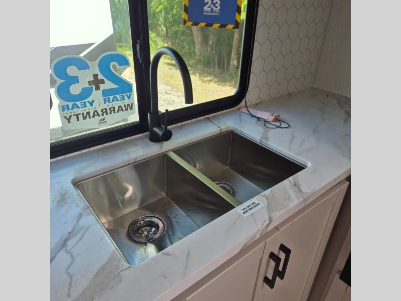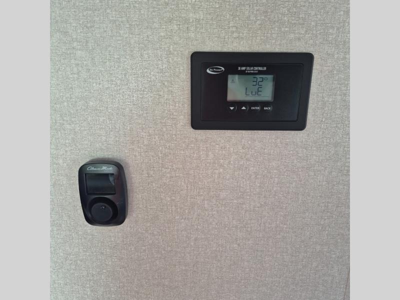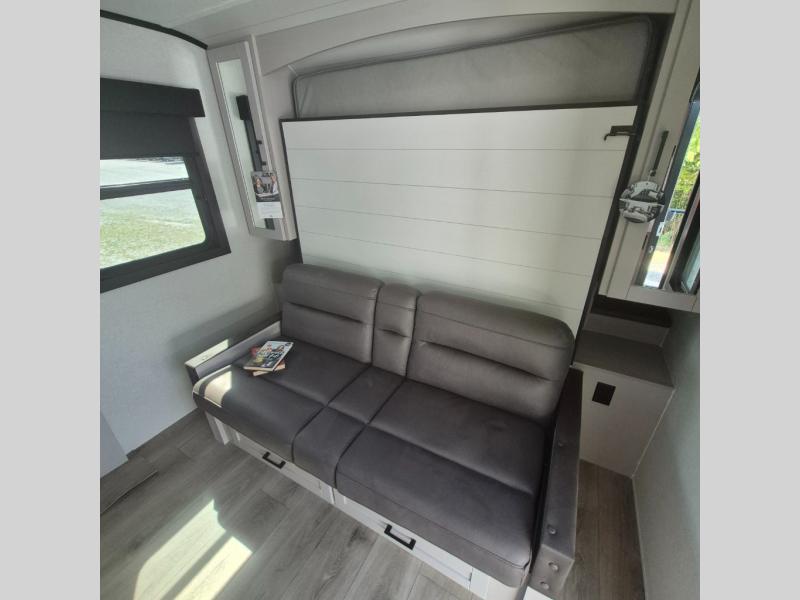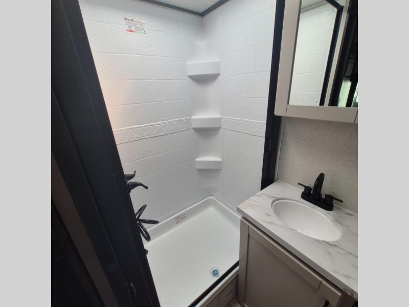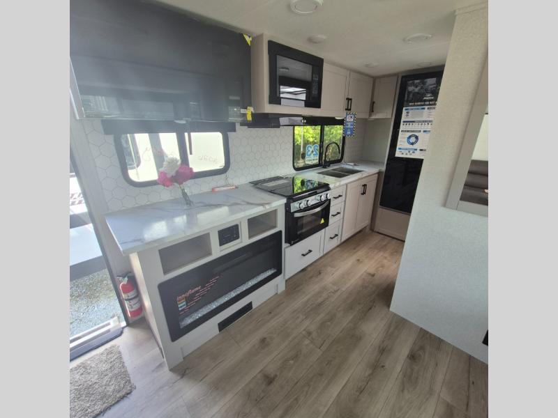 You can comfortably sleep up to six people in this trailer thanks to the RV queen bed in the front bedroom, plus the booth dinette and jack-knife sofa in the main living area! The chef of your crew will have a three burner cooktop and microwave oven to prepare meals, and everyone can store their favorite drinks in the 8 cu. ft. 12V refrigerator. The walk-through bath is spacious and includes a radius shower, toilet, a sink, and linen closet and is the full width of the unit. The outside storage will let you bring along camp chairs and games, fishing poles and more, plus the 18' 3" power awning with LED lights will create a nice place to gather in the evenings!