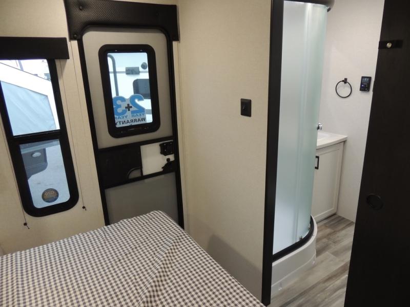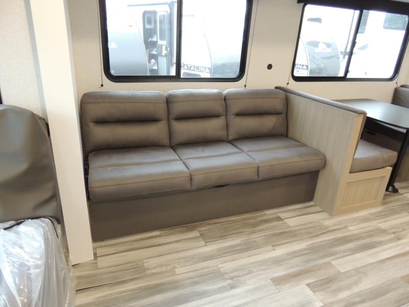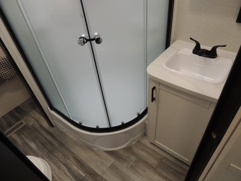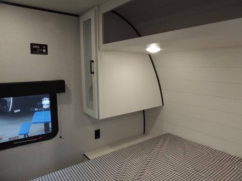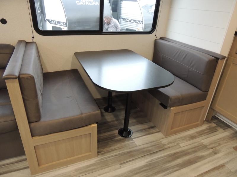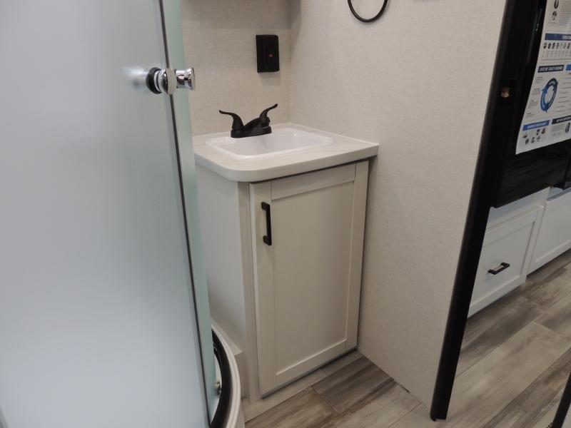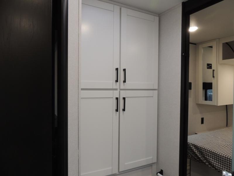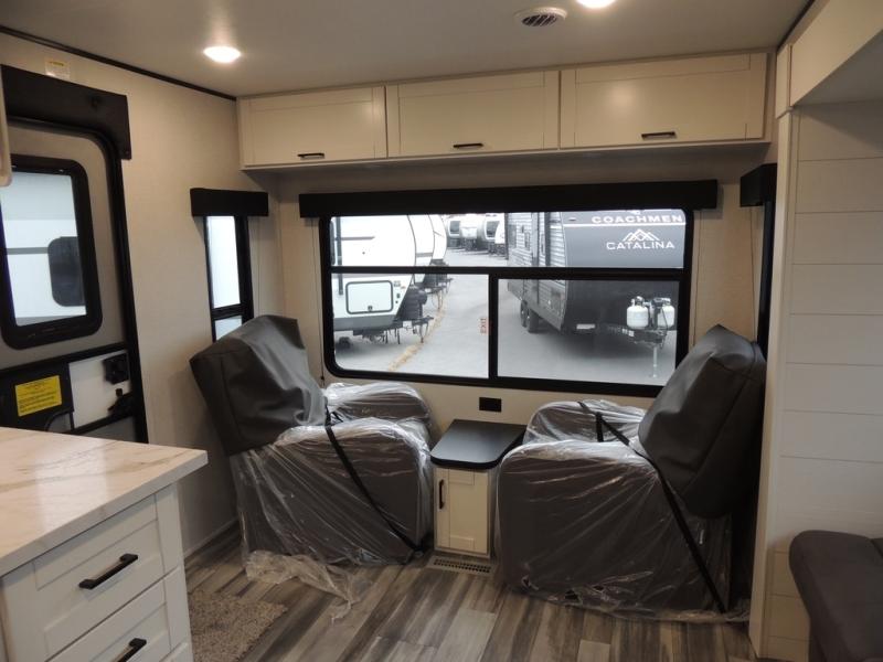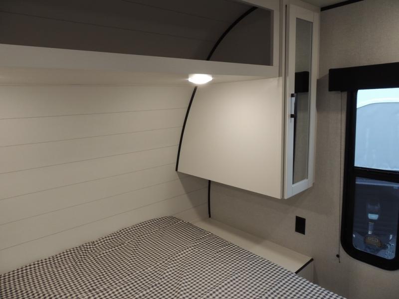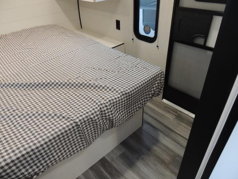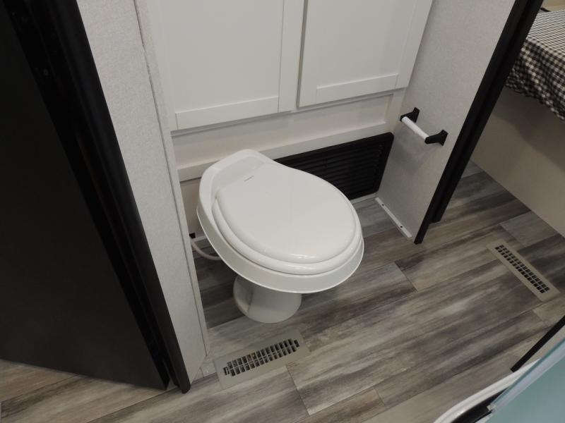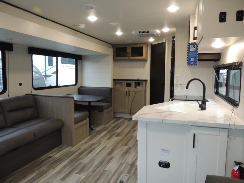 You can comfortably sleep up to six people in this trailer thanks to the RV queen bed in the front bedroom, plus the booth dinette and jack-knife sofa in the main living area! The chef of your crew will have a three burner cooktop and microwave oven to prepare meals, and everyone can store their favorite drinks in the 8 cu. ft. 12V refrigerator. The walk-through bath is spacious and includes a radius shower, toilet, a sink, and linen closet and is the full width of the unit. The outside storage will let you bring along camp chairs and games, fishing poles and more, plus the 18' 3" power awning with LED lights will create a nice place to gather in the evenings!