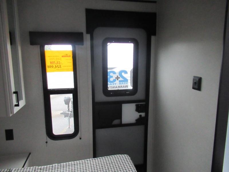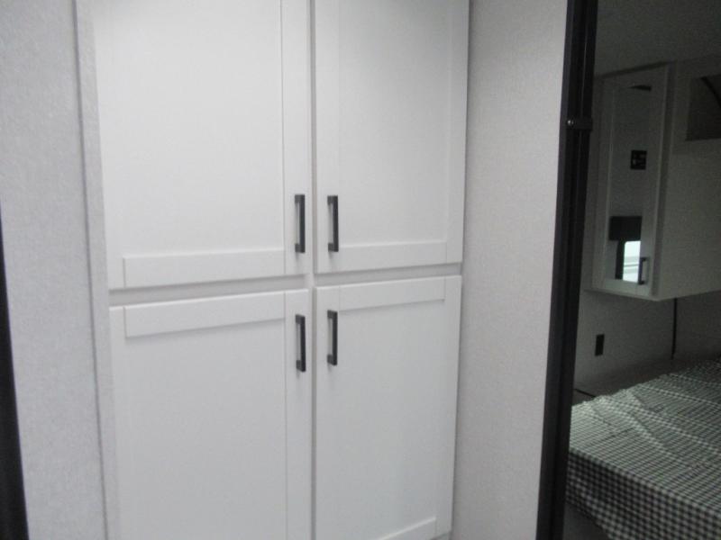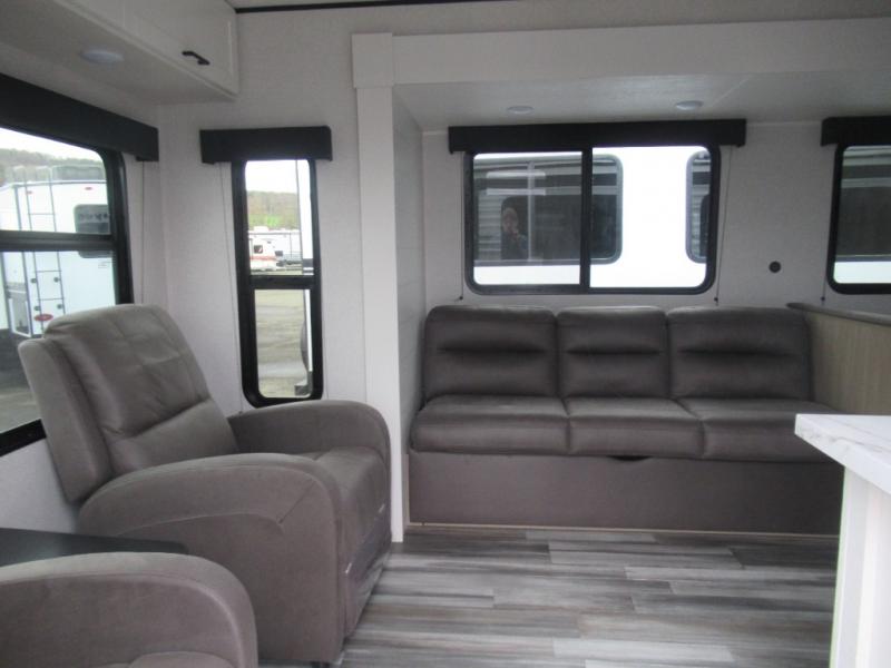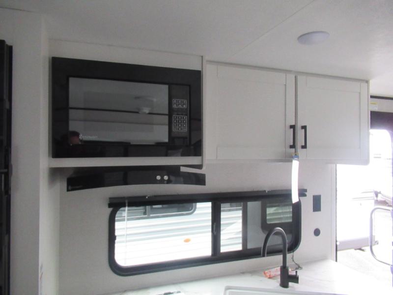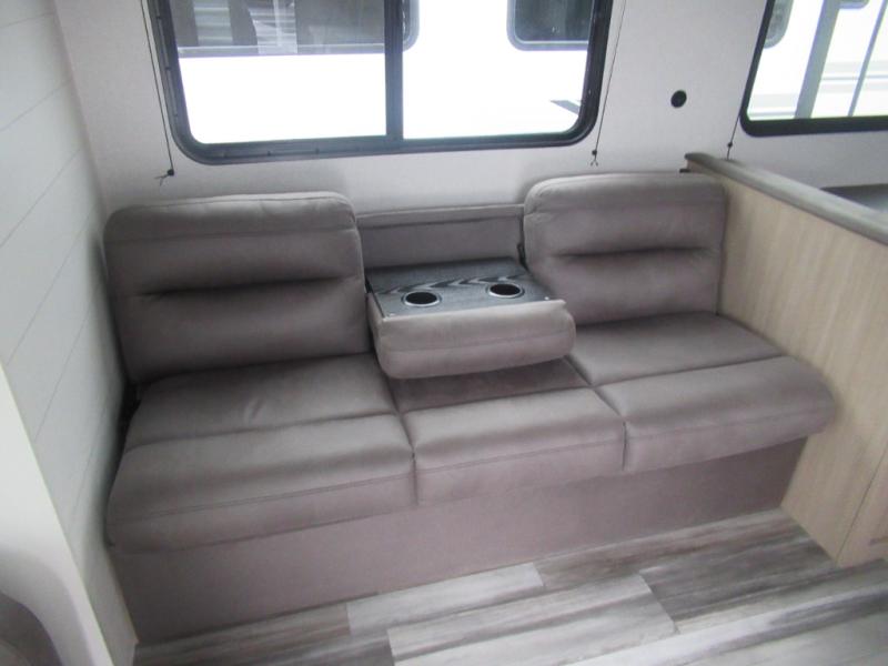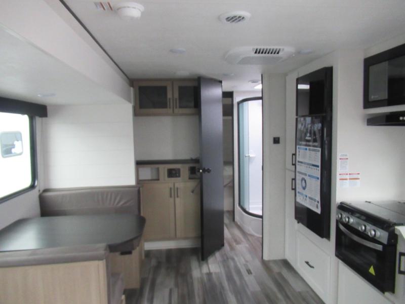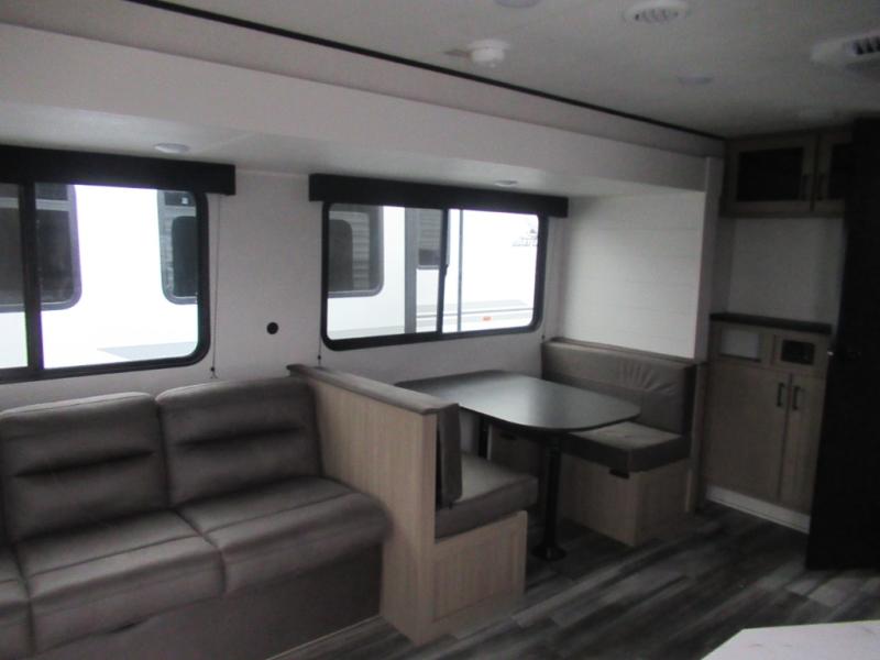 You can comfortably sleep up to six people in this trailer thanks to the RV queen bed in the front bedroom, plus the booth dinette and jack-knife sofa in the main living area! The chef of your crew will have a three burner cooktop and microwave oven to prepare meals, and everyone can store their favorite drinks in the 8 cu. ft. 12V refrigerator. The walk-through bath is spacious and includes a radius shower, toilet, a sink, and linen closet and is the full width of the unit. The outside storage will let you bring along camp chairs and games, fishing poles and more, plus the 18' 3" power awning with LED lights will create a nice place to gather in the evenings!
