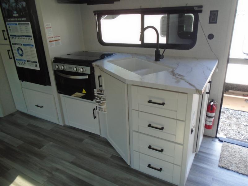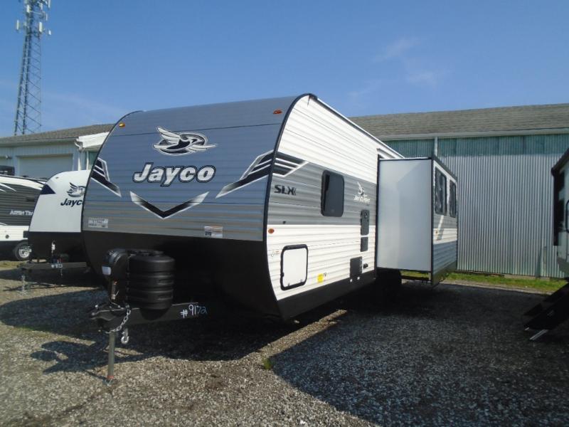 The Jayco Jay Flight SLX travel trailer is quite easy to own because it is lightweight for an easier towing experience. Built on a fully integrated A-frame with galvanized-steel, impact-resistant wheel wells, the Jay Flight SLX has quality at its very foundation. That quality continues on to the electric self-adjusting brakes, easy-lube hubs, Magnum Truss roof system, and LP quick connect. Some of what the mandatory Customer Value Package includes is backup camera prep, Keyed-Alike entry and baggage doors, and an on-demand tankless water heater.